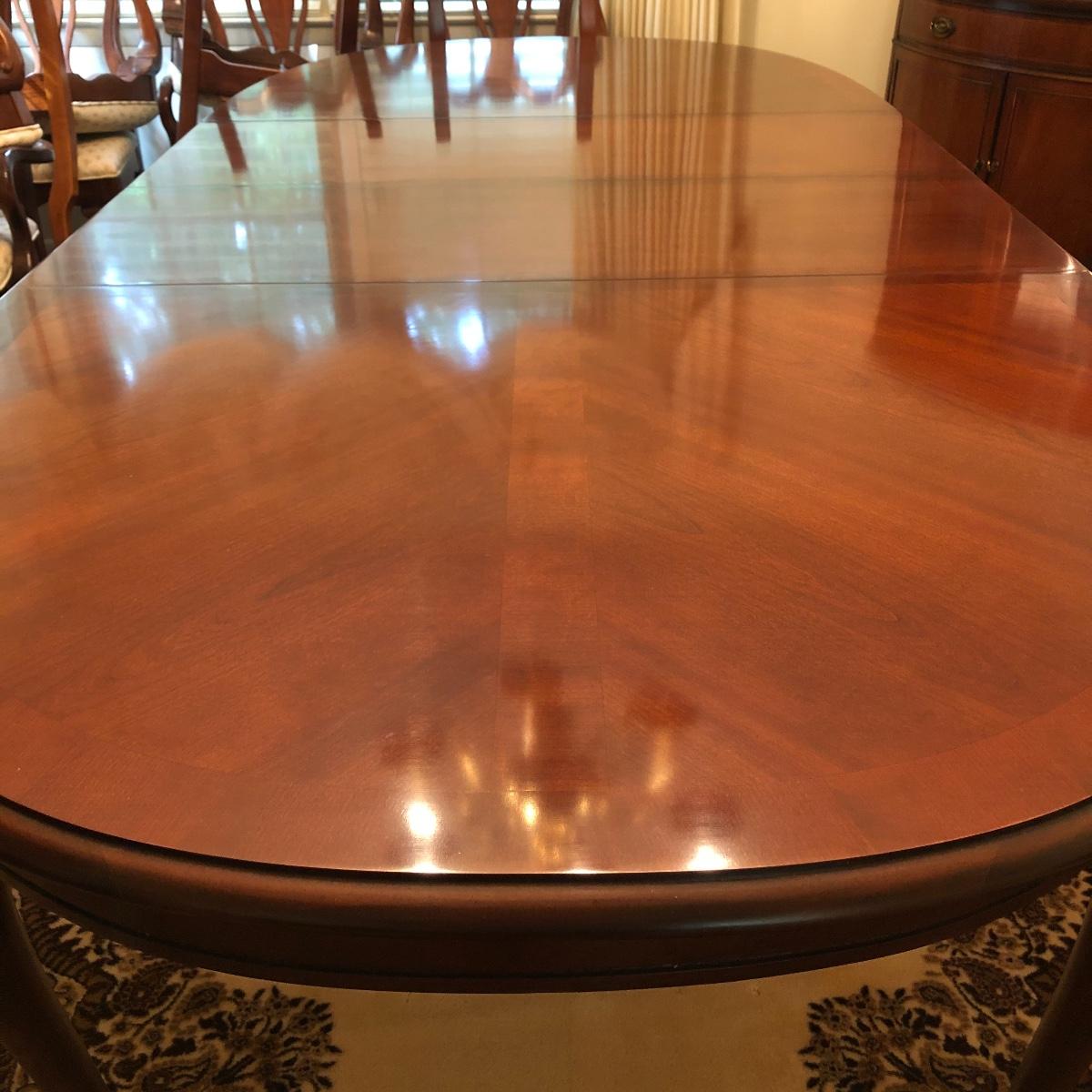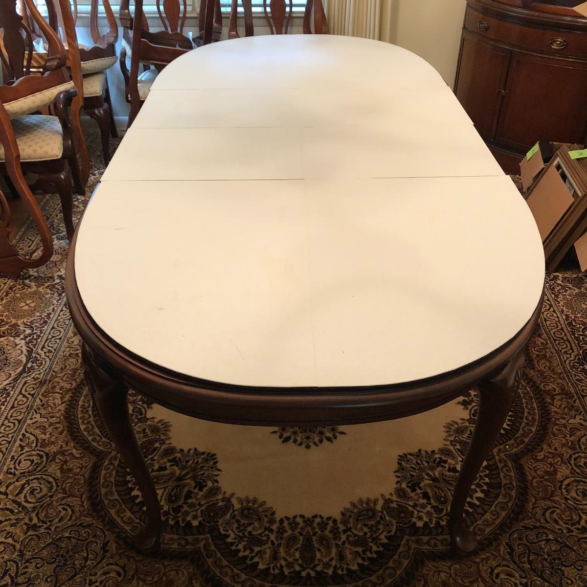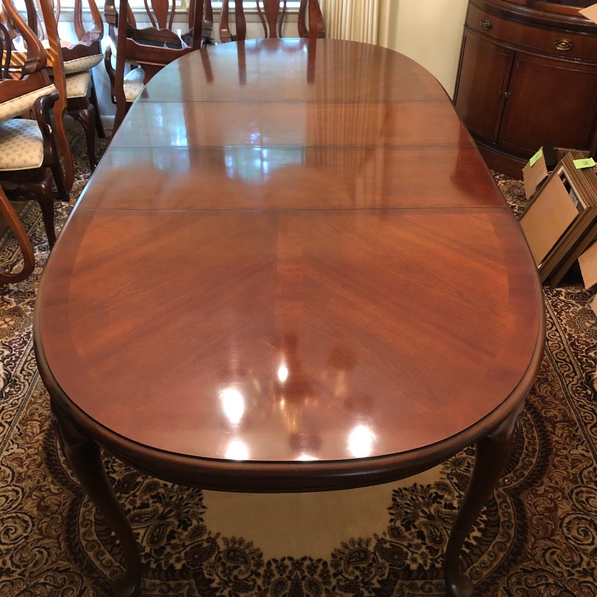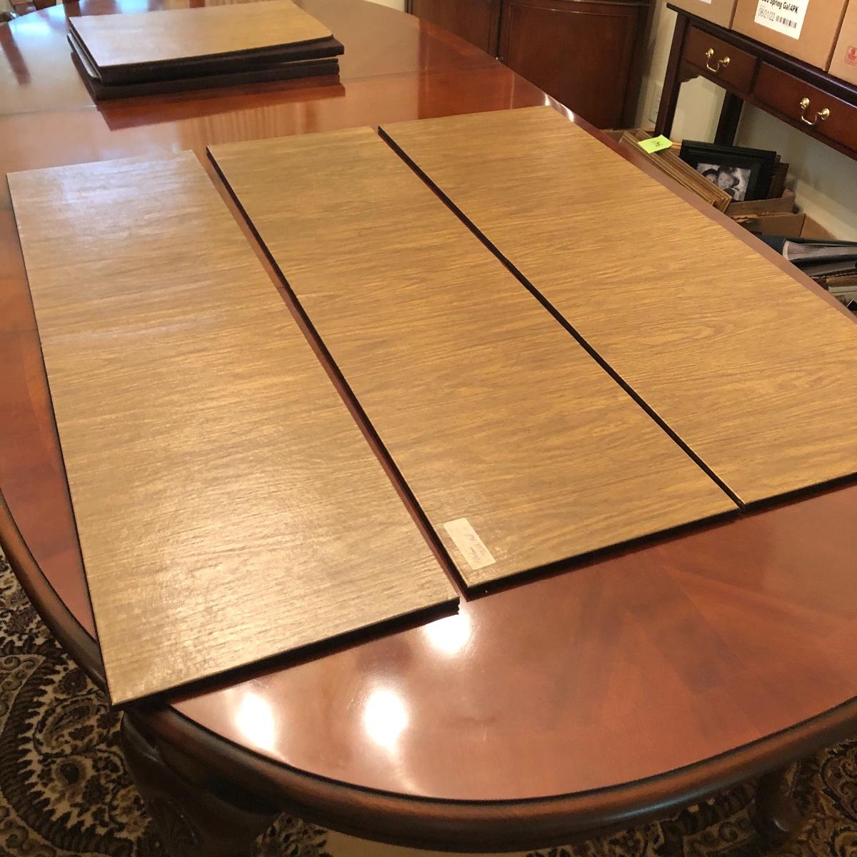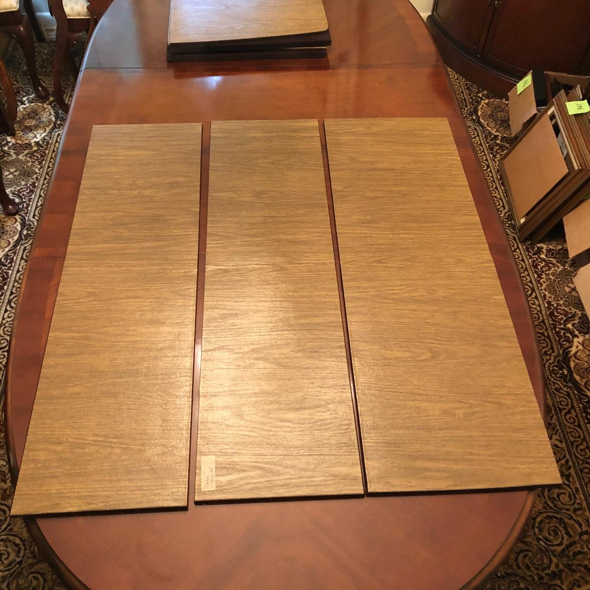 Ornate wood grain with stunning craftsmanship this dining table is great for at least six people dining. Currently measuring 93” x 43” x 29.5”. Removal of leaves decreases length by 15” each. We have 8 dining chairs that are perfect to go with this piece in Lot 185. The white table pads that were originally on this table, four total, are included alongside a spare set of six table pads. The second set of table pads have a wood grain texture and seem to be for a rectangular table. If you love games nights or gatherings, this table and protective pads are great for easy clean up and extra space!