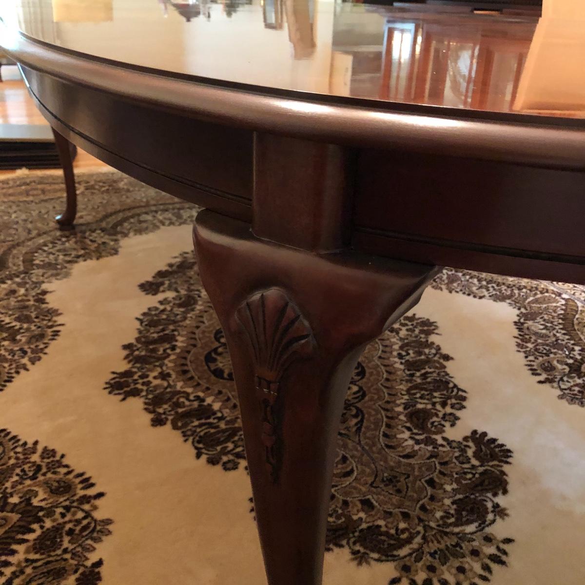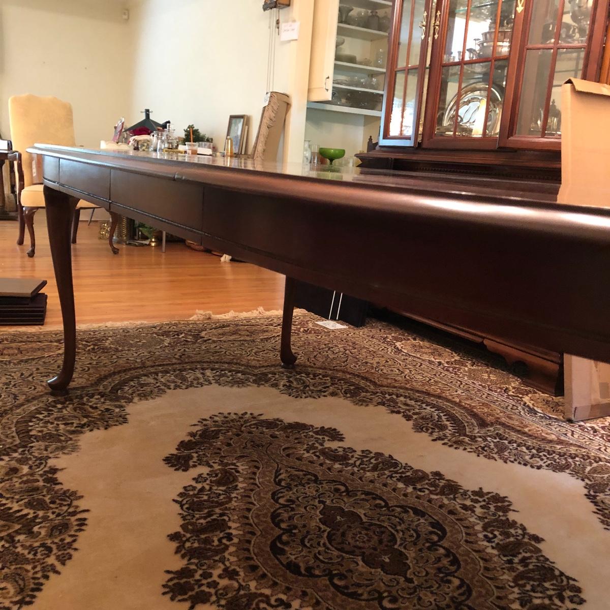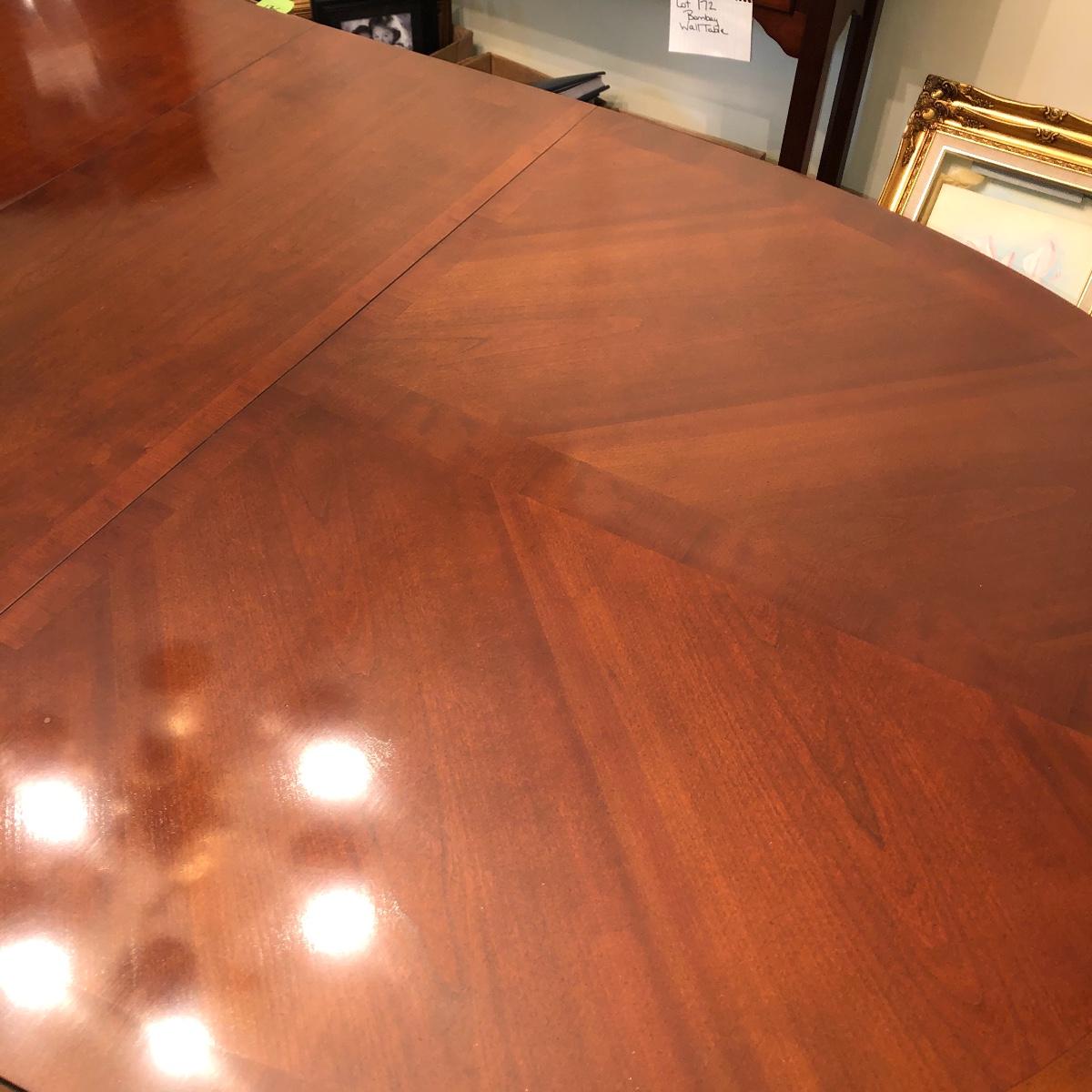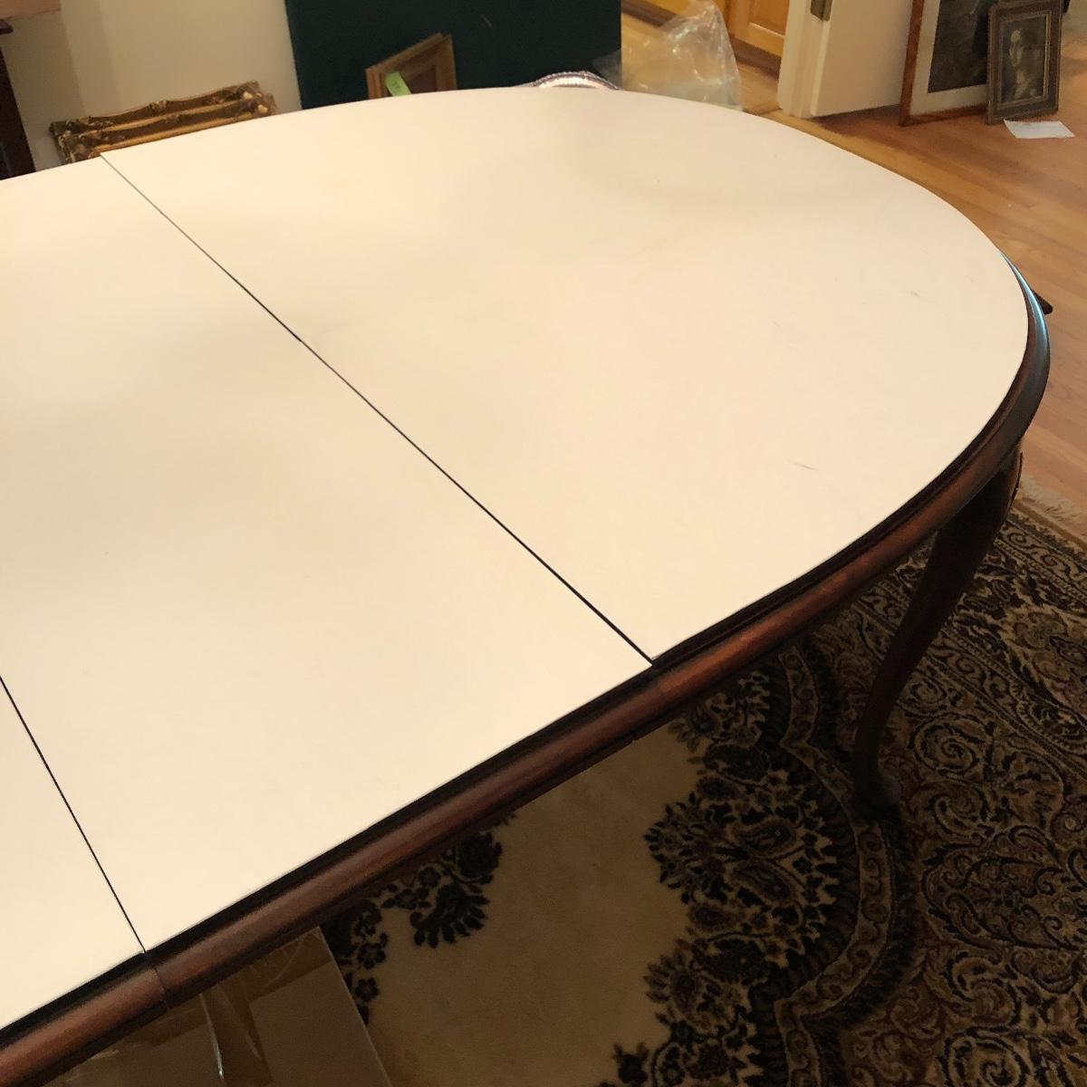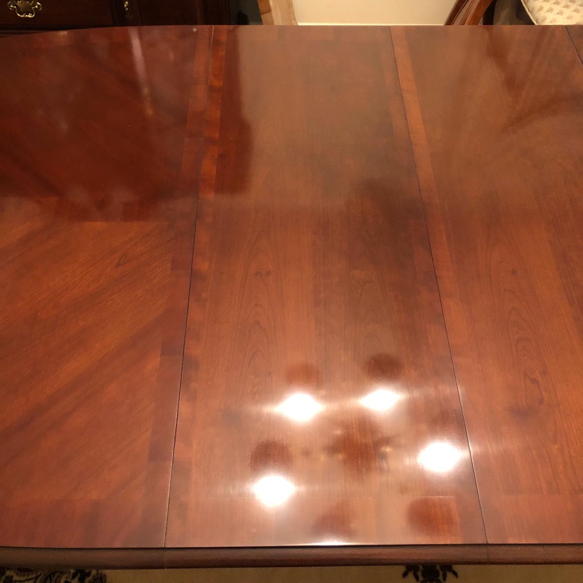 Ornate wood grain with stunning craftsmanship this dining table is great for at least six people dining. Currently measuring 93” x 43” x 29.5”. Removal of leaves decreases length by 15” each. We have 8 dining chairs that are perfect to go with this piece in Lot 185. The white table pads that were originally on this table, four total, are included alongside a spare set of six table pads. The second set of table pads have a wood grain texture and seem to be for a rectangular table. If you love games nights or gatherings, this table and protective pads are great for easy clean up and extra space!