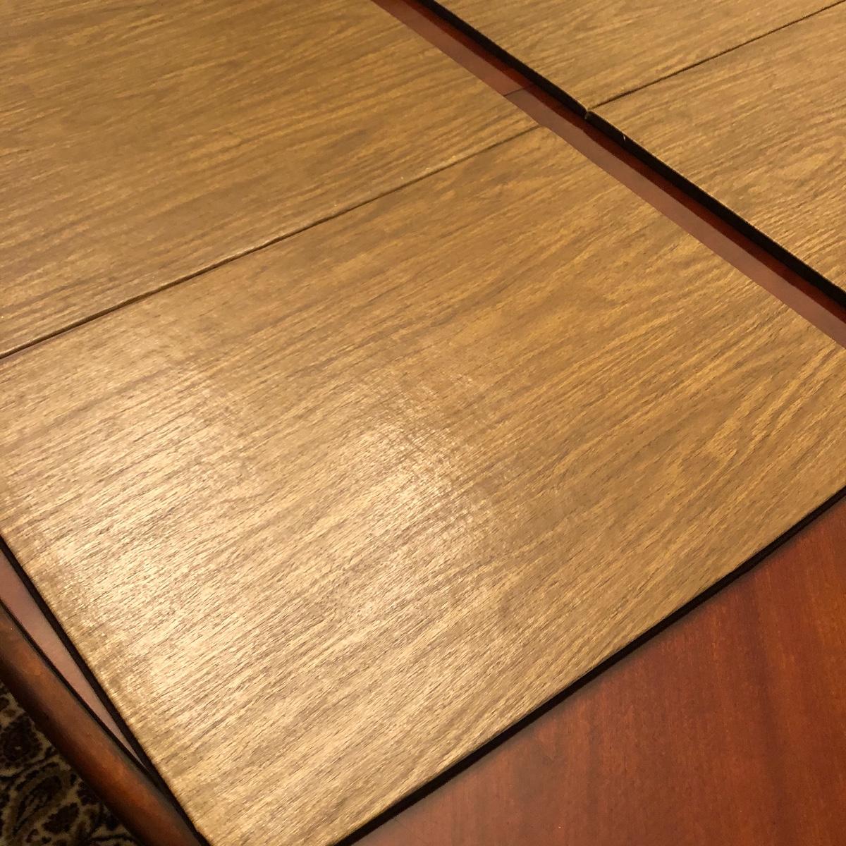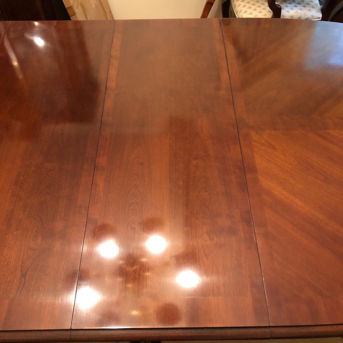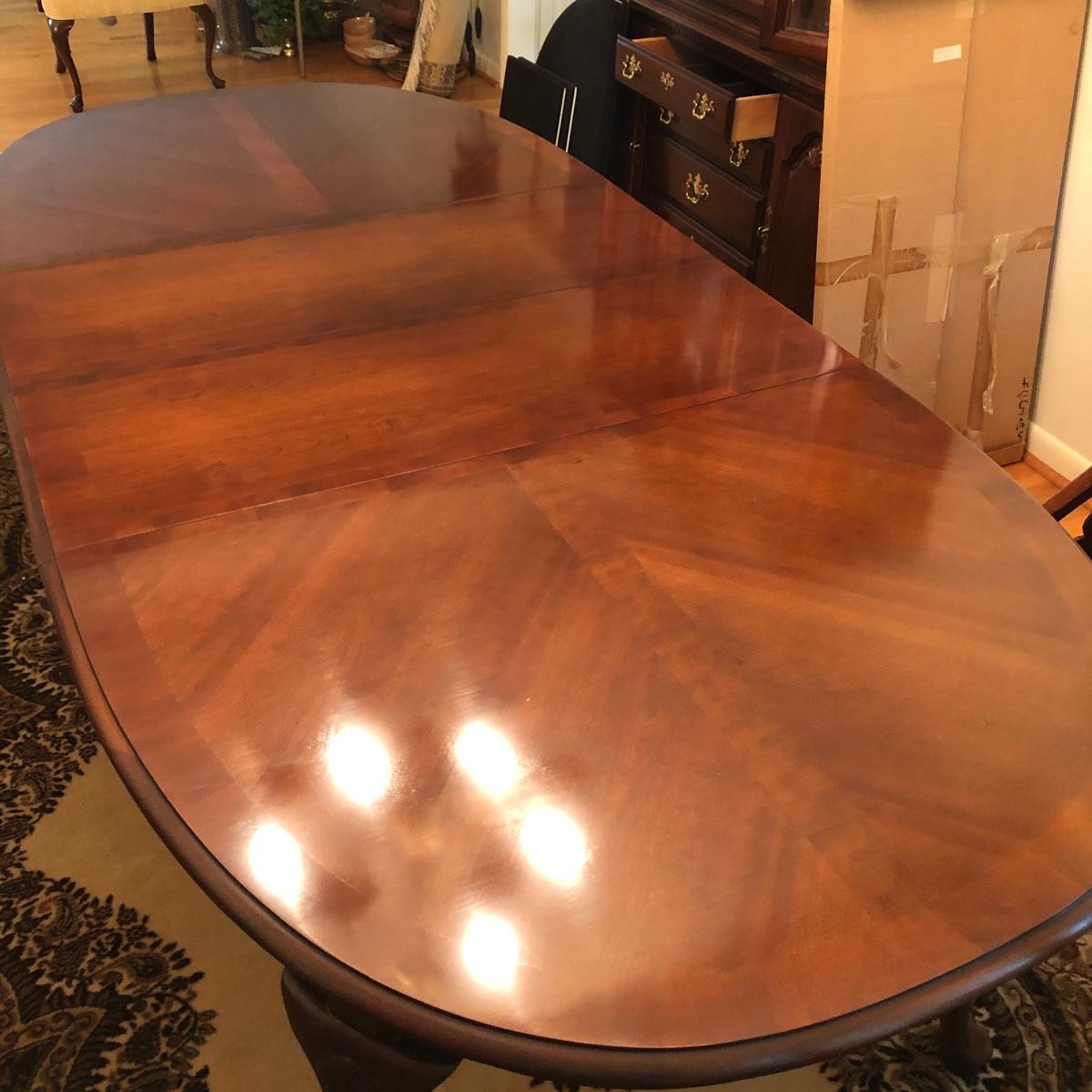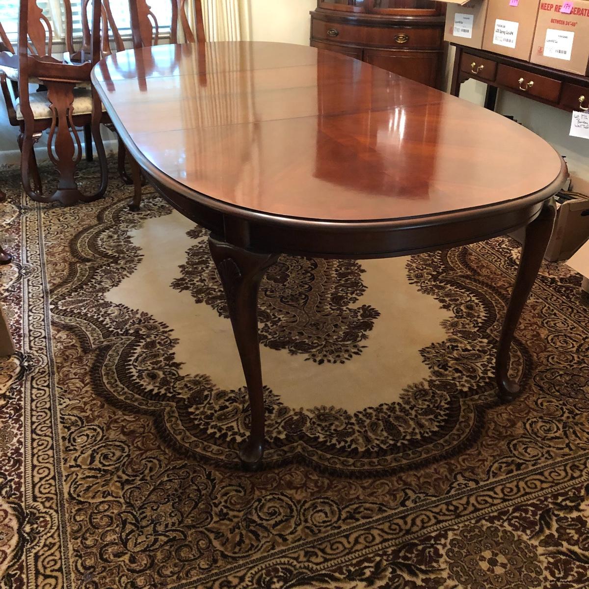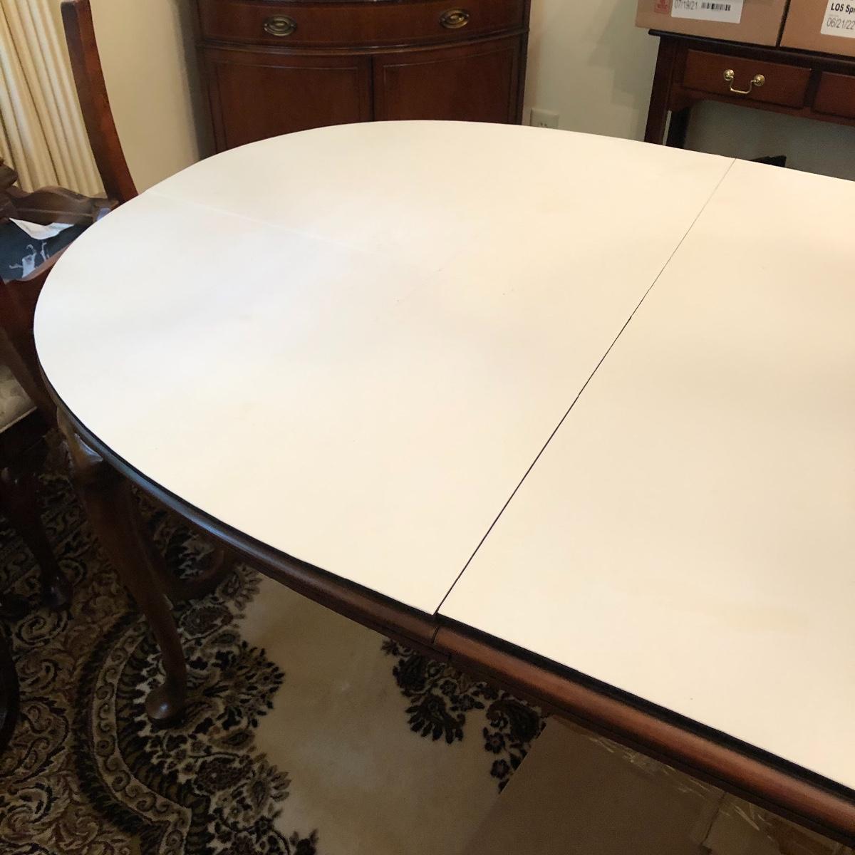 Ornate wood grain with stunning craftsmanship this dining table is great for at least six people dining. Currently measuring 93” x 43” x 29.5”. Removal of leaves decreases length by 15” each. We have 8 dining chairs that are perfect to go with this piece in Lot 185. The white table pads that were originally on this table, four total, are included alongside a spare set of six table pads. The second set of table pads have a wood grain texture and seem to be for a rectangular table. If you love games nights or gatherings, this table and protective pads are great for easy clean up and extra space!