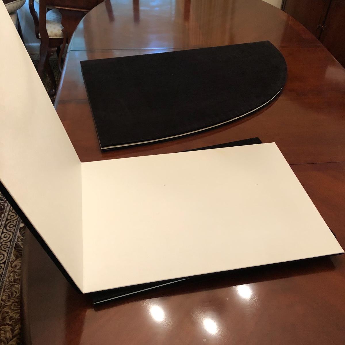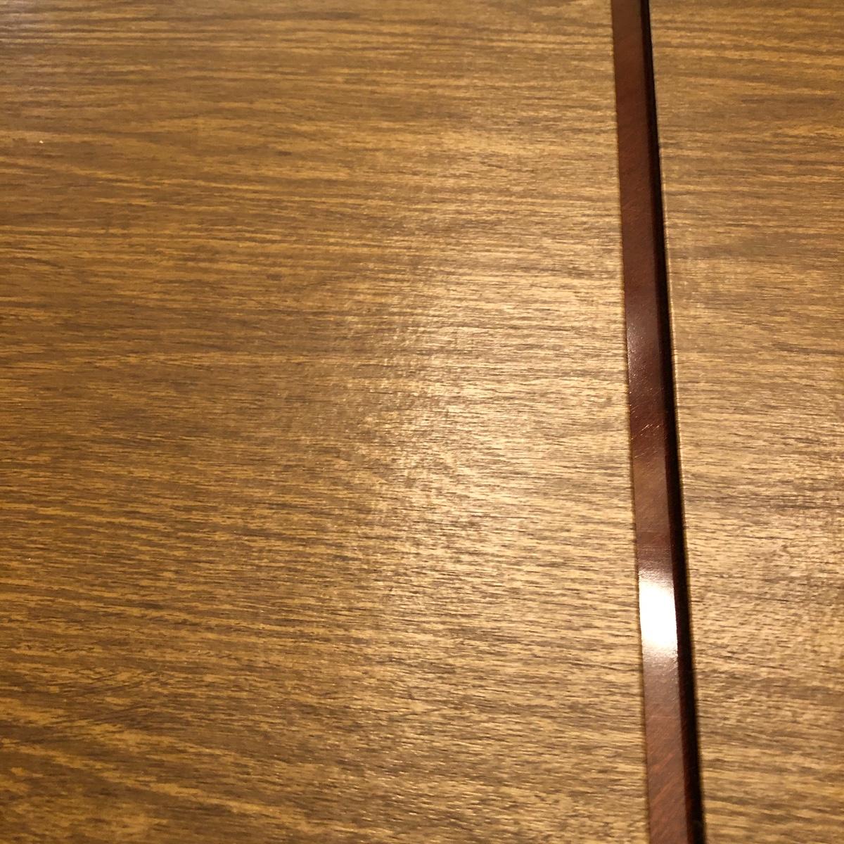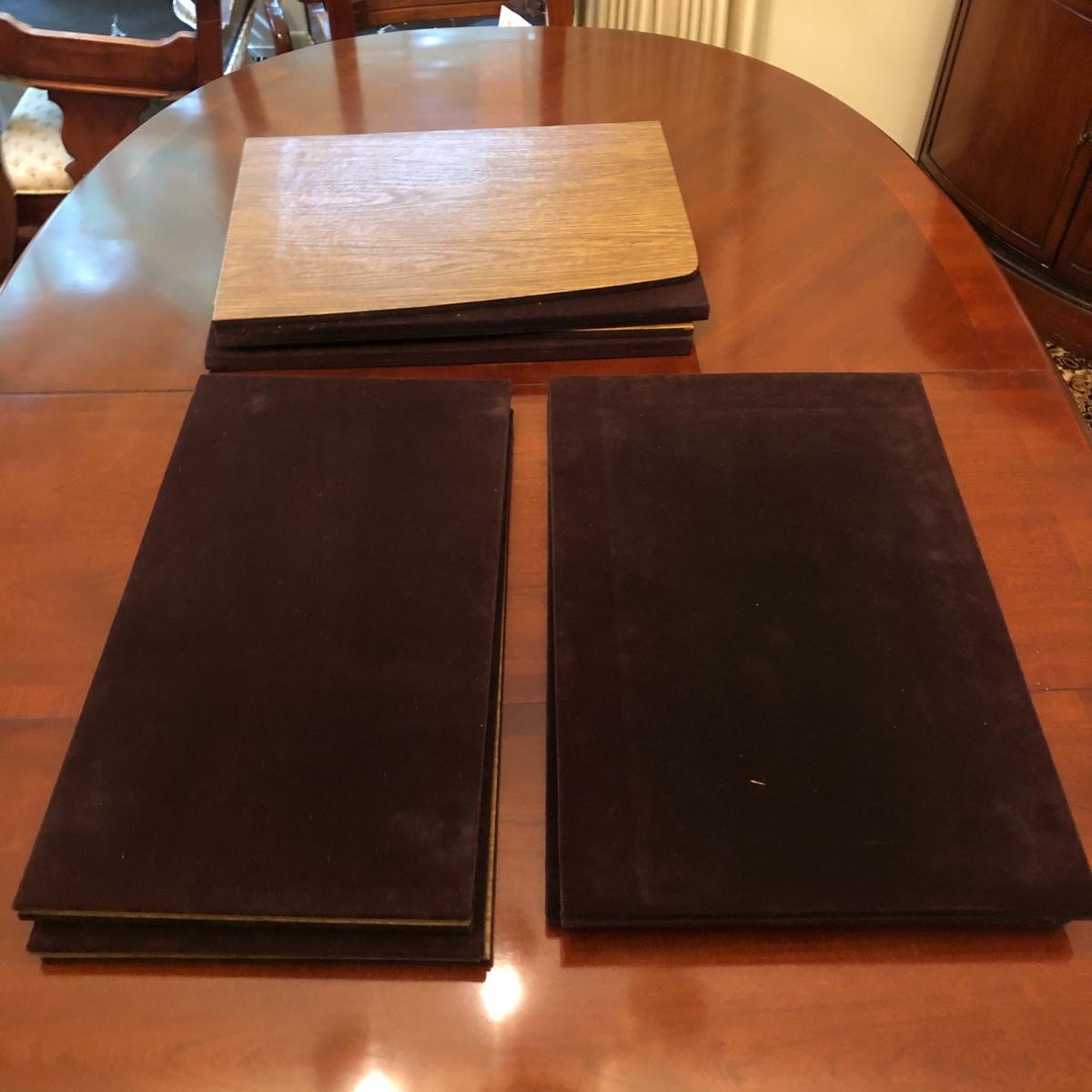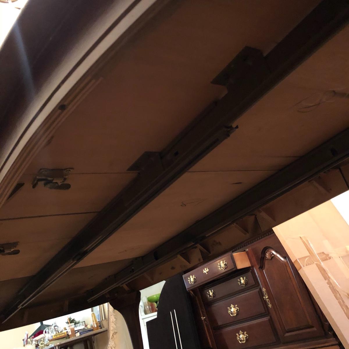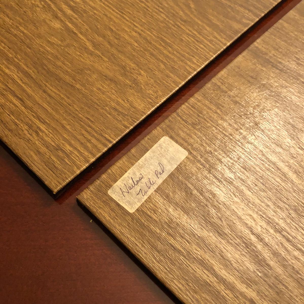 Ornate wood grain with stunning craftsmanship this dining table is great for at least six people dining. Currently measuring 93” x 43” x 29.5”. Removal of leaves decreases length by 15” each. We have 8 dining chairs that are perfect to go with this piece in Lot 185. The white table pads that were originally on this table, four total, are included alongside a spare set of six table pads. The second set of table pads have a wood grain texture and seem to be for a rectangular table. If you love games nights or gatherings, this table and protective pads are great for easy clean up and extra space!