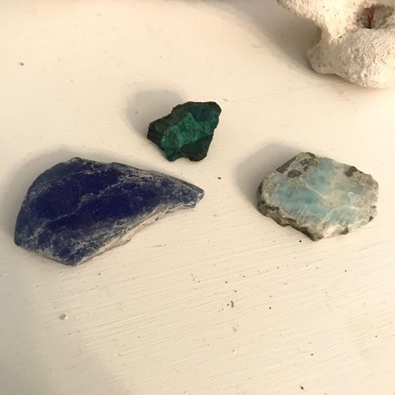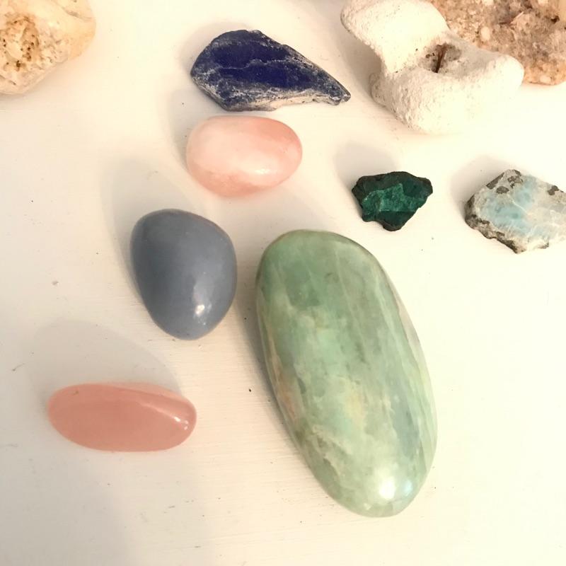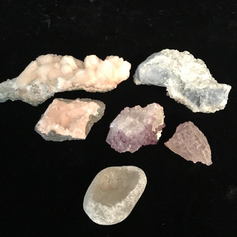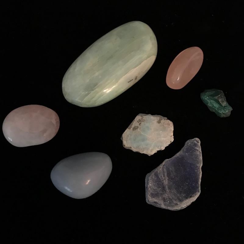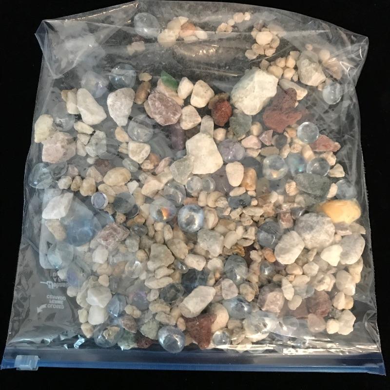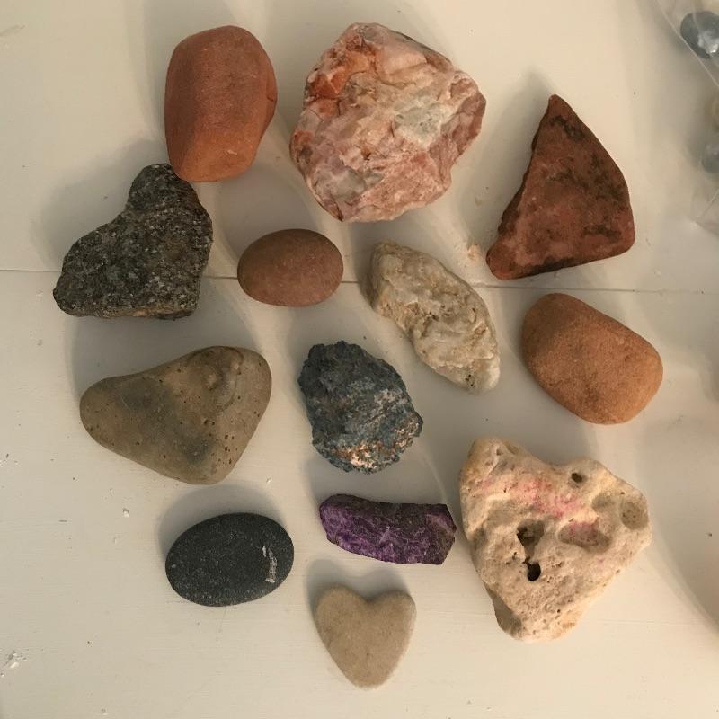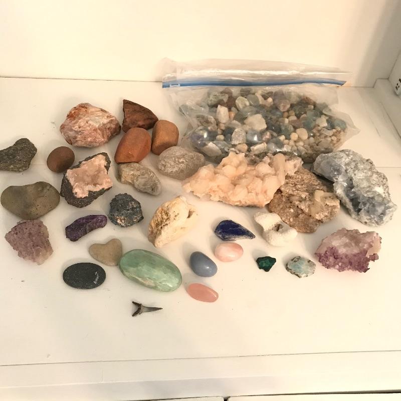 Grounding collection of stones and crystals can add some color to your world. Lots of subtly colored crystals, smooth river rocks, polished rocks and more! A Ziploc bag full of vase beads and smaller rocks included. The pink crystal is 6.5” long. See photos. No shipping.