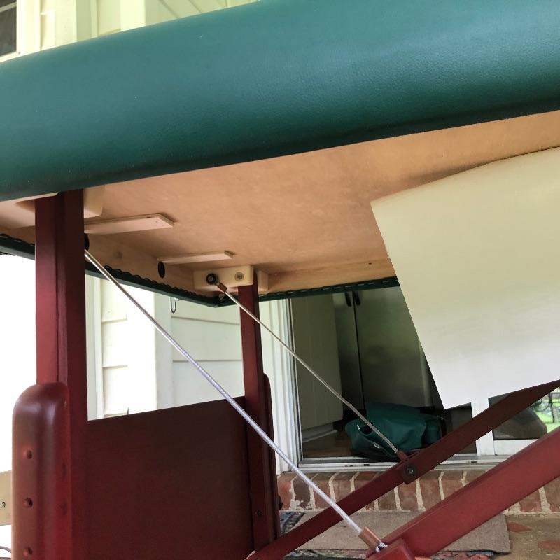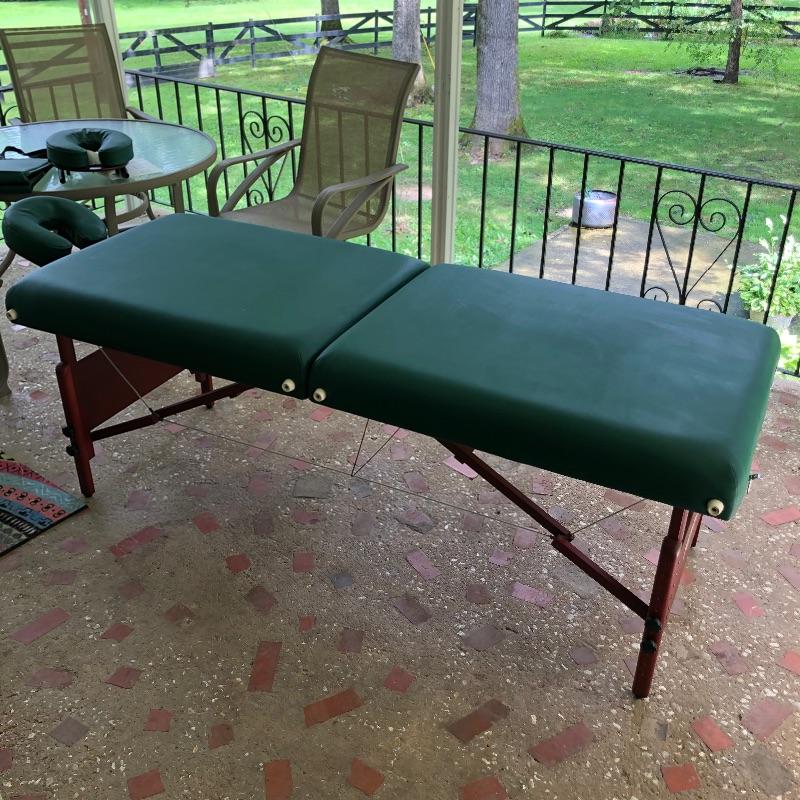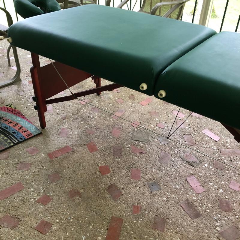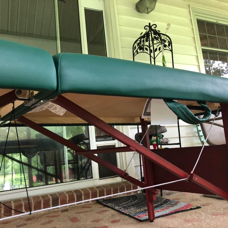 This green auto lock massage table is in great condition. Fully collapsible with a handle for carrying that makes this table very easy to transport. It comes with two detachable face cradles that are height adjustable and two arm rests. It has one small area where the surface is slightly marked which is shown in an image; it is really only aesthetic and should not affect the comfort of this extremely cushioned table.