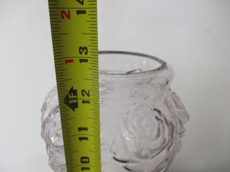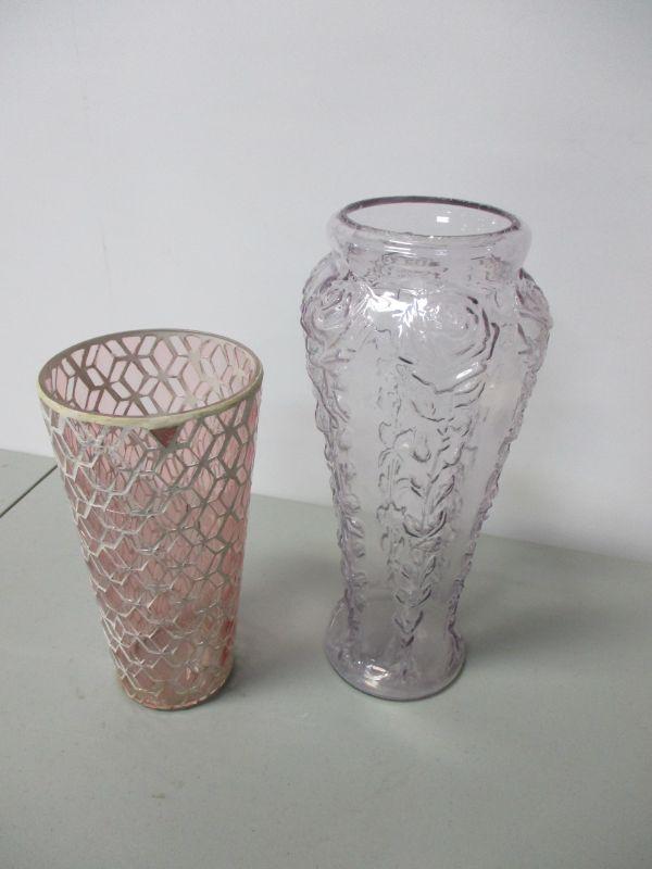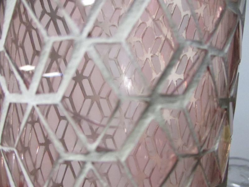 The darker pink vase has been etched - and the etched spaces are filled with grout. There are a few cracks. This piece must have taken a careful touch to not break the glass.