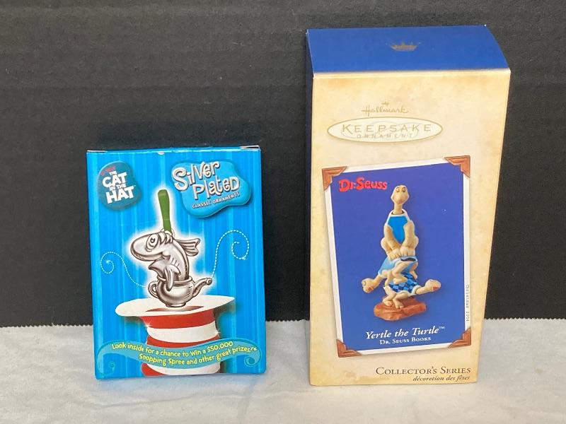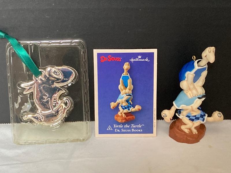 Hallmark Keepsake Dr. Seuss Yertle The Turtle measures 4” tall and turtle heads bobble. Silver plate Dr. Seuss The Cat In The Hat “The Fish In A Dish” ornament measures 2-1/4”
