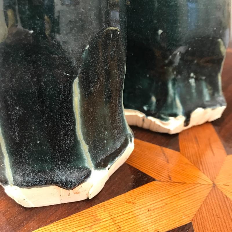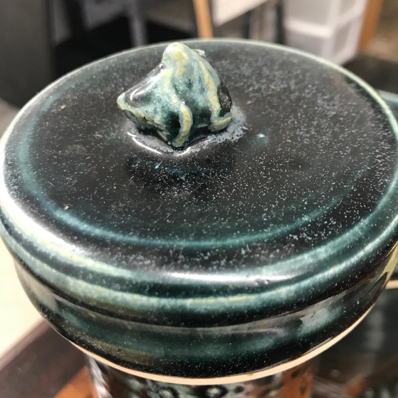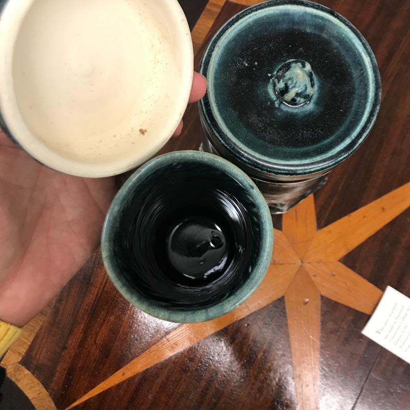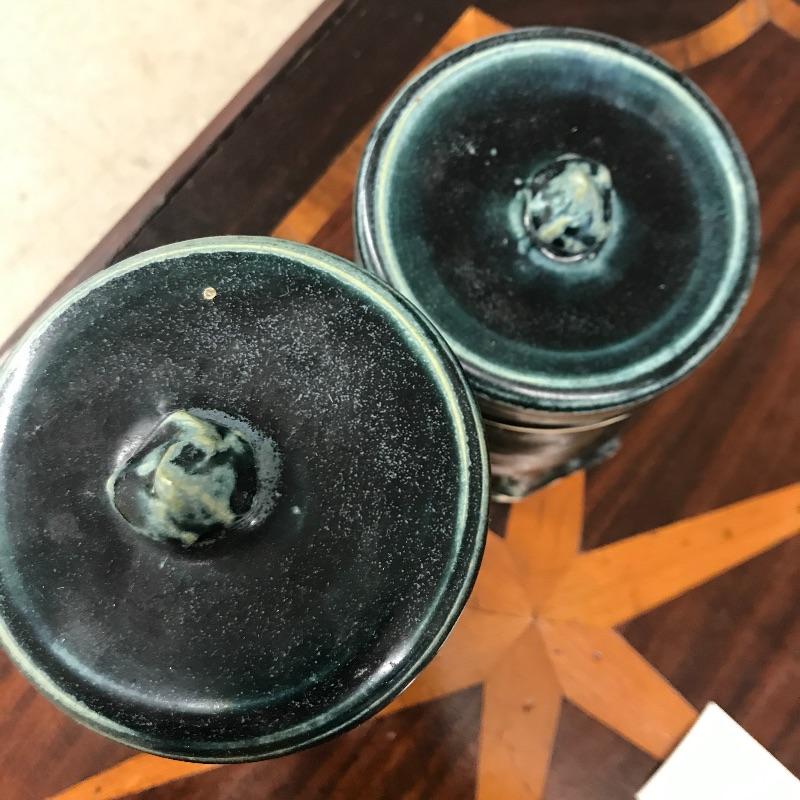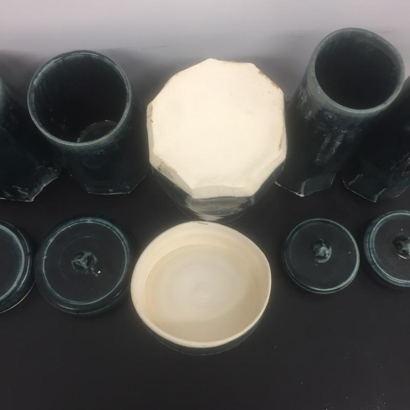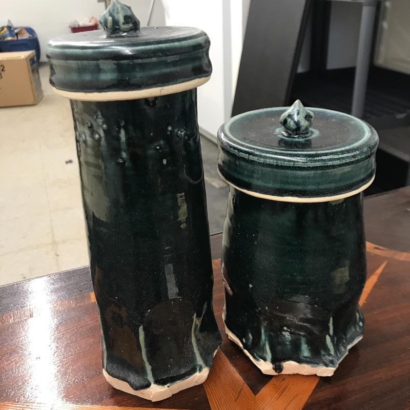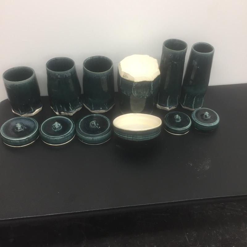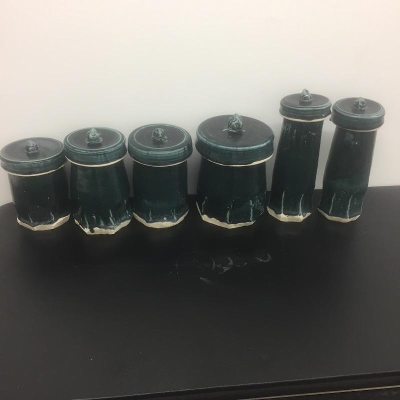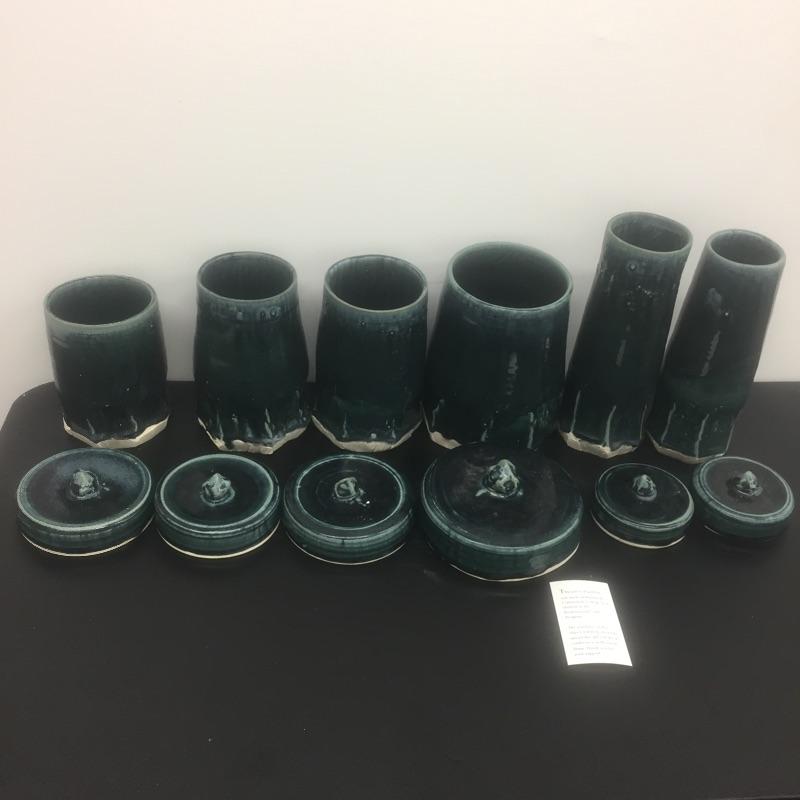 Selection of six handmade pottery canisters with lids made by students at Haywood Community College. Dark greenish blue color.