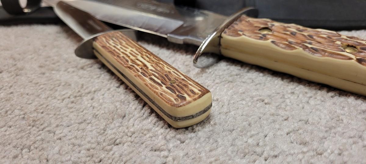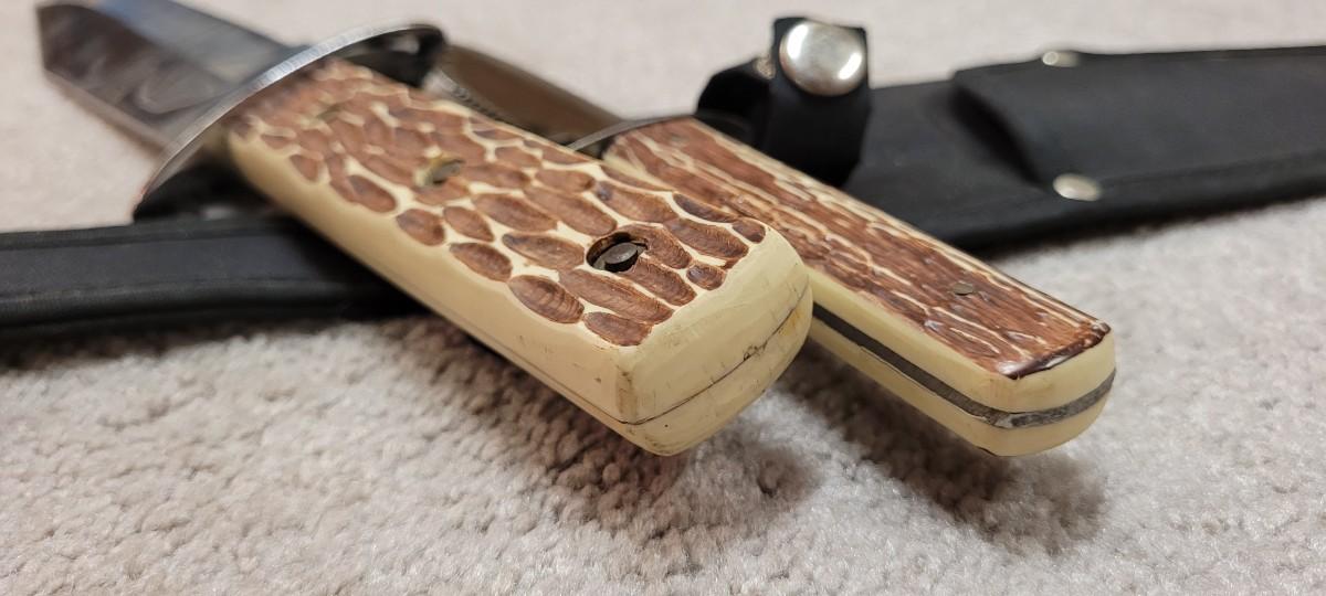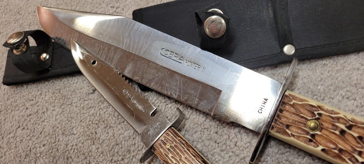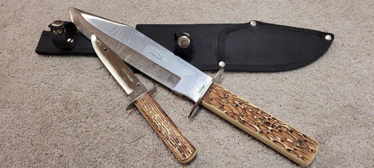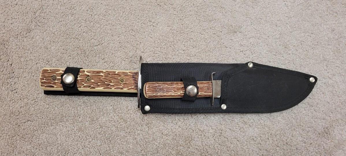 This dual knife hunting set appears vintage but in nice pre owned condition. The larger knife is quite heavy and would be capable of taking on some large jobs.