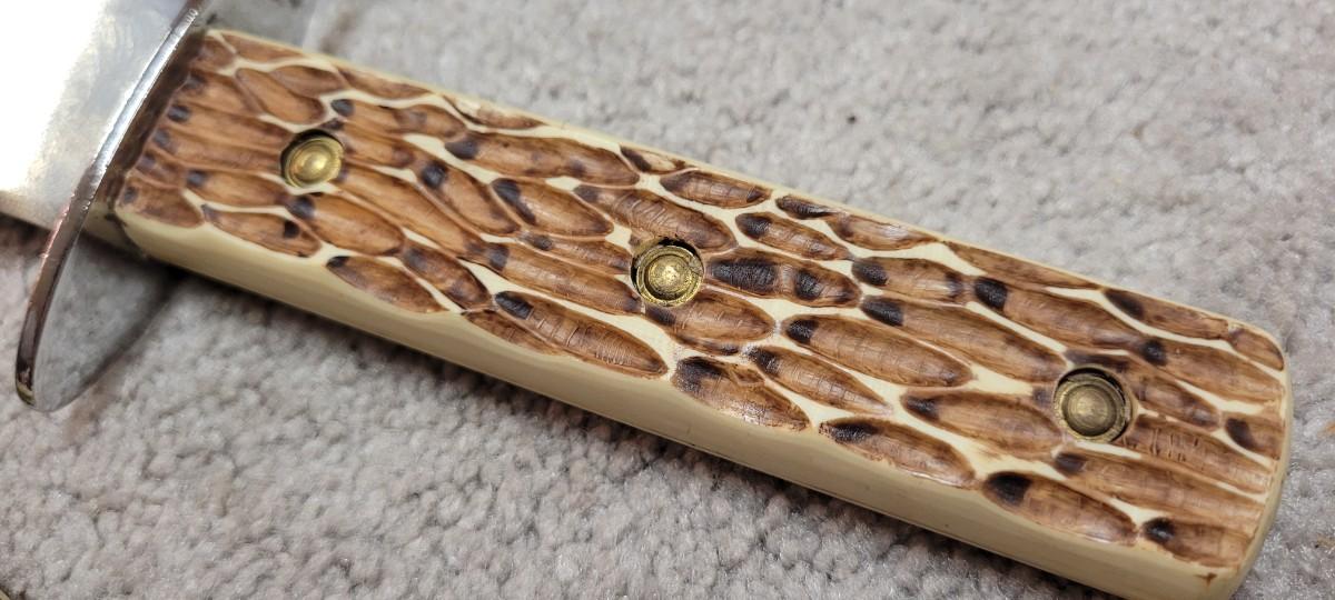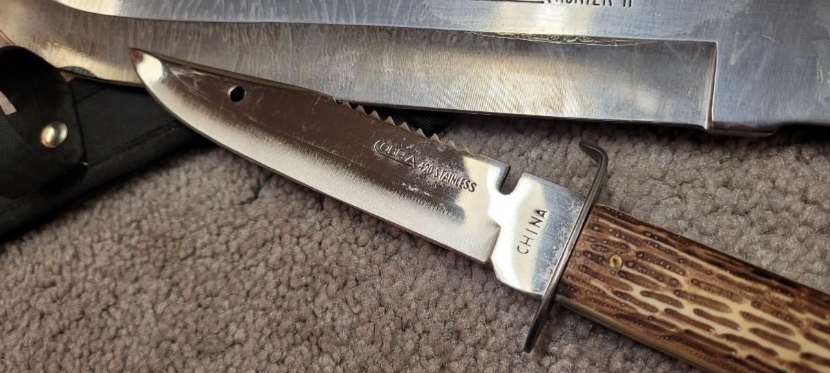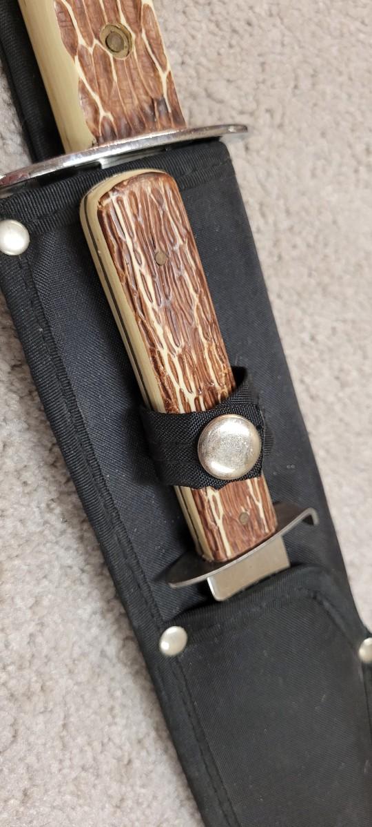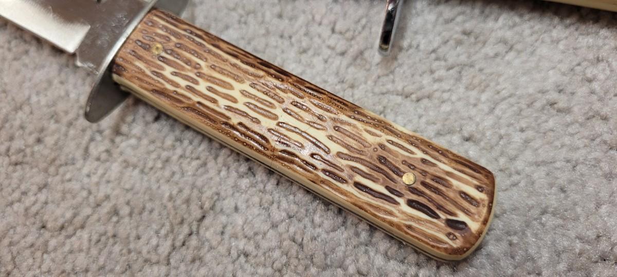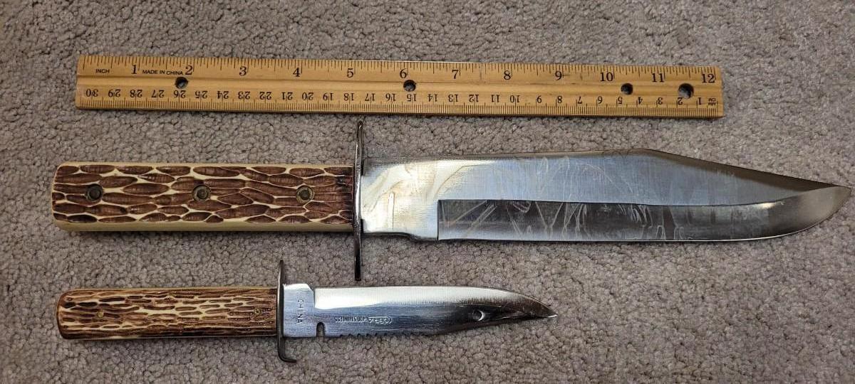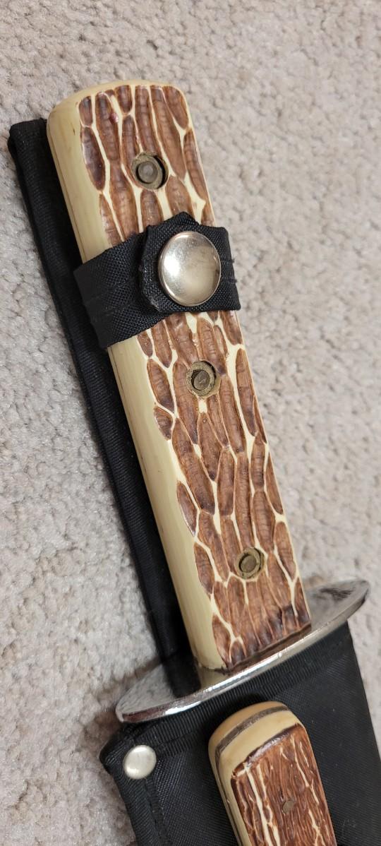 This dual knife hunting set appears vintage but in nice pre owned condition. The larger knife is quite heavy and would be capable of taking on some large jobs.