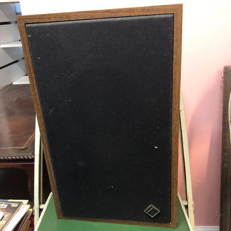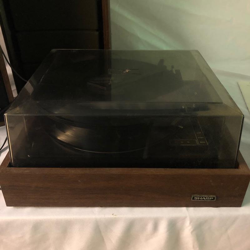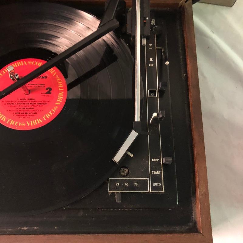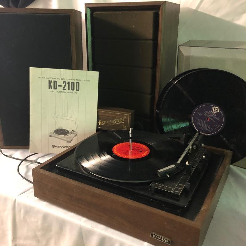 We tested this great vintage Kenwood turntable and it appears to work great. It’s a fully automatic belt drive turntable and we have even thrown in some records to get you started, including Streisand, Pavarotti and more, see images. Original manual accompanies this item. It might need a dab of glue on the one corner of the base, see image. We have also included a dishwasher and three speakers, the two Hitachi appear to be a pair and were most likely used for this turntable. The third speaker is a Soundesign.