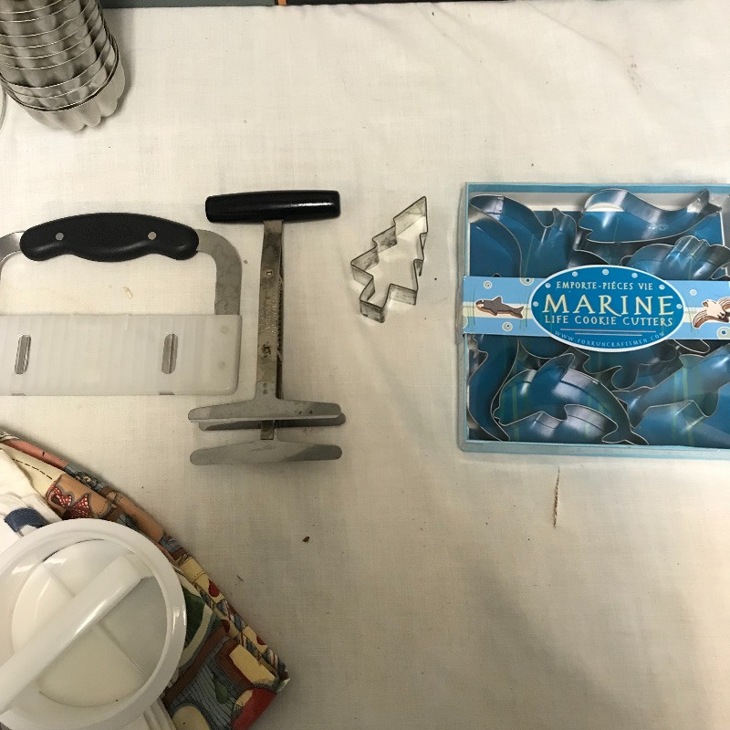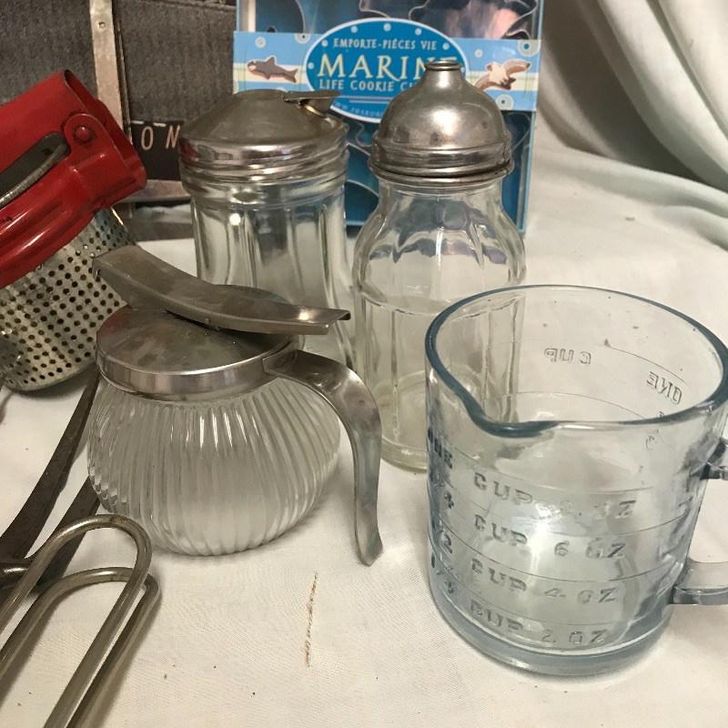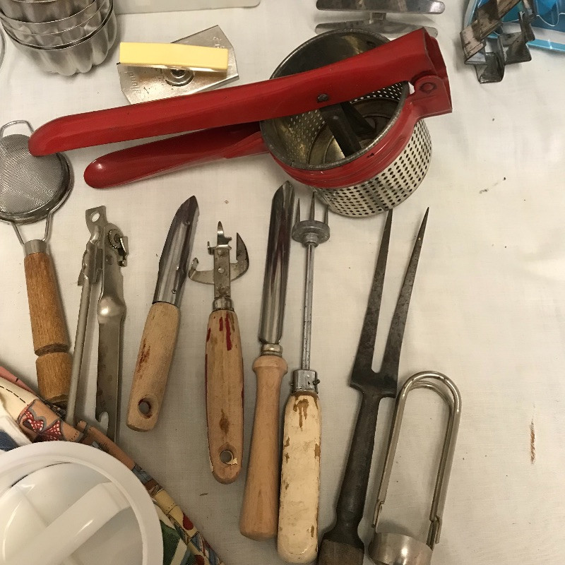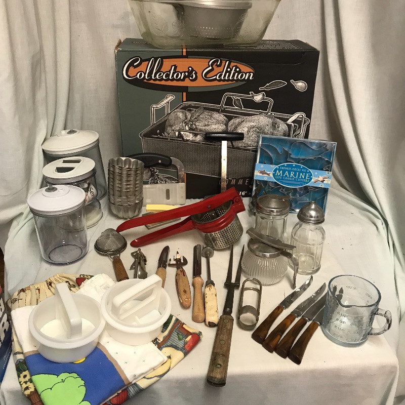 A great collection of useful kitchen gadgets some of which are vintage. some modern including like new storage containers and brand new roasting pan. So many implements, see images for all that is included here. Local pick up only.