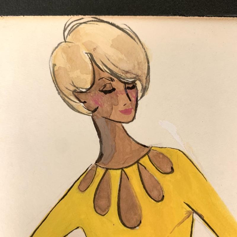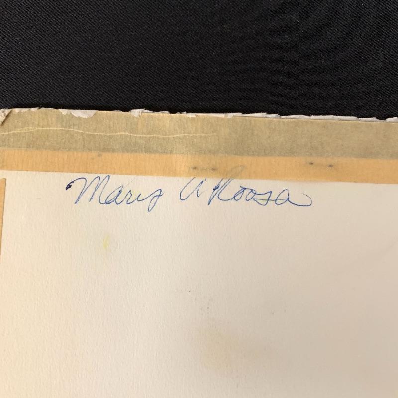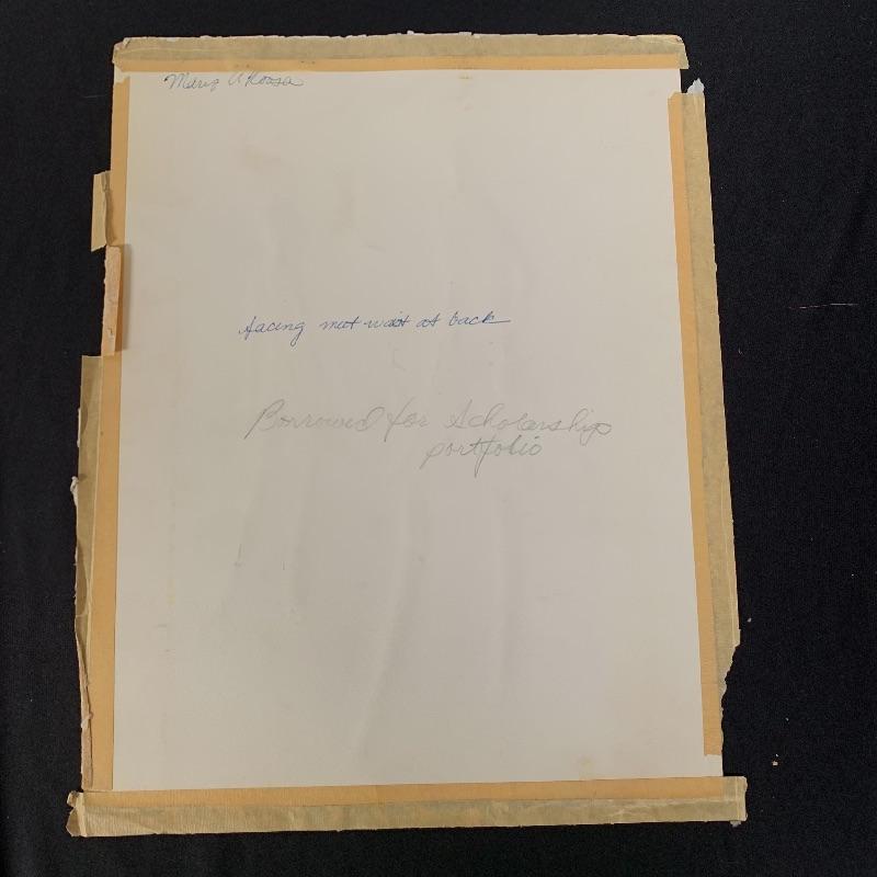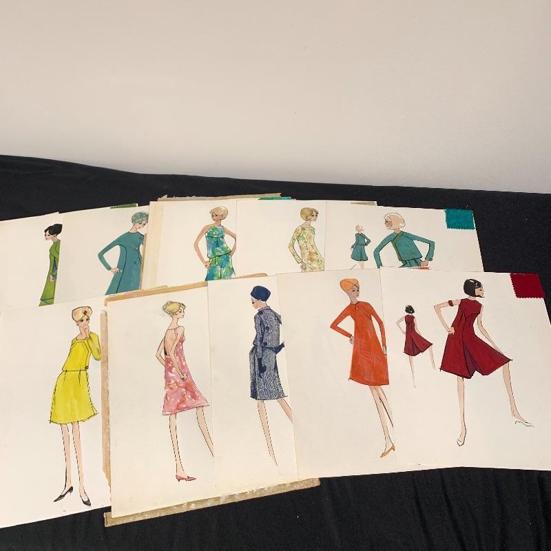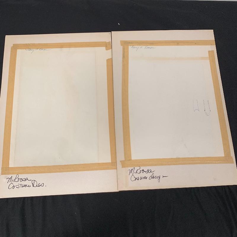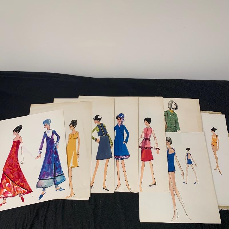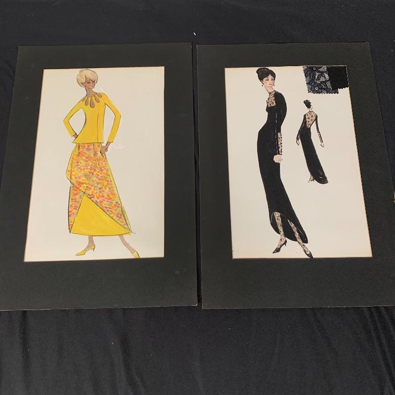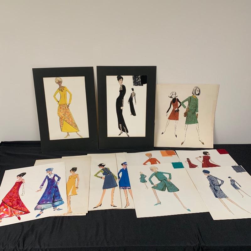 This lot includes 21 fashion sketches by Mary Rosa. Most of the pieces are signed in the back. Two of the sketches are mated and measure about 19in x 13in. They are all drawn on poster board material and some have fabric swatches at the top. The smallest piece measures about 14.5in x 11.5in.