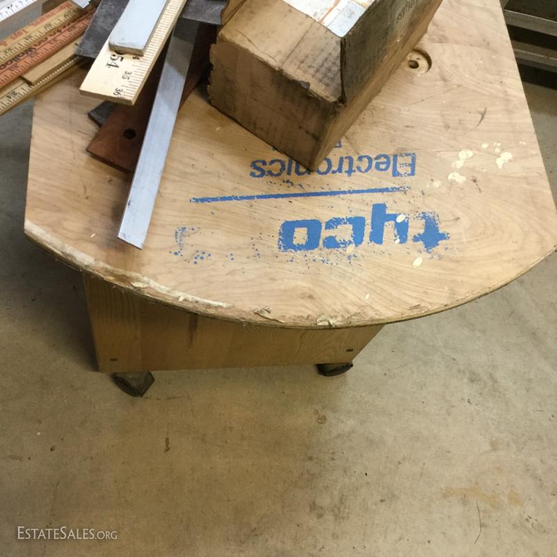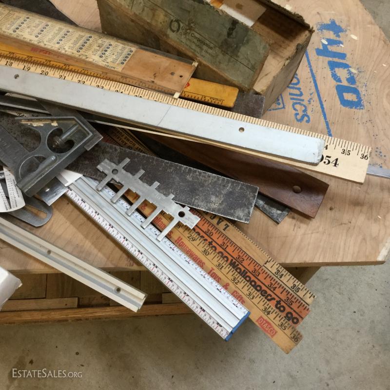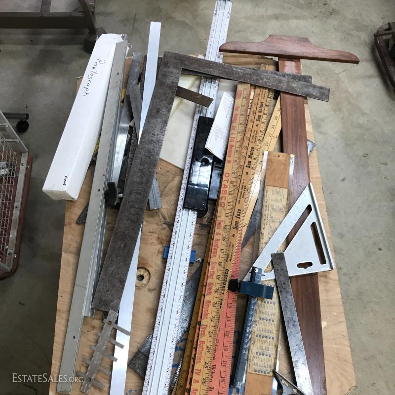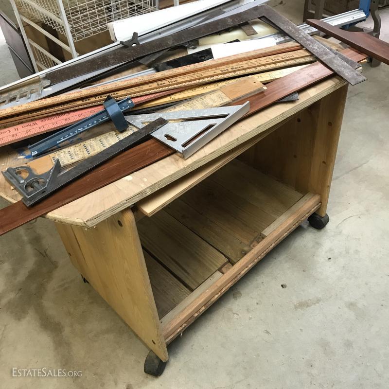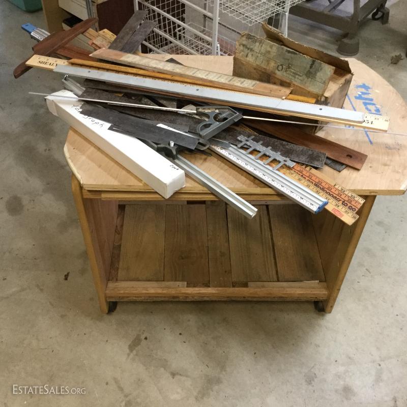 Various rulers and more. Also includes wooden rolling cart. 36"l x 27w x 25"h. See photos.