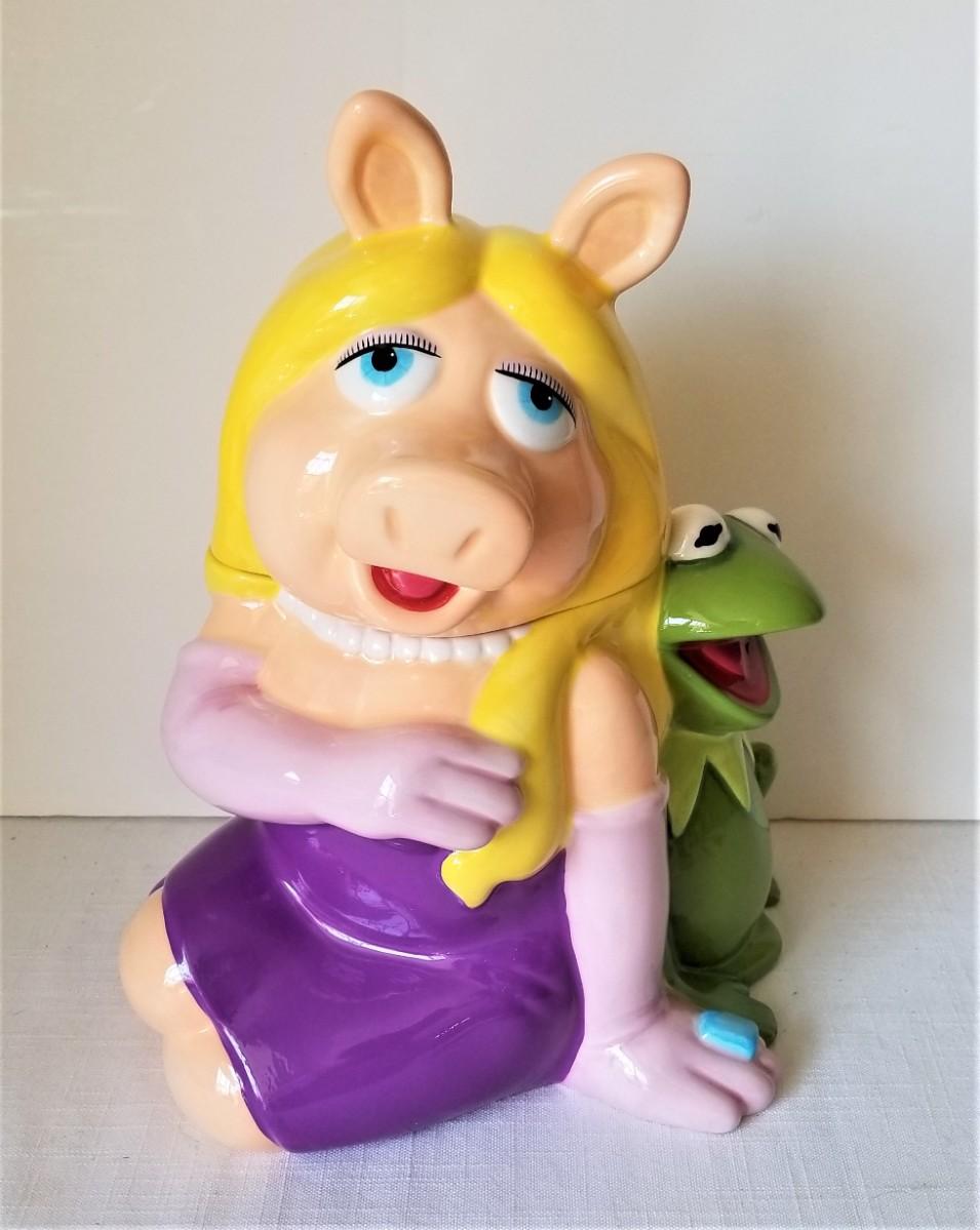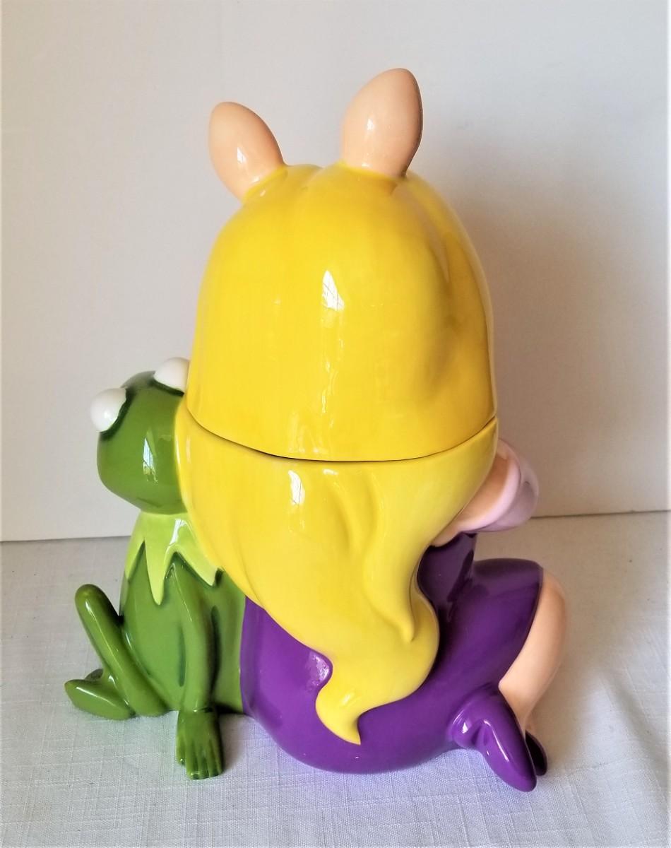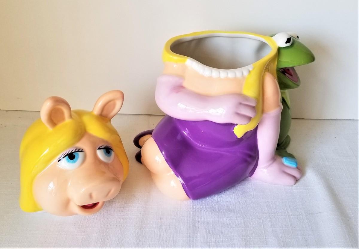 The styrofoam box came apart when we took this cutie out, but we can affirm this is new and never used. 2005, Jim Henson Company - cookie jar featuring Miss Piggy and Kermit - 12" tall.