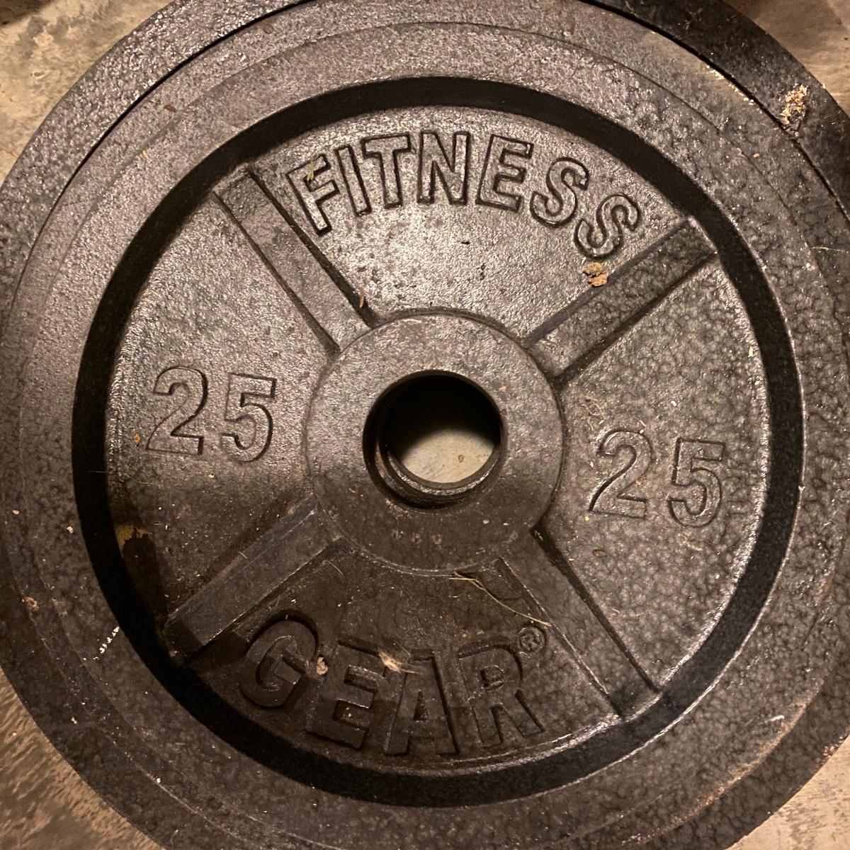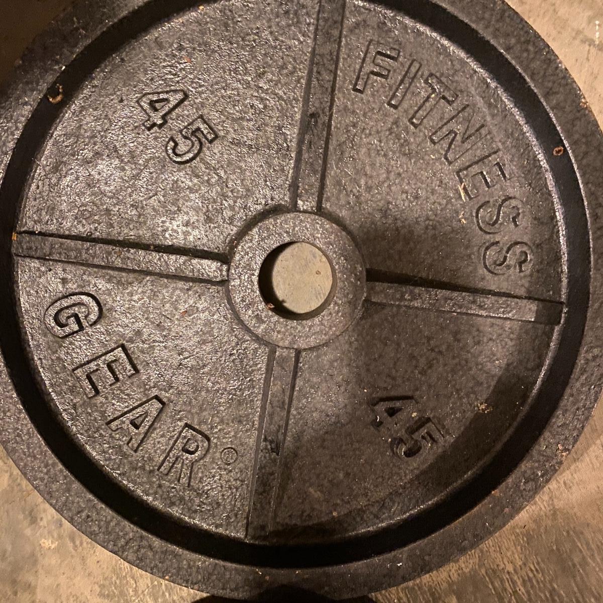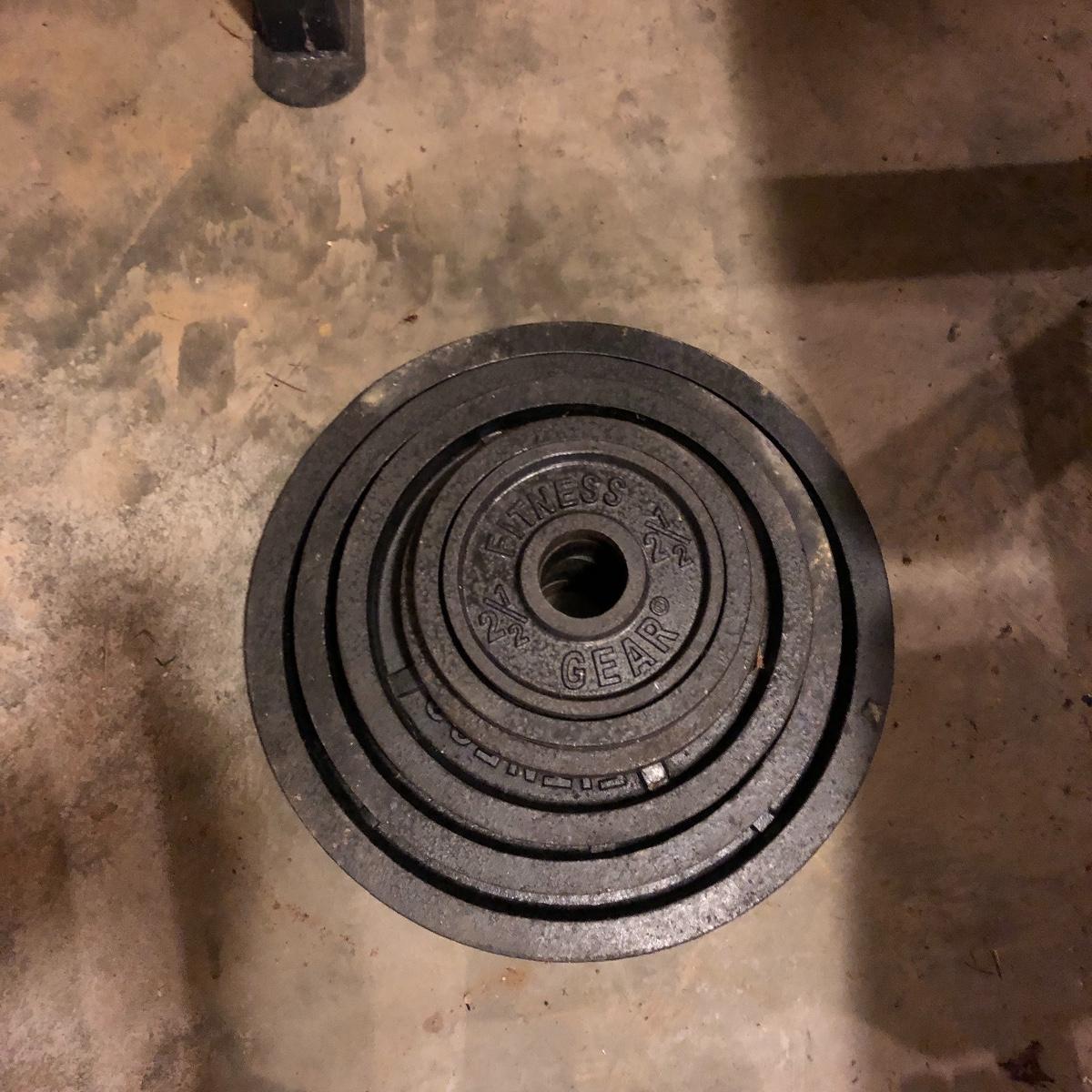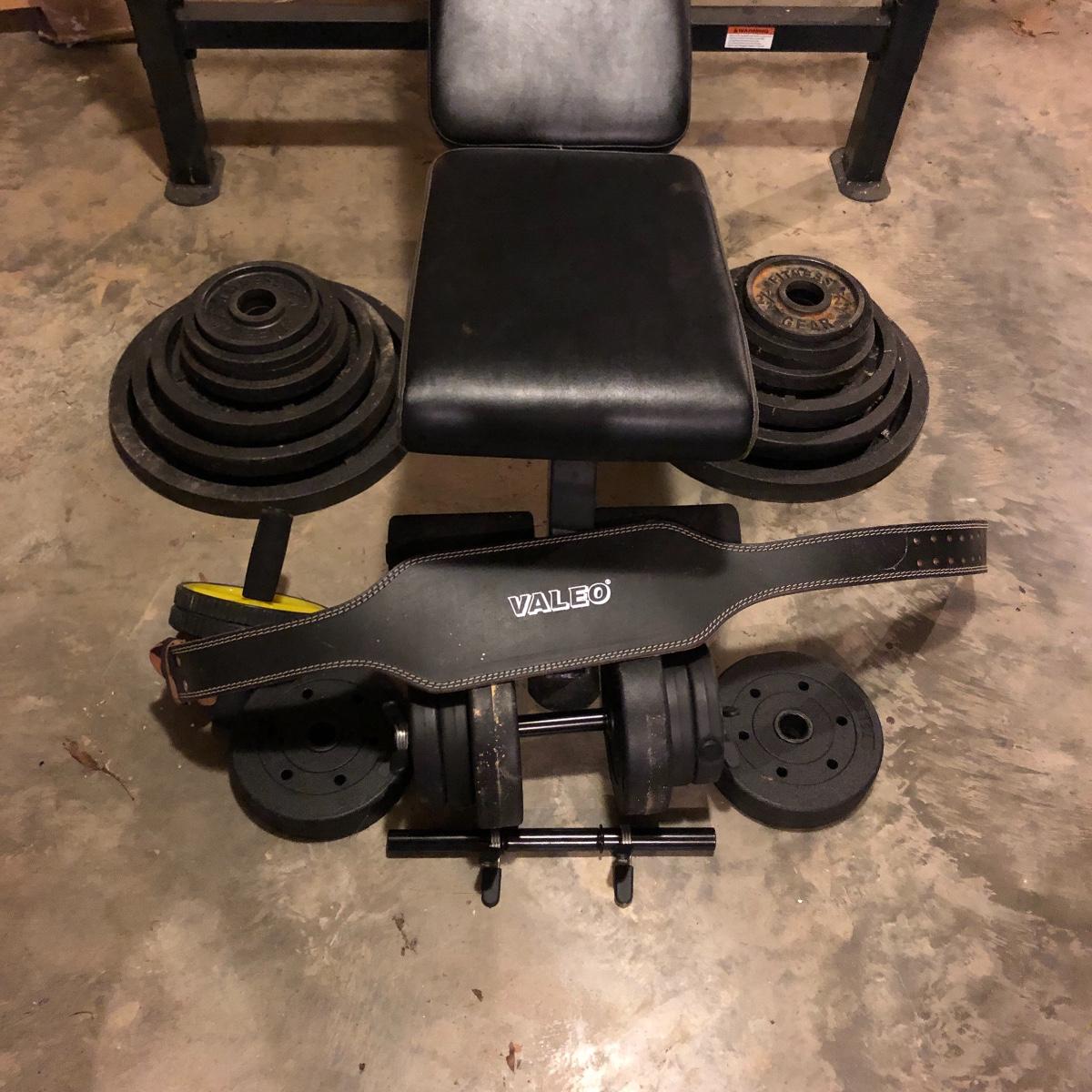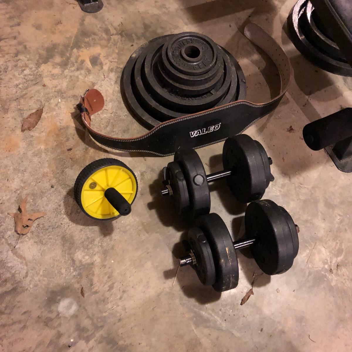 Plenty of weights to keep your workout challenging in this lot. Lot includes 255 pounds of Olympic weights and 86” Olympic bar and two regular dumbbells with twenty pounds of weight each. Also includes Valeo belt and a Golds gym roller wheel. Olympic plates are two of each 45,35,25,10,2.5 and four 5 pound plates. Bring help item is substantial and will have to be walked around back of house. Weight bench not included but available in lot 178.