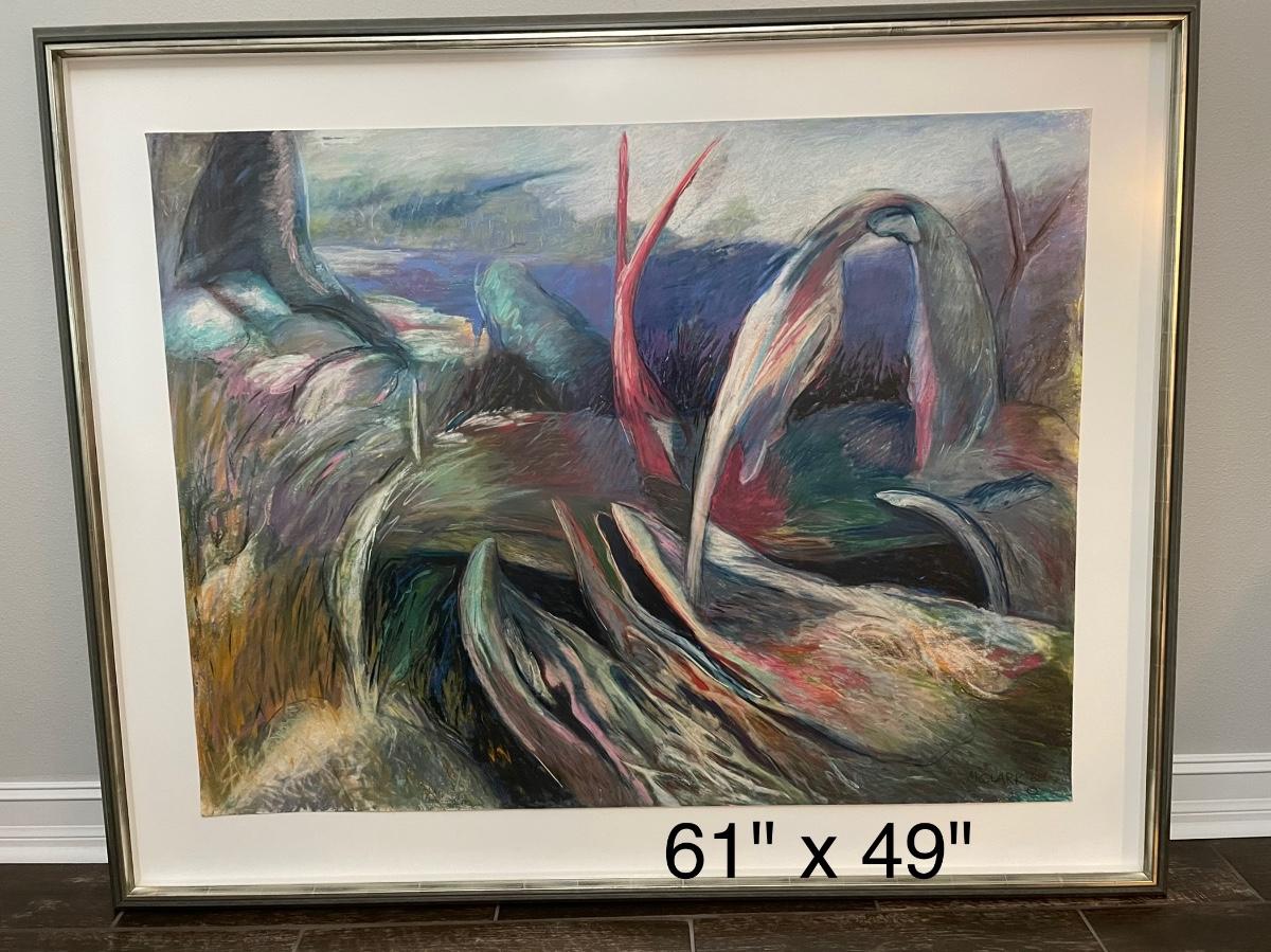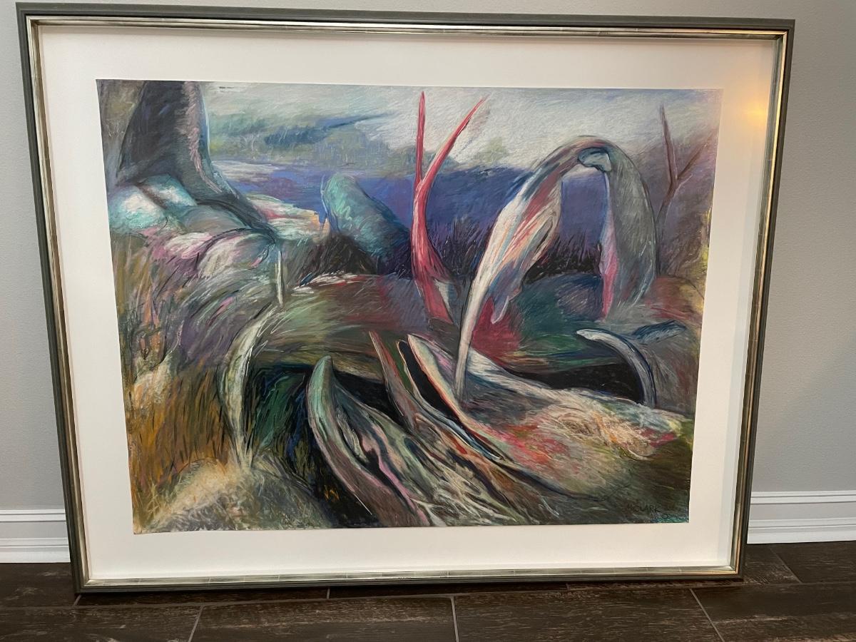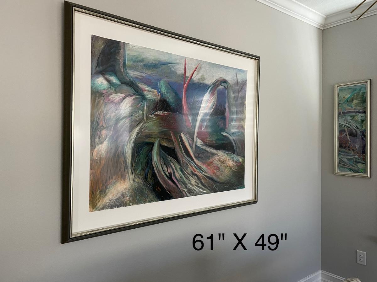 Artist: Mickey Clark. Pastels on paper, mounted behind glass in a thin silver frame. 61" X 49"