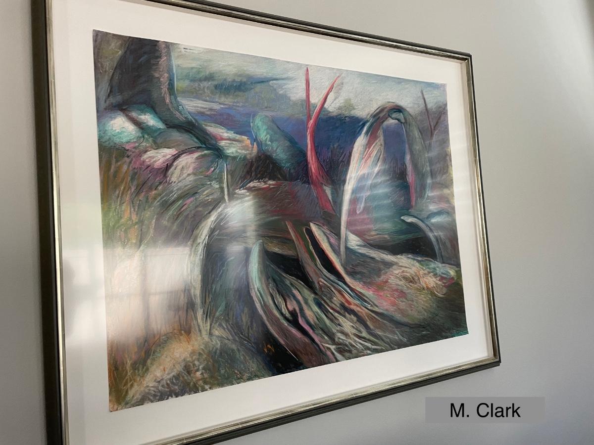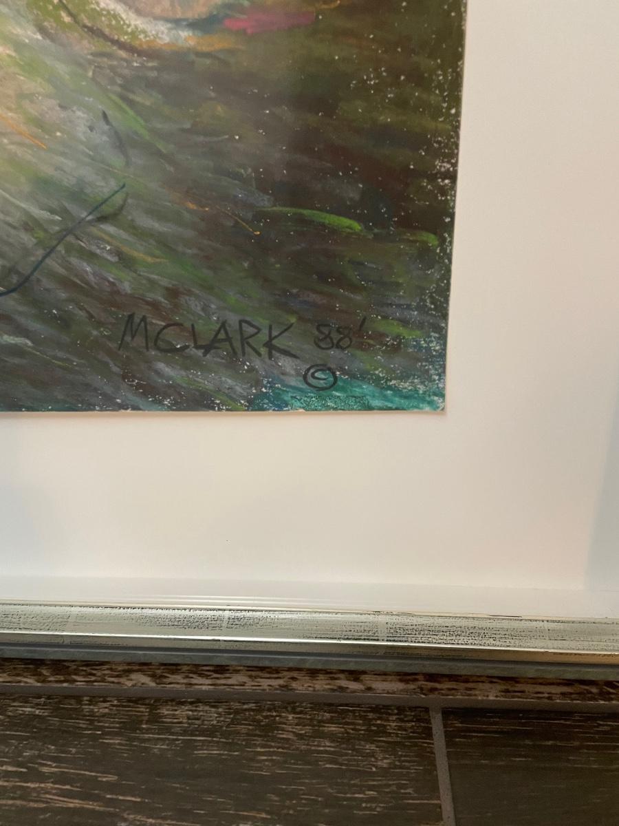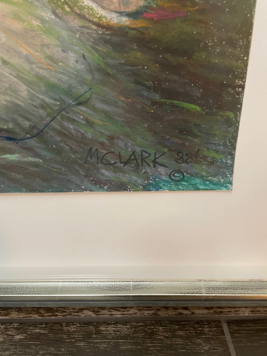 Artist: Mickey Clark. Pastels on paper, mounted behind glass in a thin silver frame. 61" X 49"