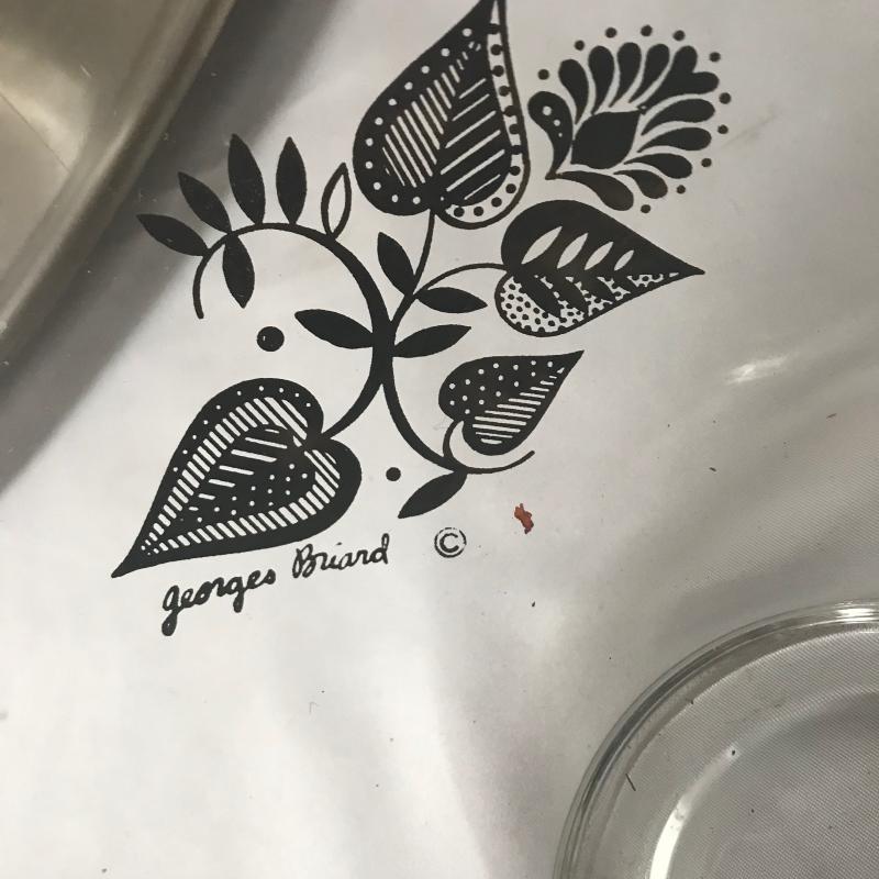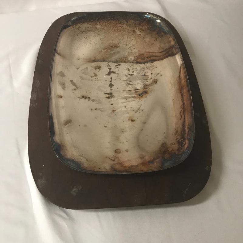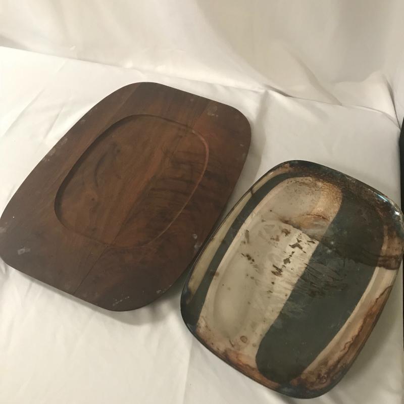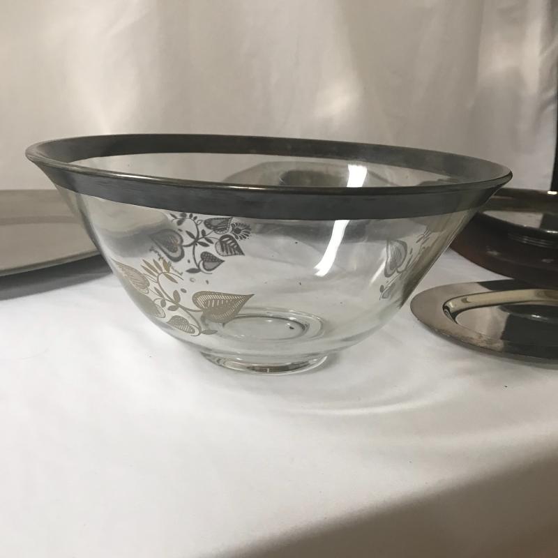 Glass bowl with silver overlay by Georges Briard measures 10” dia. and 5” tall. 4 stainless serving pieces (one by Voss), one on a wooden board. This lot is available for shipping or local pick up in Asheville, NC.
