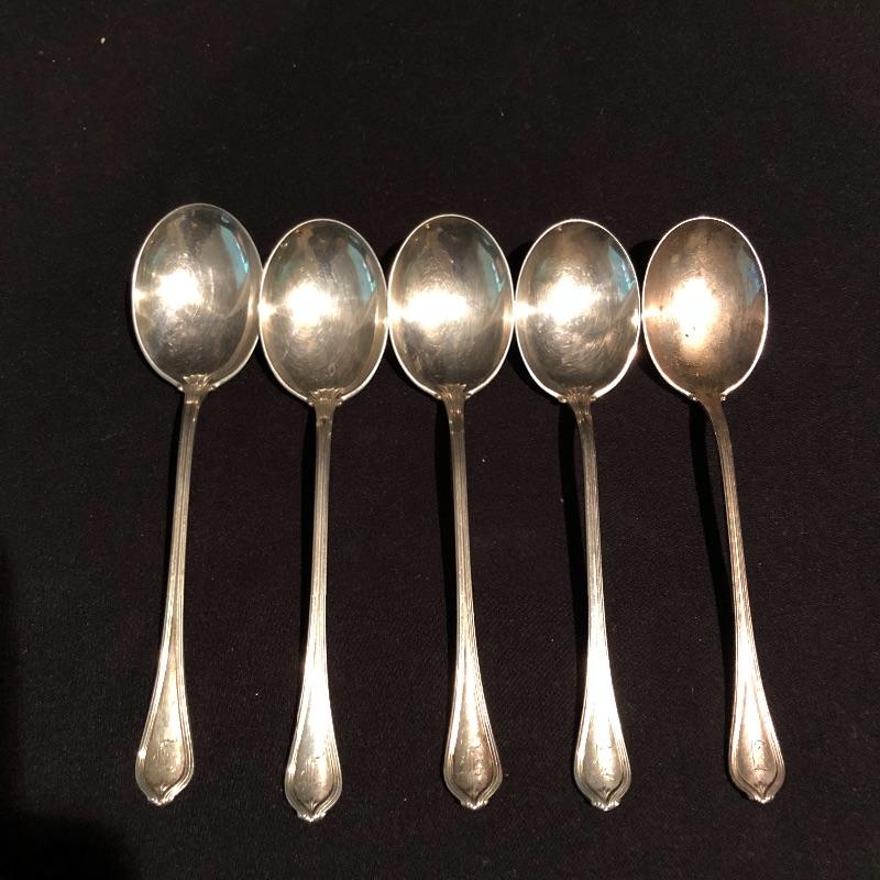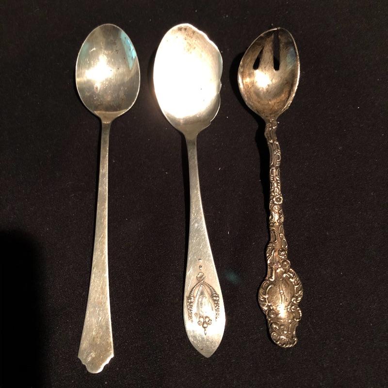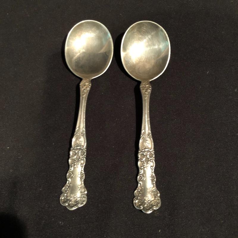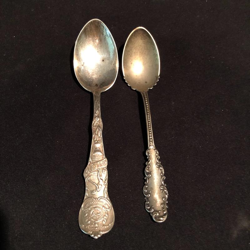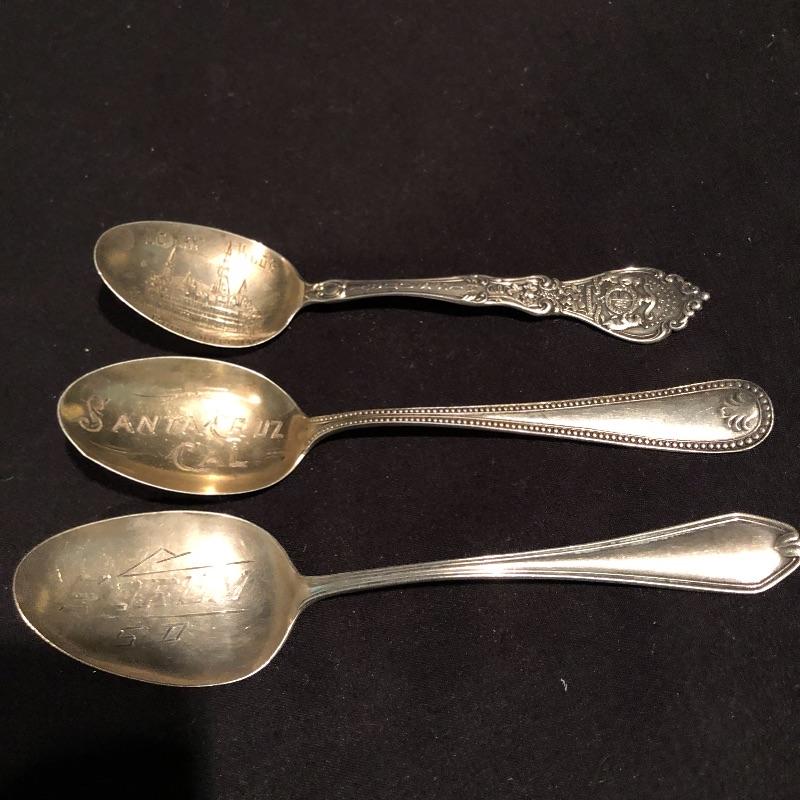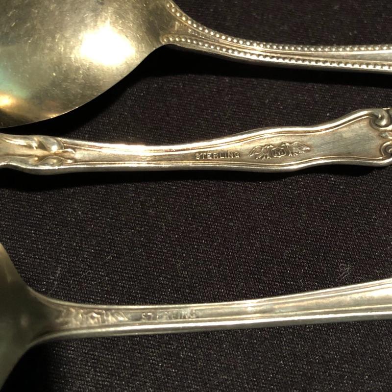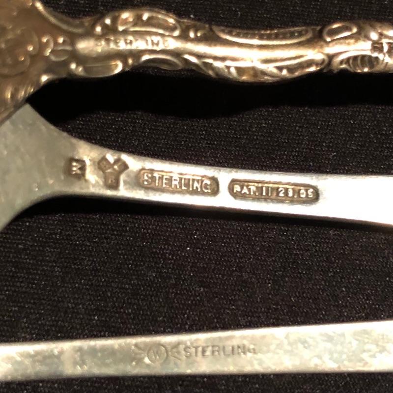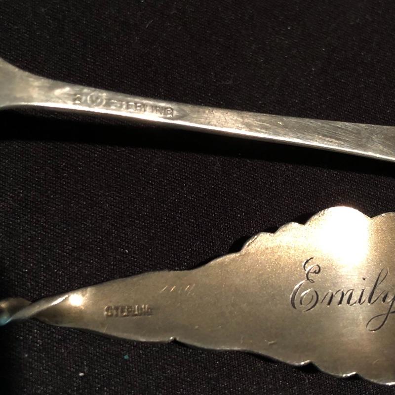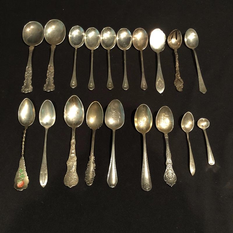 Don’t miss these classic sterling spoons. Lot includes nineteen spoons that includes five matching spoons with the letter F, spoon with what appears to be enamel flower with Emily engraved on back and more unique spoons. Longest spoon measures 6”. Starting price is at or near melt value.