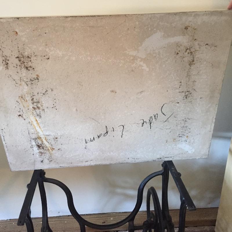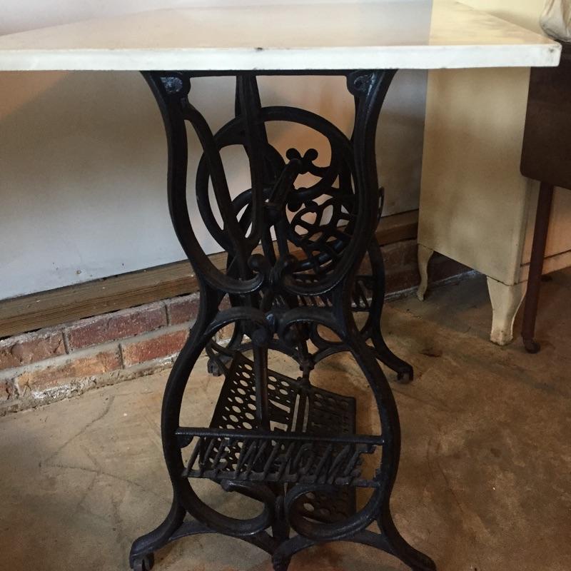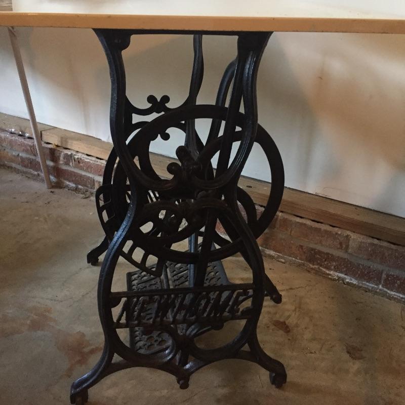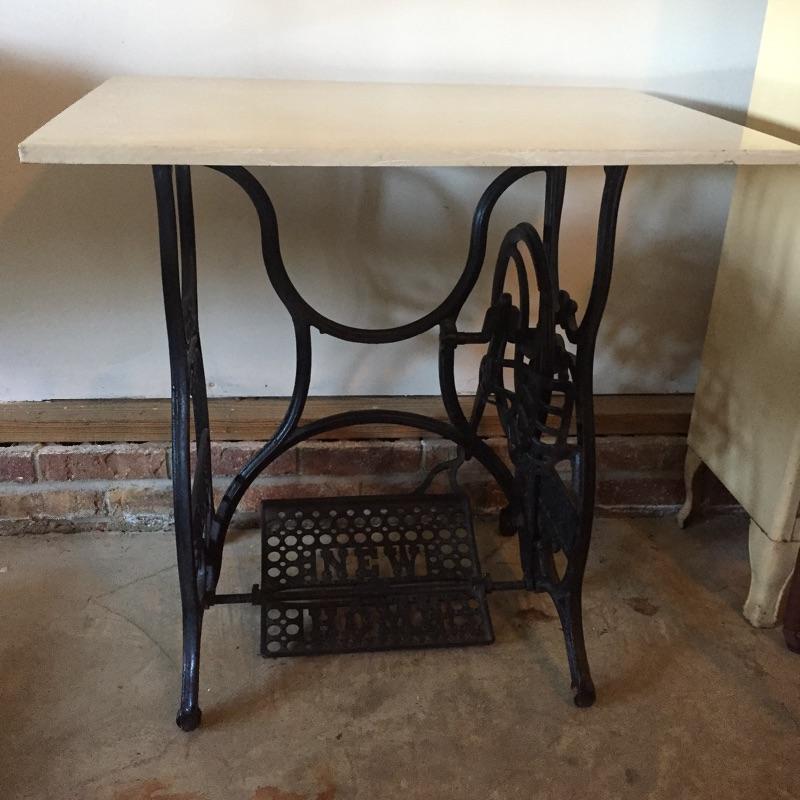 New Home treadle sewing machine base with slab top. Beautiful New Home treadle base table would look great in any room. Table measures 21” x 29” x 29”.