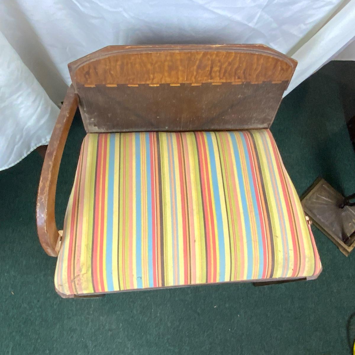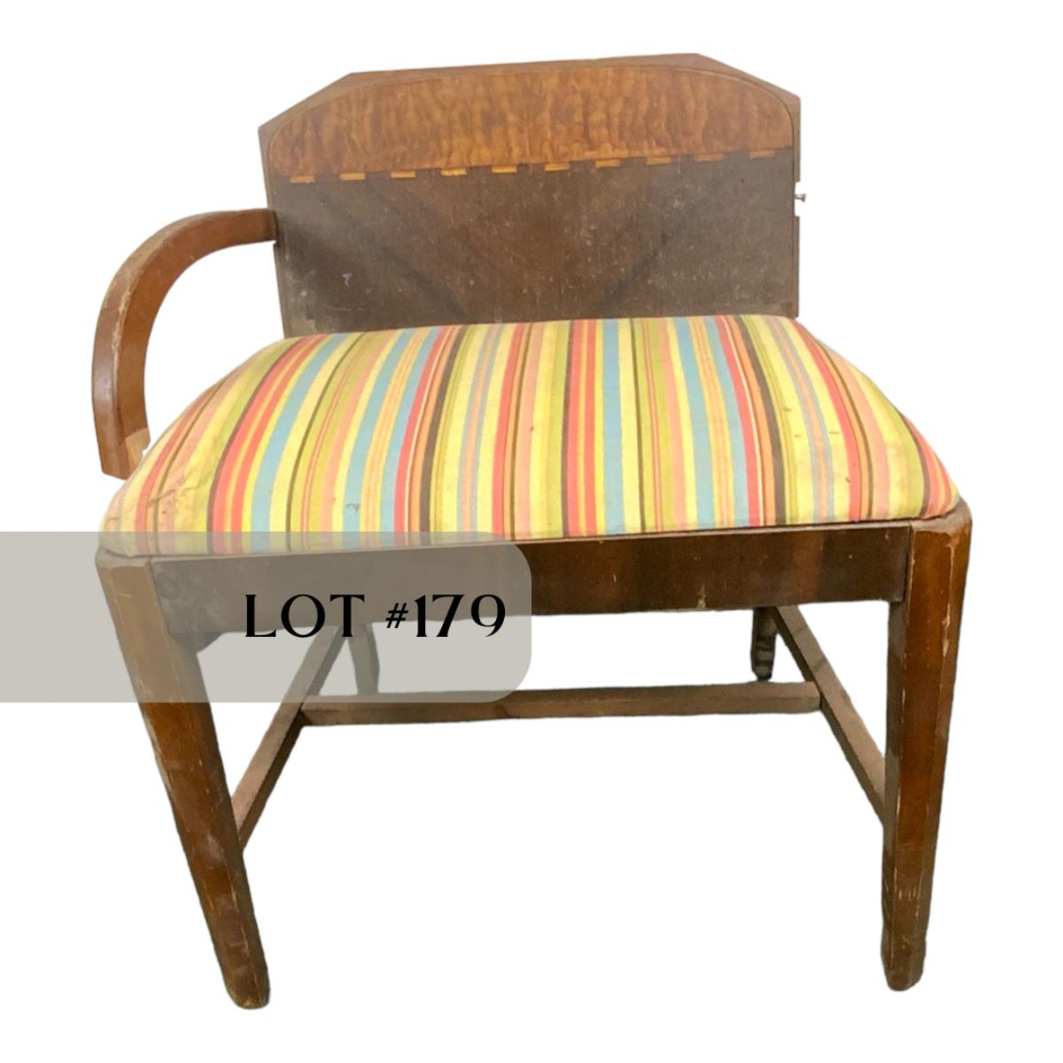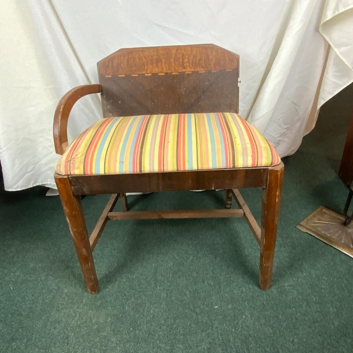 Vanity Bench. I think the simple solution is to get rid of the horrible upholstery and to lob off the other arm. //::\\ Please see photos for details and condition. No attempt has been made to hide any imperfections. All items listed in this auction are warehouse items, and need to be cleaned. A majority of the items need restoration as well. All items are sold AS IS and WITHOUT GUARANTEE. If you are uncertain about an item, DO NOT BID. Due to the nature of this online auction in-person inspection is HIGHLY recommended. All Sales are FINAL. Pick Up Times are FIRM. Please confirm with your own schedule that you can pick up in the scheduled times listed in the Terms and Conditions. Any questions please message the auctioneer. DO NOT Contact The Harp Gallery.
