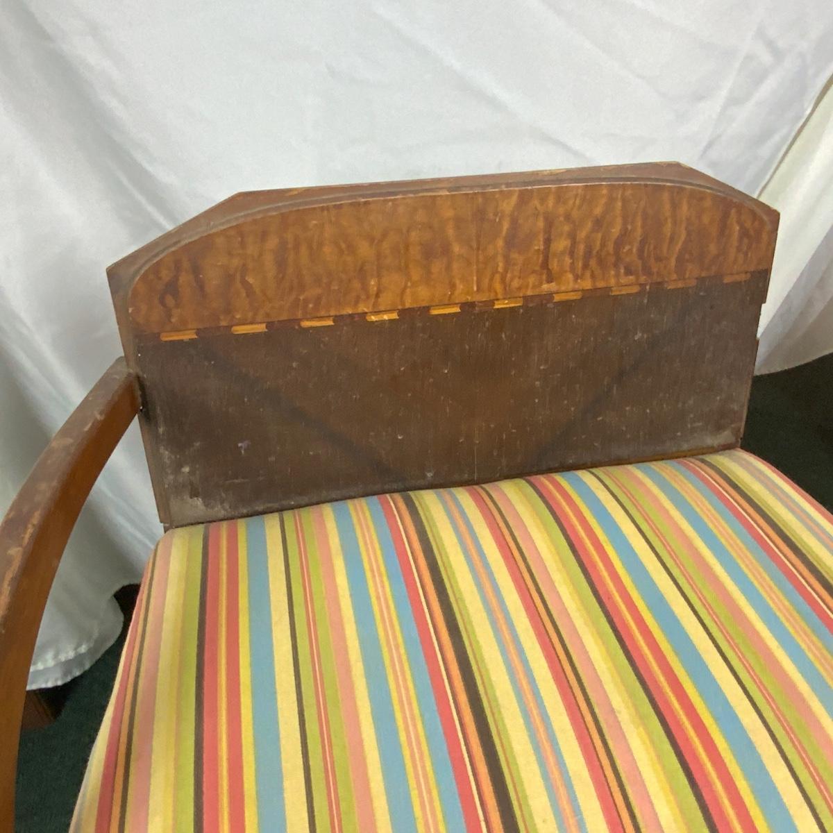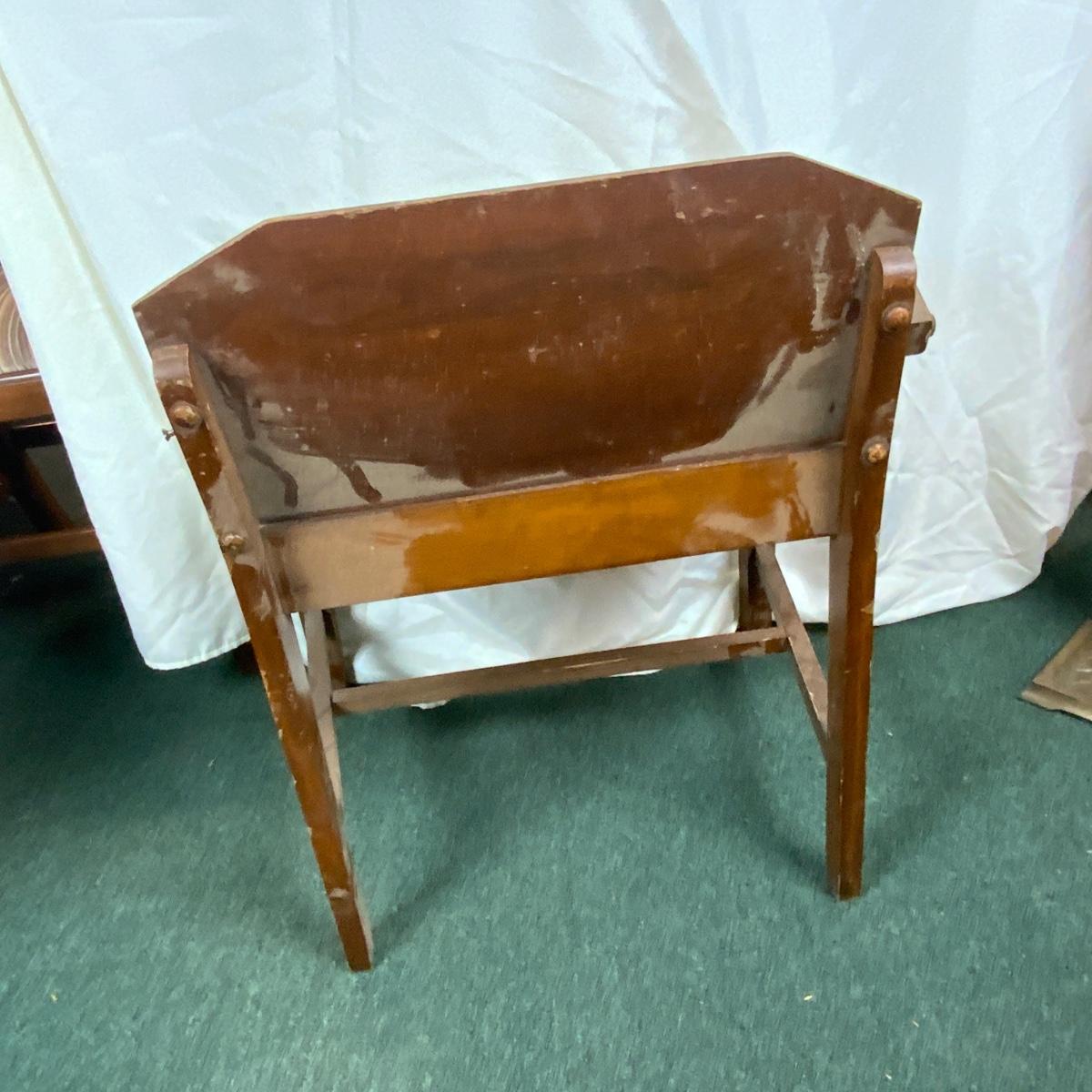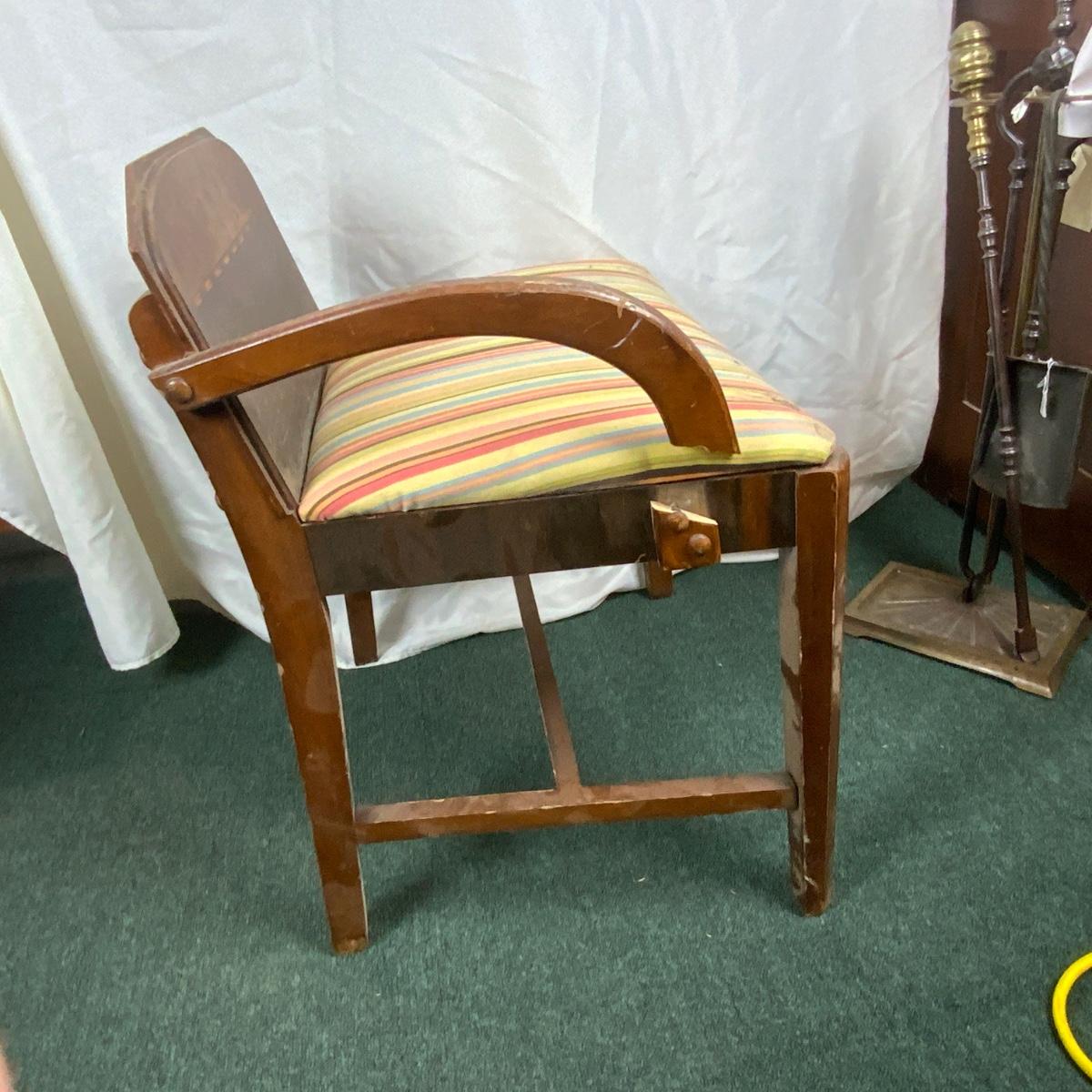 Vanity Bench. I think the simple solution is to get rid of the horrible upholstery and to lob off the other arm. //::\\ Please see photos for details and condition. No attempt has been made to hide any imperfections. All items listed in this auction are warehouse items, and need to be cleaned. A majority of the items need restoration as well. All items are sold AS IS and WITHOUT GUARANTEE. If you are uncertain about an item, DO NOT BID. Due to the nature of this online auction in-person inspection is HIGHLY recommended. All Sales are FINAL. Pick Up Times are FIRM. Please confirm with your own schedule that you can pick up in the scheduled times listed in the Terms and Conditions. Any questions please message the auctioneer. DO NOT Contact The Harp Gallery.