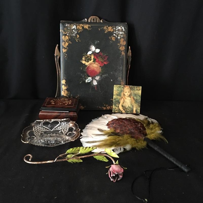 This eclectic array includes A. Gargiulo & Jannuzi music box, glass dish, metal rose, wooden picture frame, feathered fan and a decorative tray that is inlaid. Tray has indents in part of the inlay and picture frame is missing backing, see pictures.