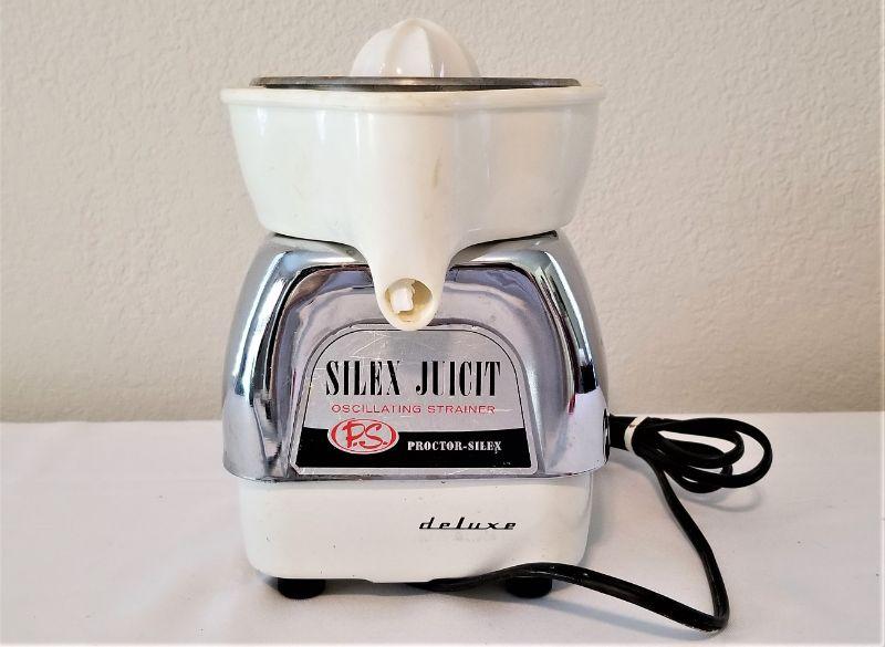 This vintage Proctor Silex "Silex Juicit Oscillating Strainer" has a great mid-century look and still works. 8" tall.