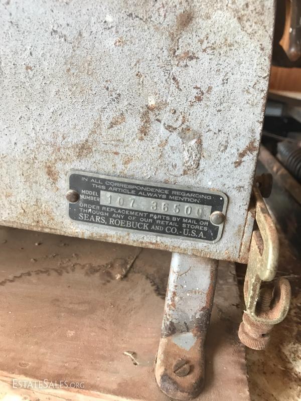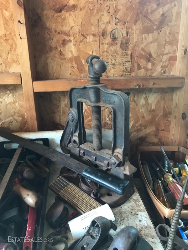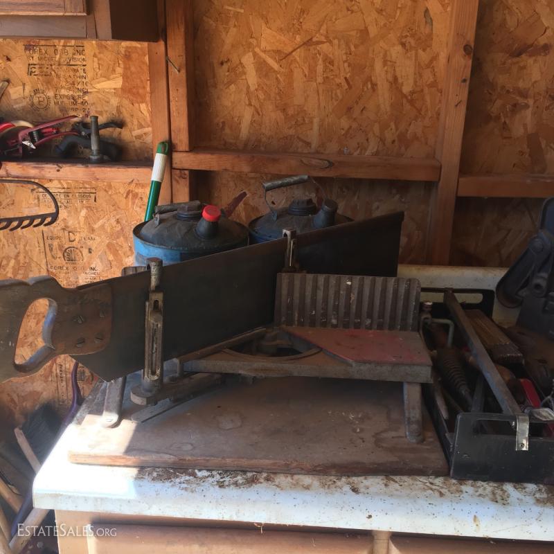 Old time table saw and mounted camp marked "No.73 Pat. Aug 11, 1914" other smaller items to include hand planers, oil can, gas cans, knife and a few more. See pictures. Items available for local pick up only in Columbus, NC