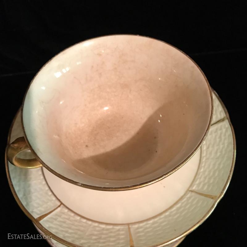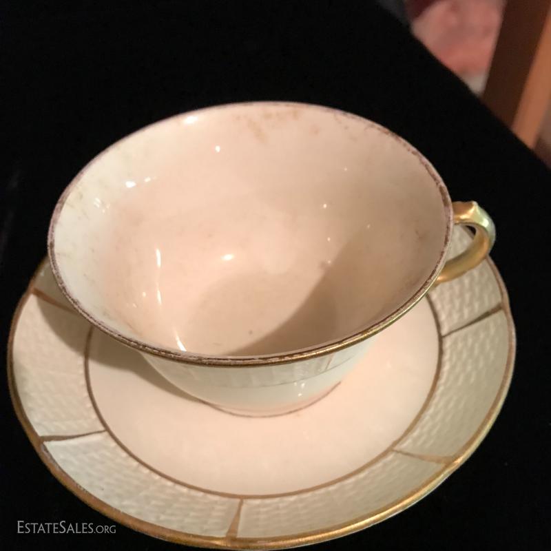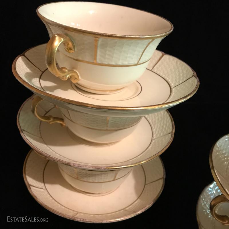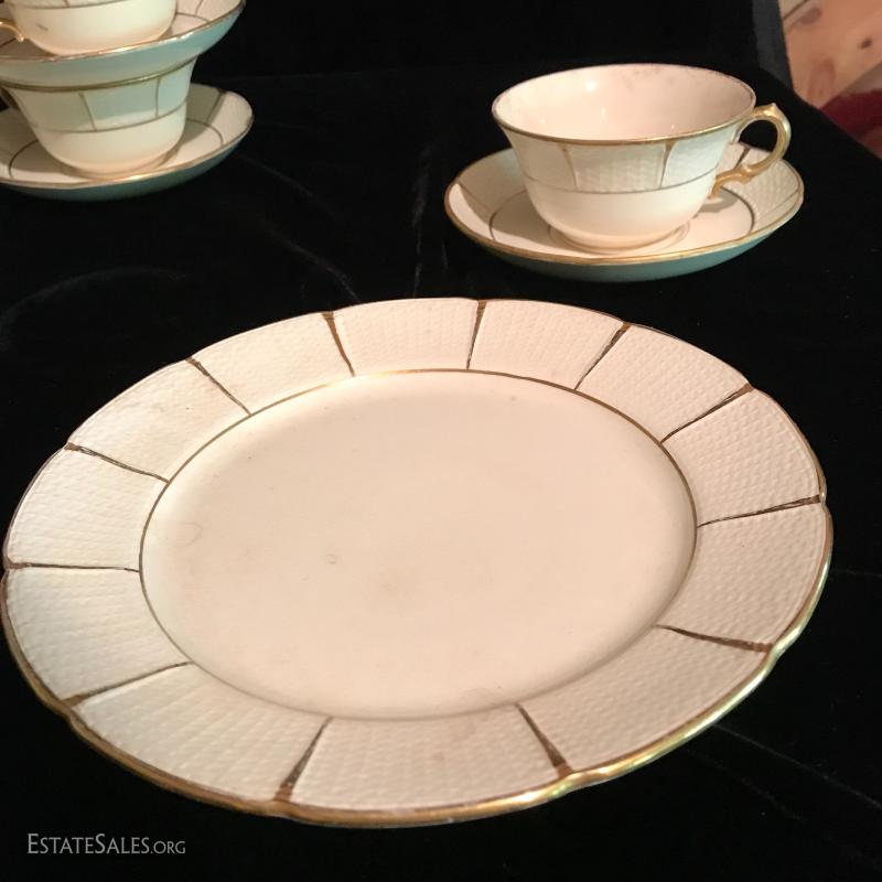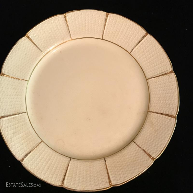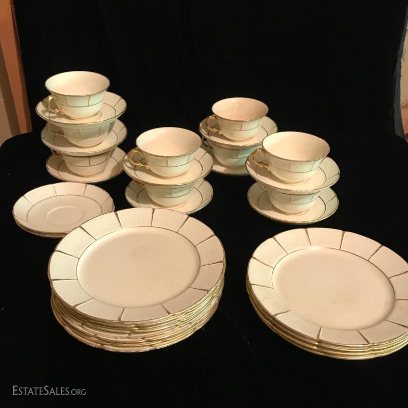 12 lunch plates, 8 tea cups and saucers and 3 extra saucers. Cream color with gold accent. Some glaze cracking. See photos for details. This lot is available for shipping or local pick up in Flat Rock, NC.