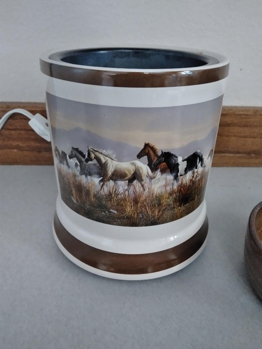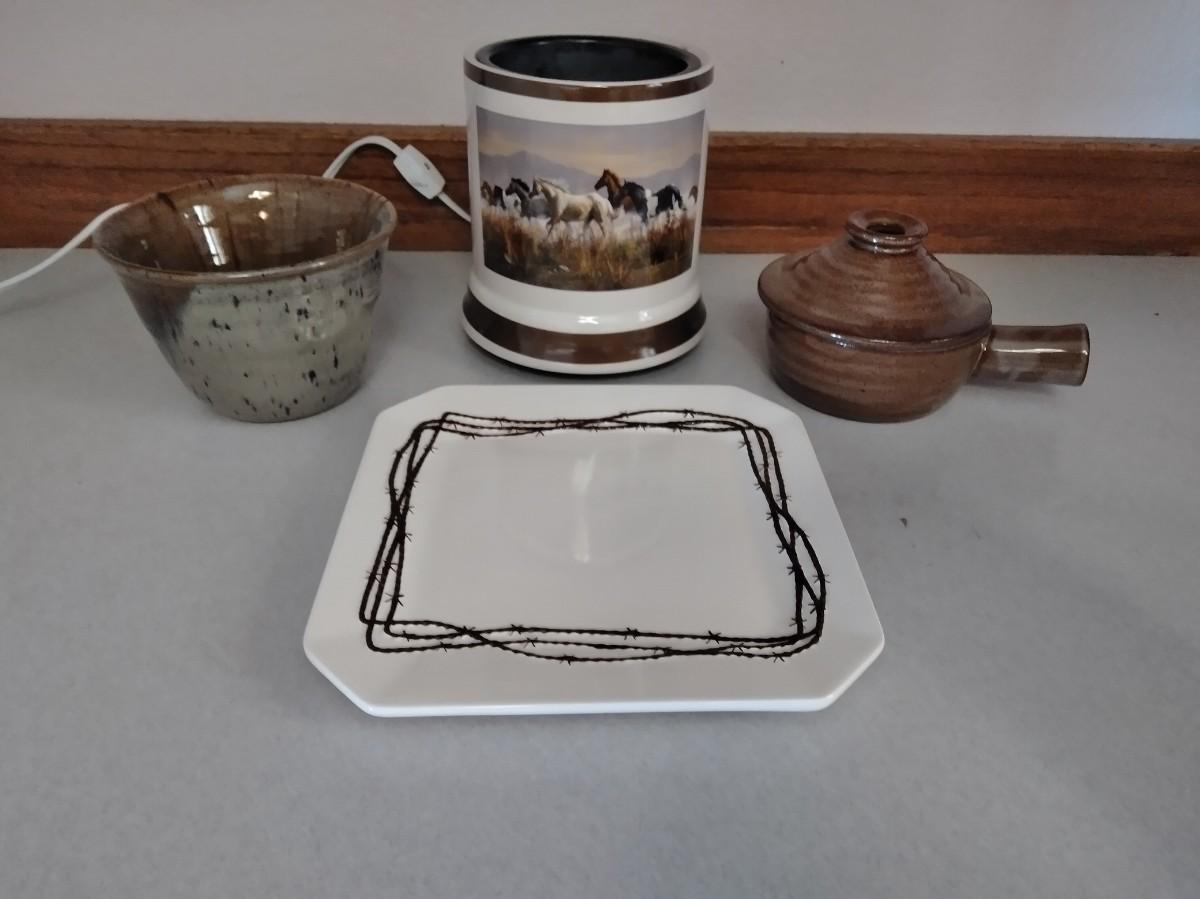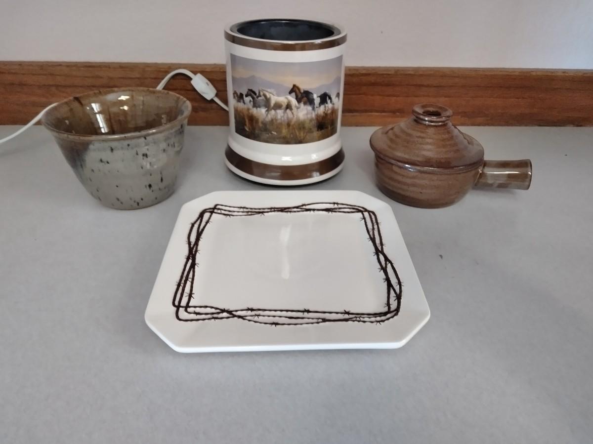 PLATTER WITH BARBED WIRE DESIGN, HORSE WARMING POT (candles?) POTTERY HANDLED DISH WITH LID, AND A SMALL POTTERY BOWL
