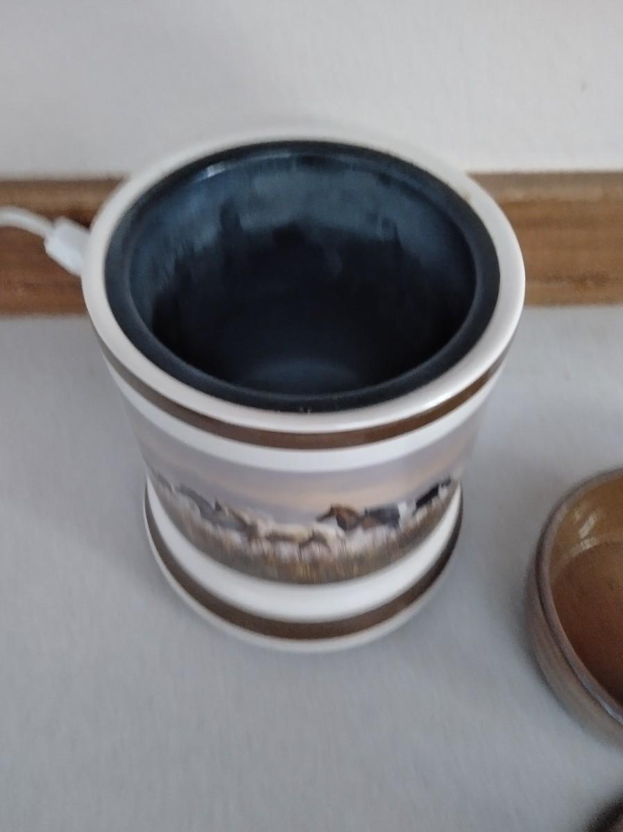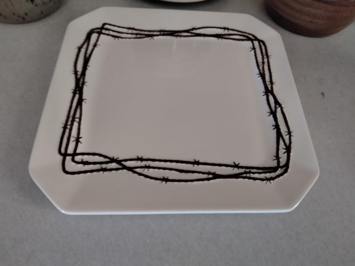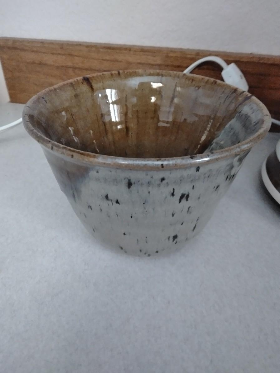 PLATTER WITH BARBED WIRE DESIGN, HORSE WARMING POT (candles?) POTTERY HANDLED DISH WITH LID, AND A SMALL POTTERY BOWL