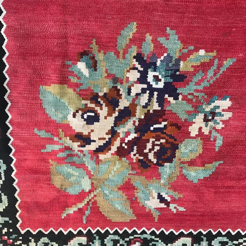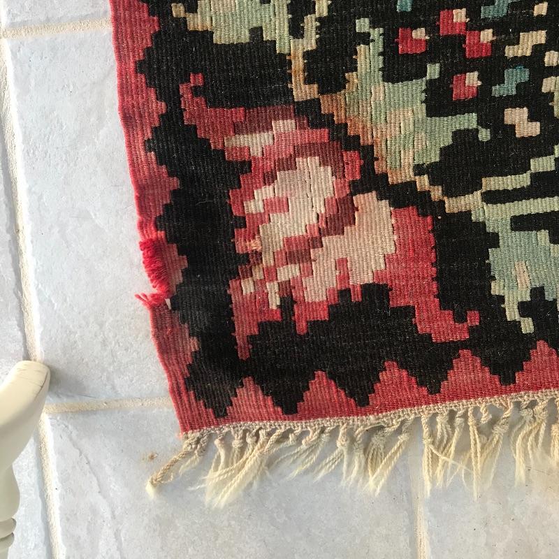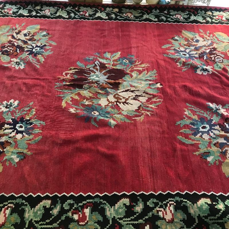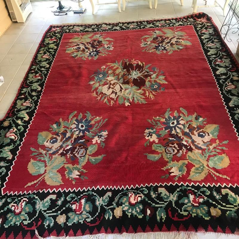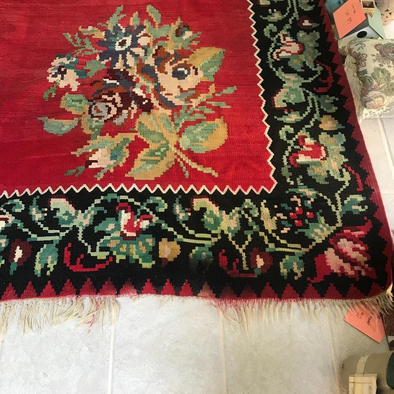Rich reds, greens, blues and black adorn this attractive and vibrant fringed area rug. This nice rug is in great condition. Two spots on the edges that could be mended, see photos. Rug measures 98”x138” including fringe. Local pick up only.