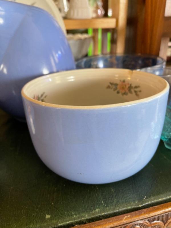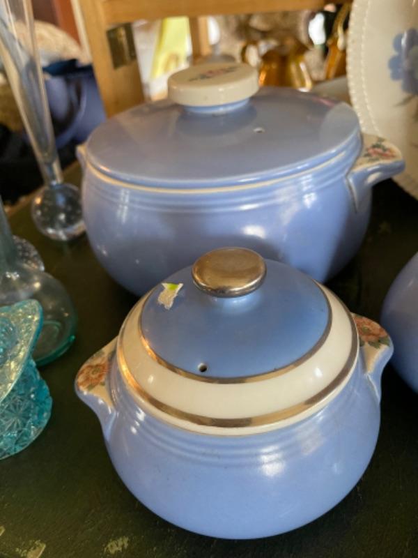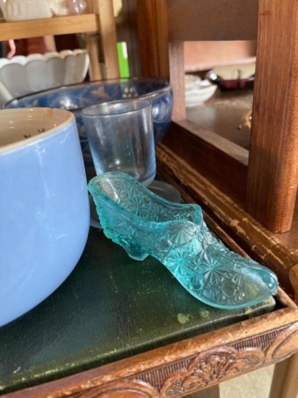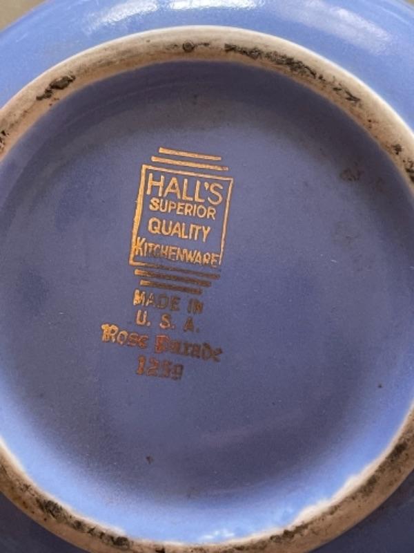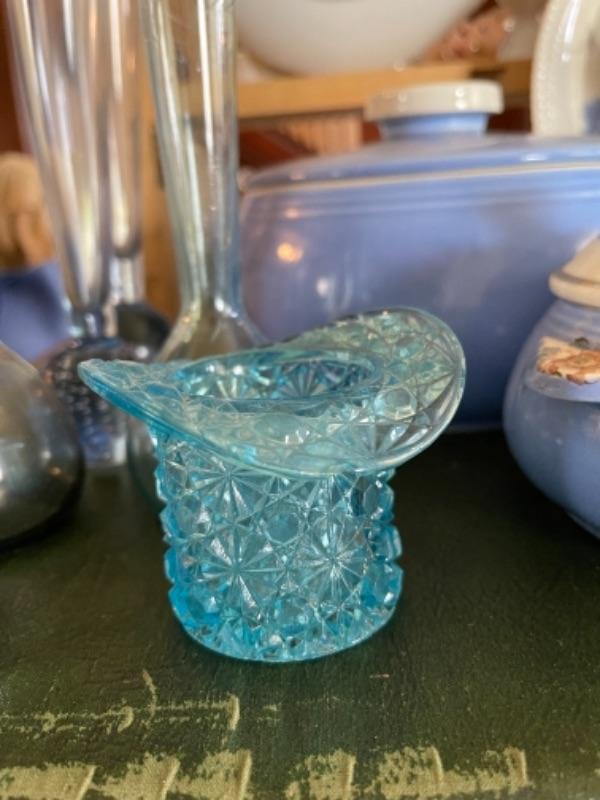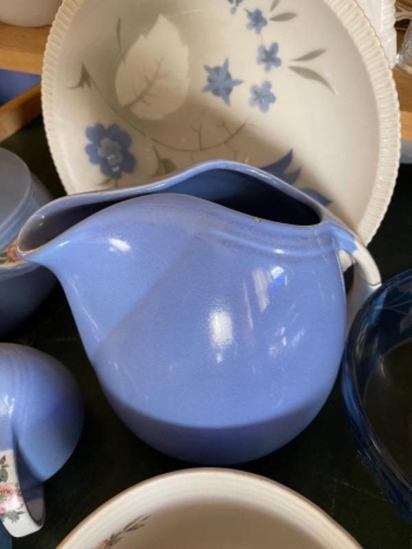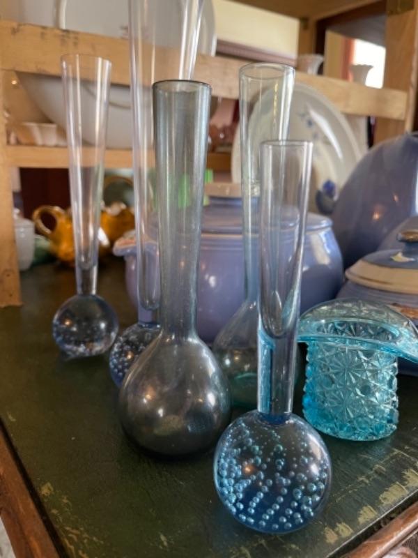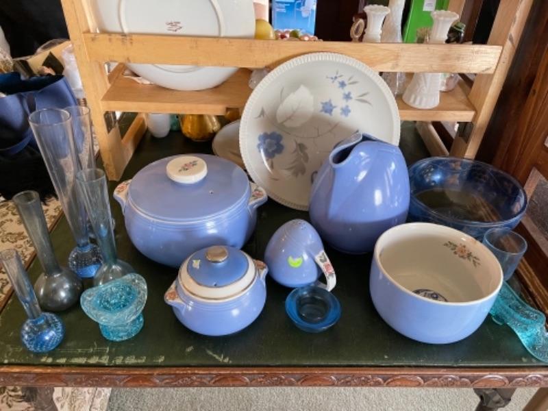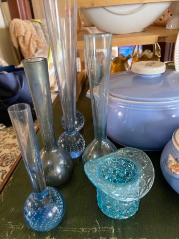 Lot 17L. Collection of blue glassware, 5 bud vases, Hall blue ceramics, blue plate, etc.--$95