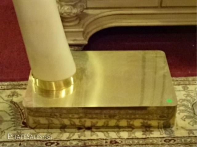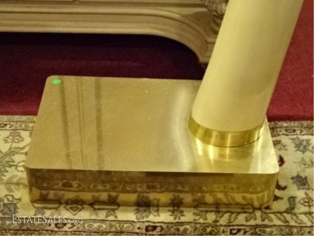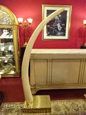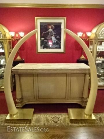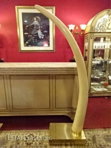 LOT 17D: PAIR MONUMENTAL CARVED WOOD TUSKS, ENAMELED FINISH, POLISHED BRASS RECTANGULAR BASES, VERY GOOD CONDITION WITH ONE SMALL CRACK IN ENAMEL OTHERWISE EXCELLENT, 73"H, BASES MEASURE 21" X 14", SKU391.01