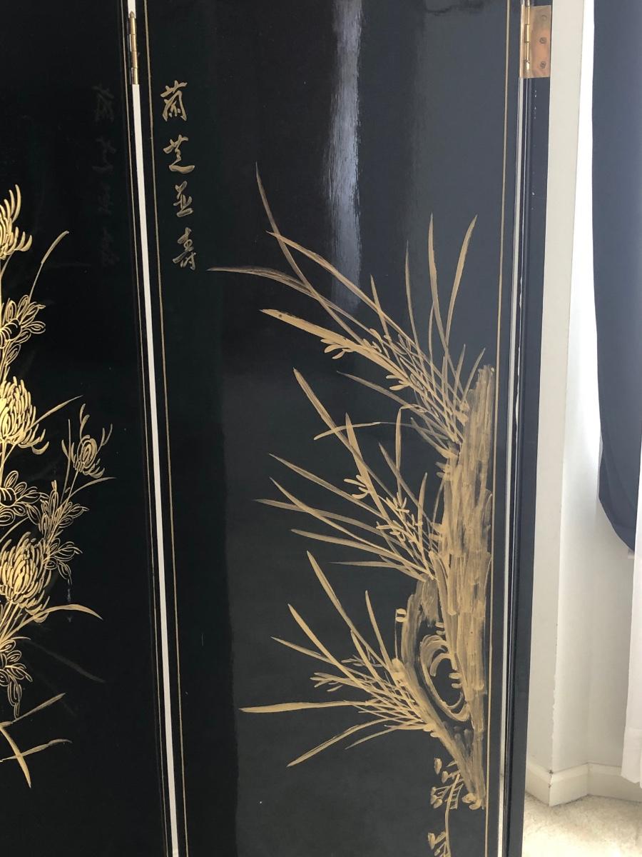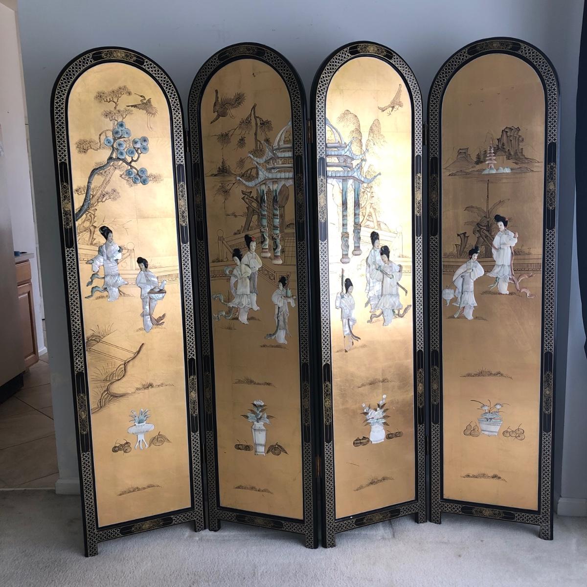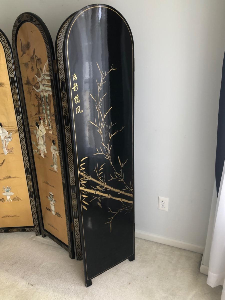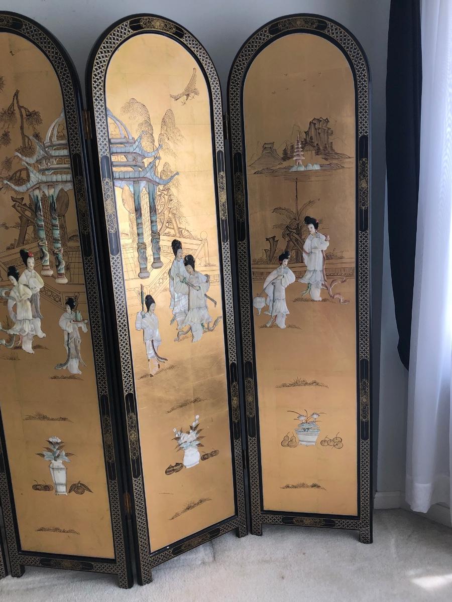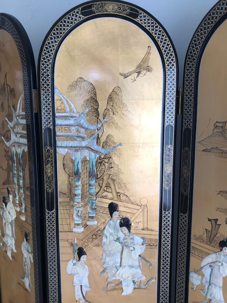 LOT 17G: Gorgeous Mid-Century Asian Folding Screen / Panel Divider w/ Iridescent Carved Accents