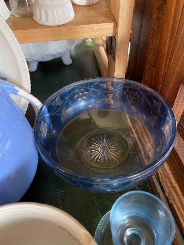 Lot 17L. Collection of blue glassware, 5 bud vases, Hall blue ceramics, blue plate, etc.--Was $95 - -NOW $48
