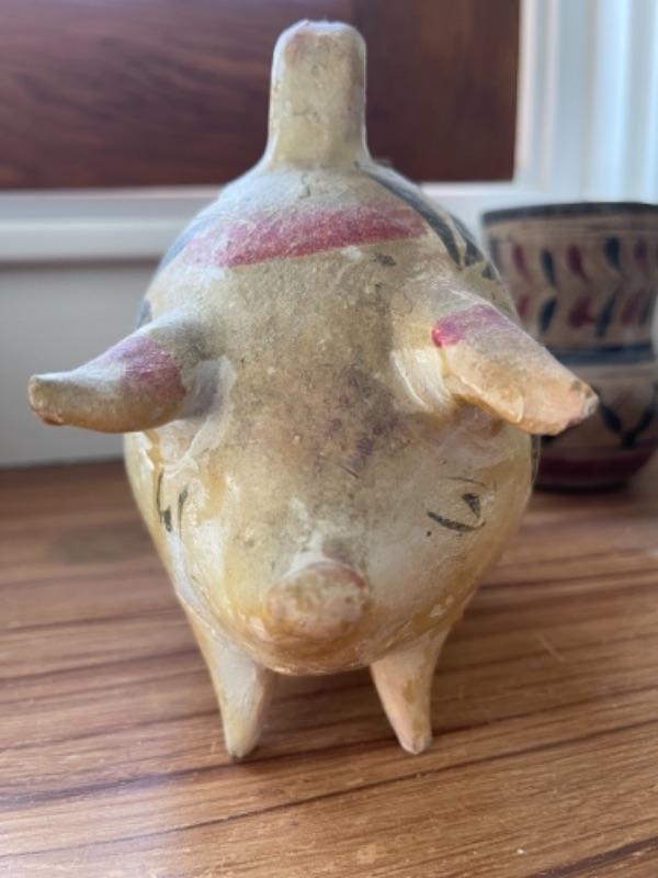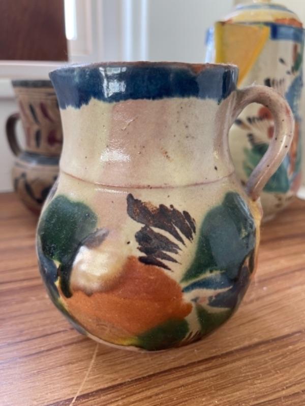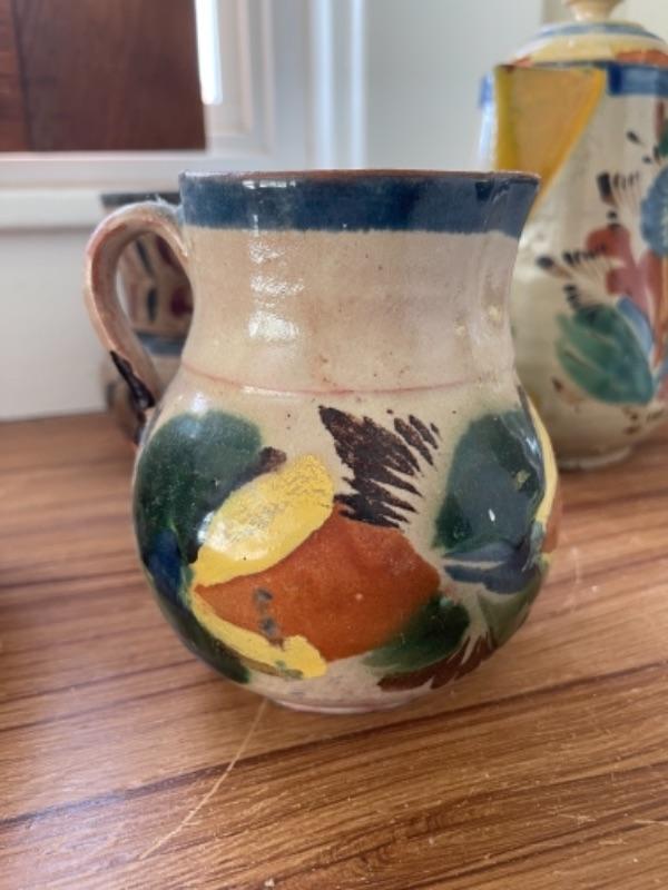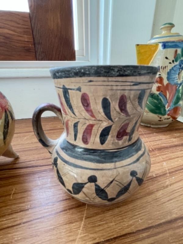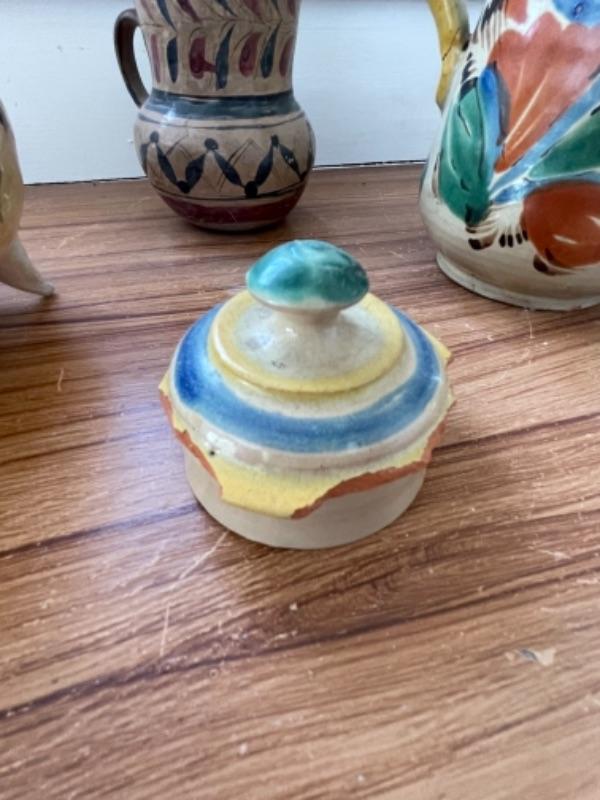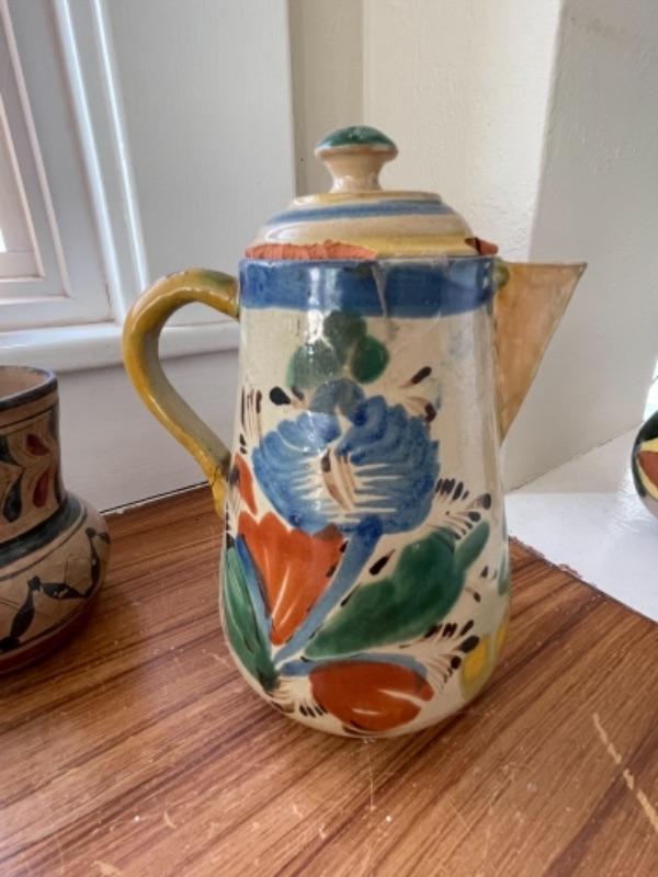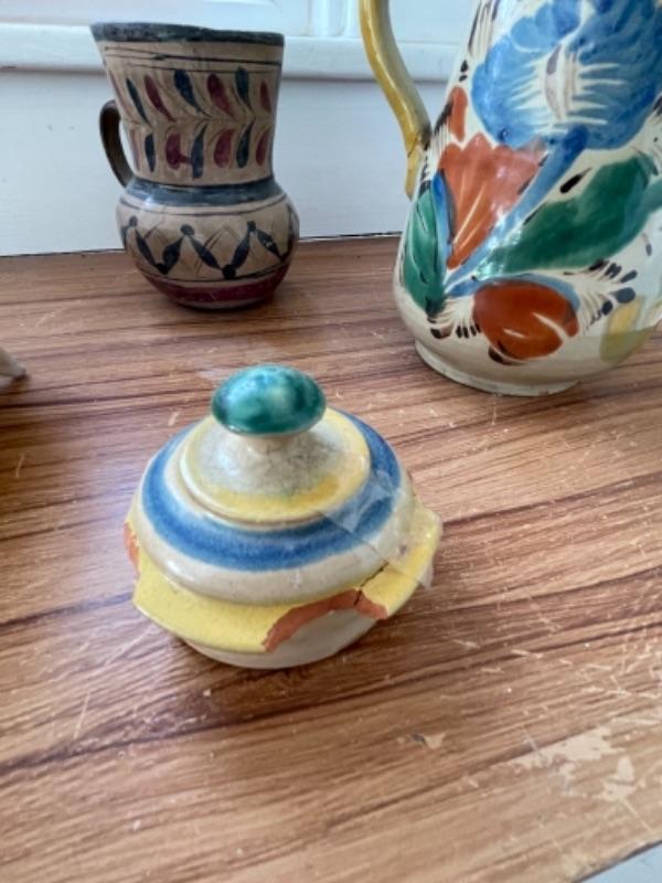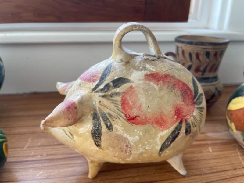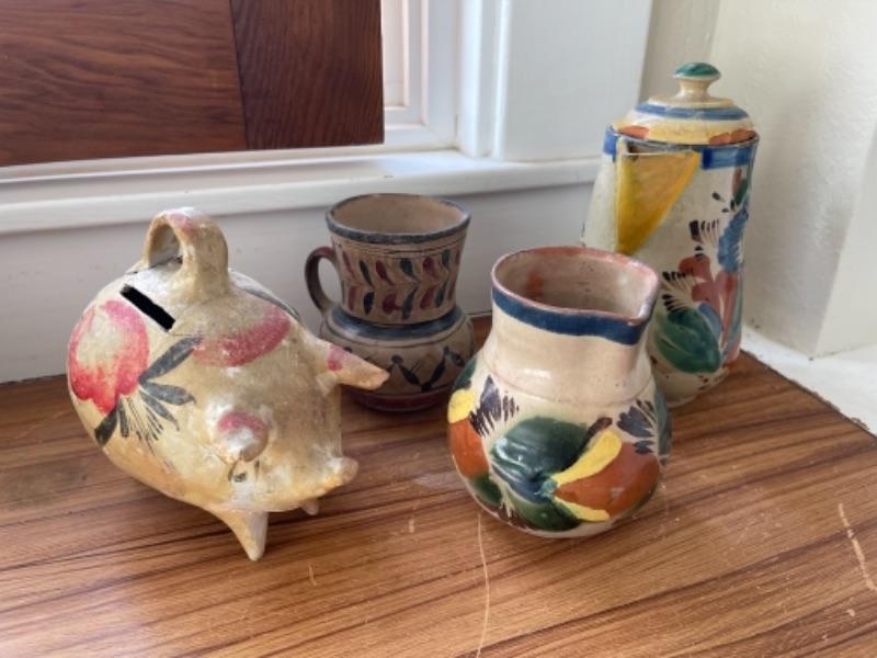 Lot 17LD. Ceramic Mexican folk art“”2 pitchers, one tea/coffee pot and one piggybank--$45