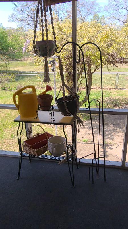 Lot 17P: Plant Stand, Shepard's Hooks, Planters and More