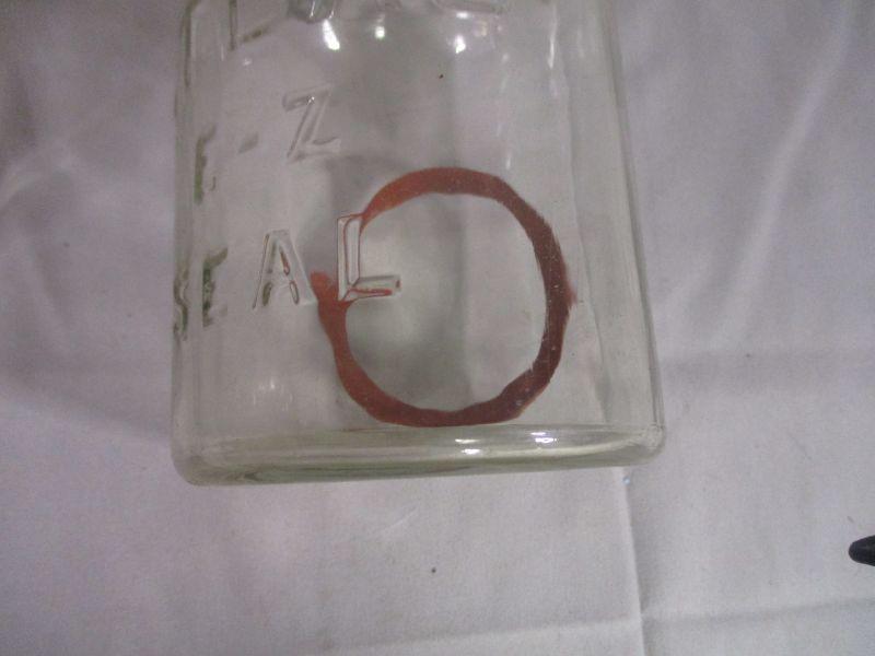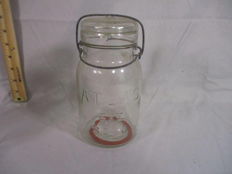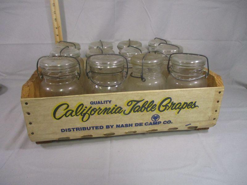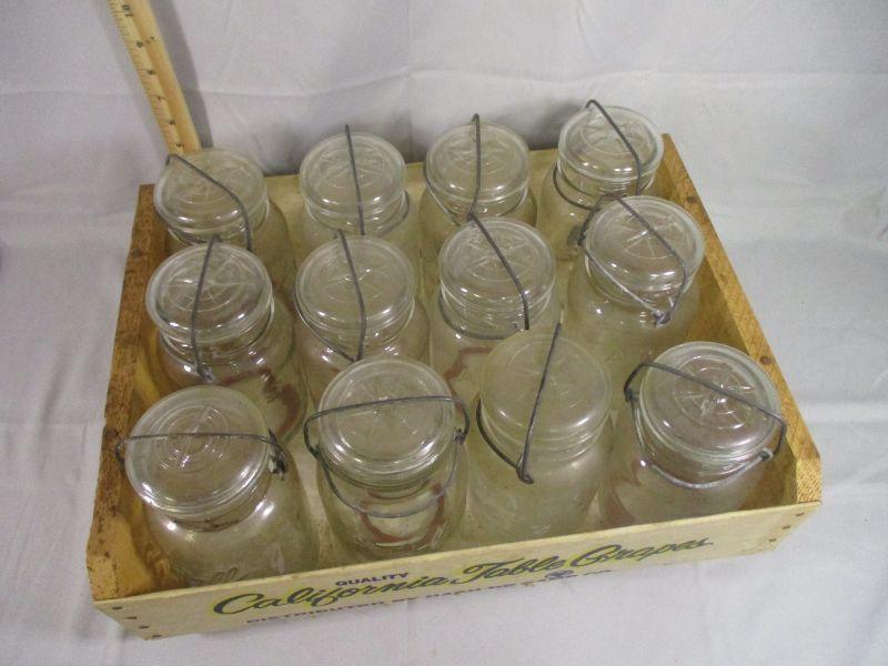Eleven of these are Atlas, one is Ball. The Ball jar is from 1910-1923 based on the logo. (10) of the Atlas jars seem to be identical, but one has a flat, squared off bottom and I believe that this one is older. The others have a rounded bottom. All are in excellent condition. The crate (wood base with heavy cardboard sides) is included.