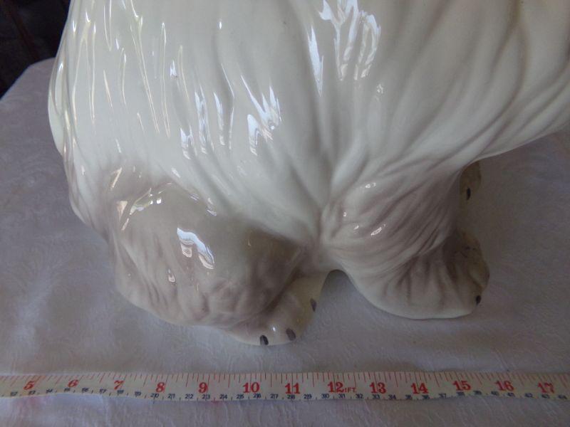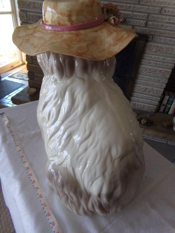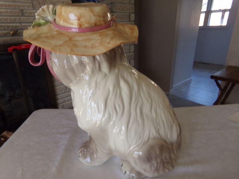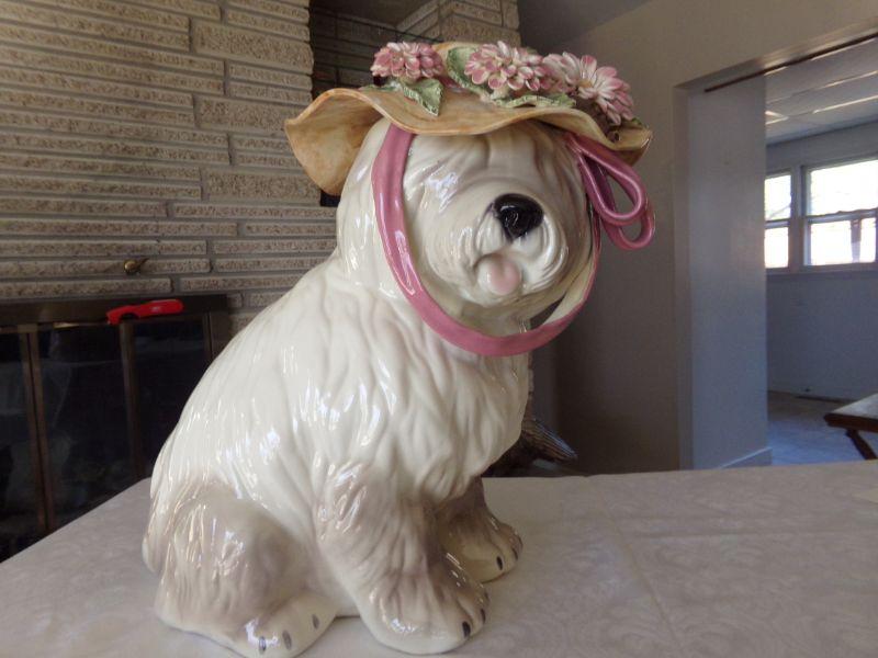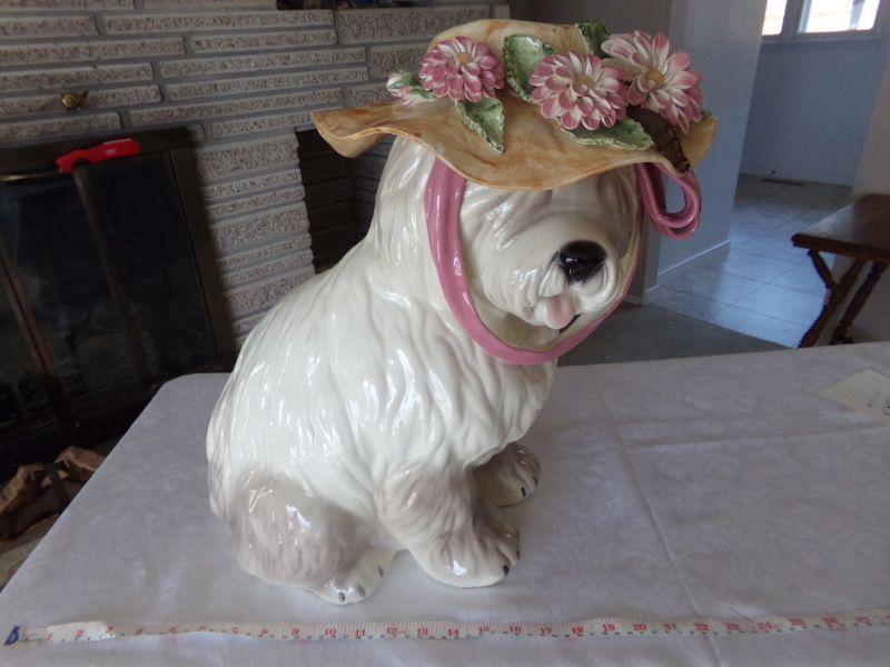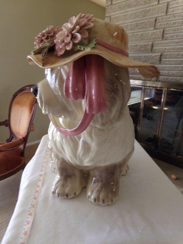 CUTE DOG STATUE THAT HAS A HAT ON WITH PRETTY PINK FLOWER DESIGNS. IN GOOD CONDITION.
