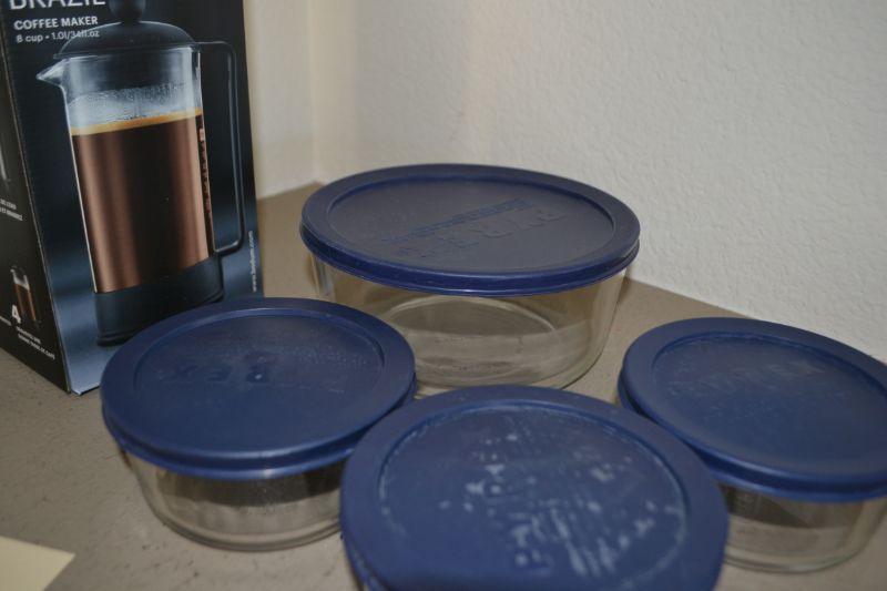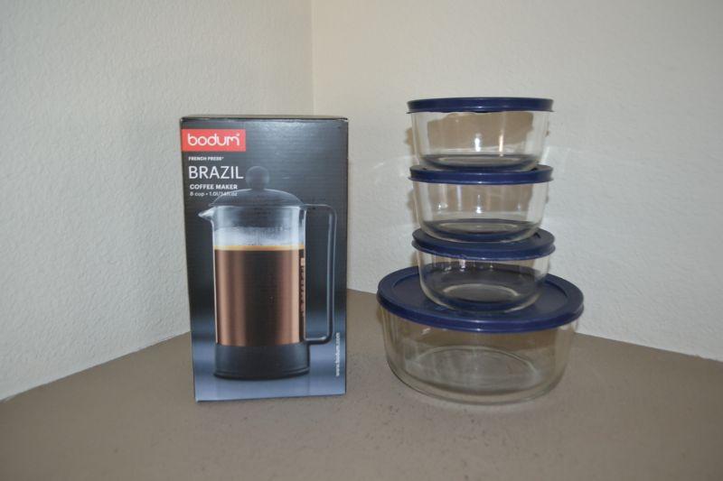 LOT 18 BODUM FRENCH PRESS COFFEE MAKER AND PYREX BOWLS