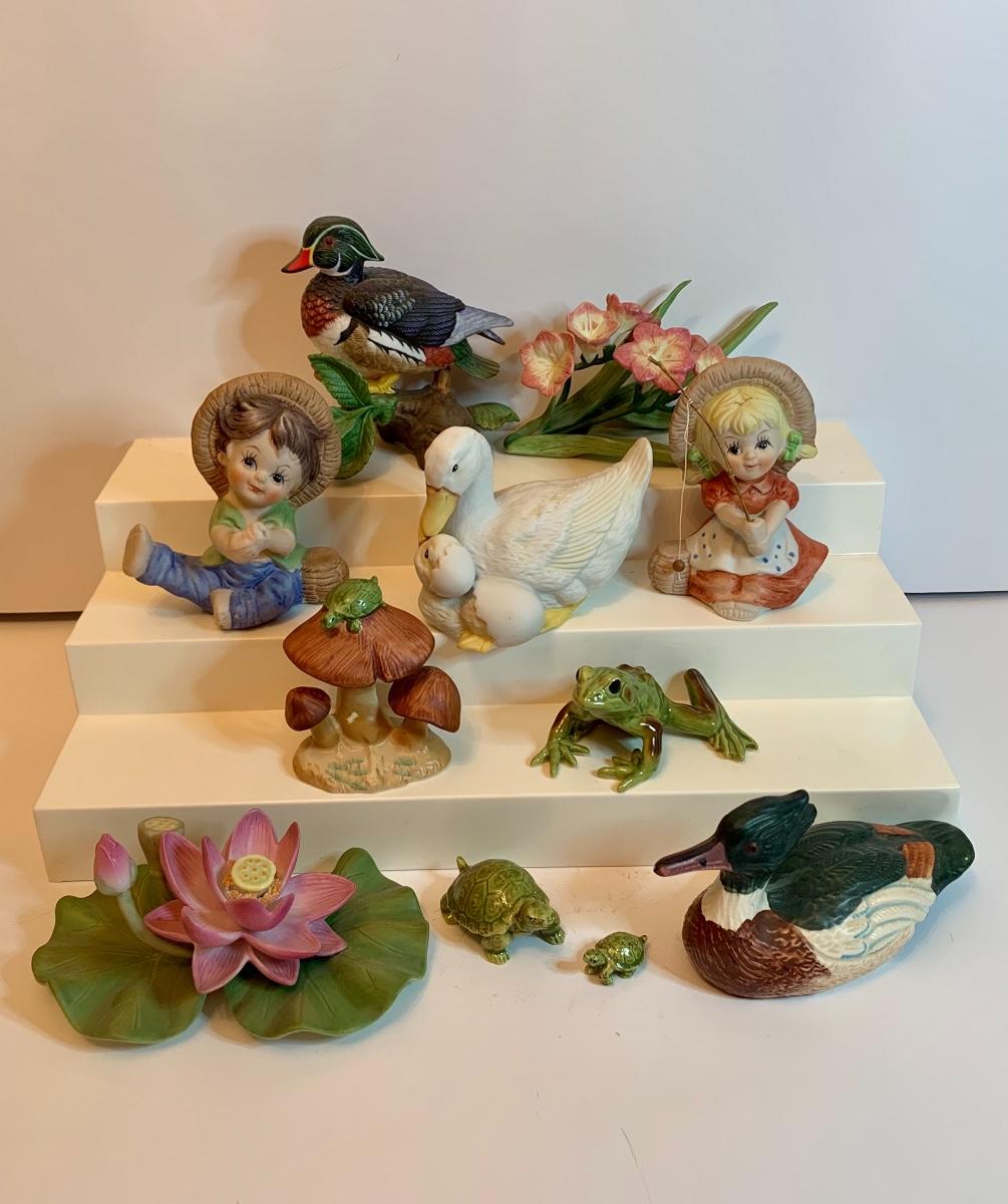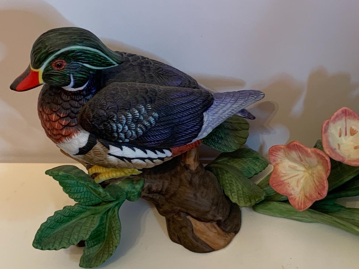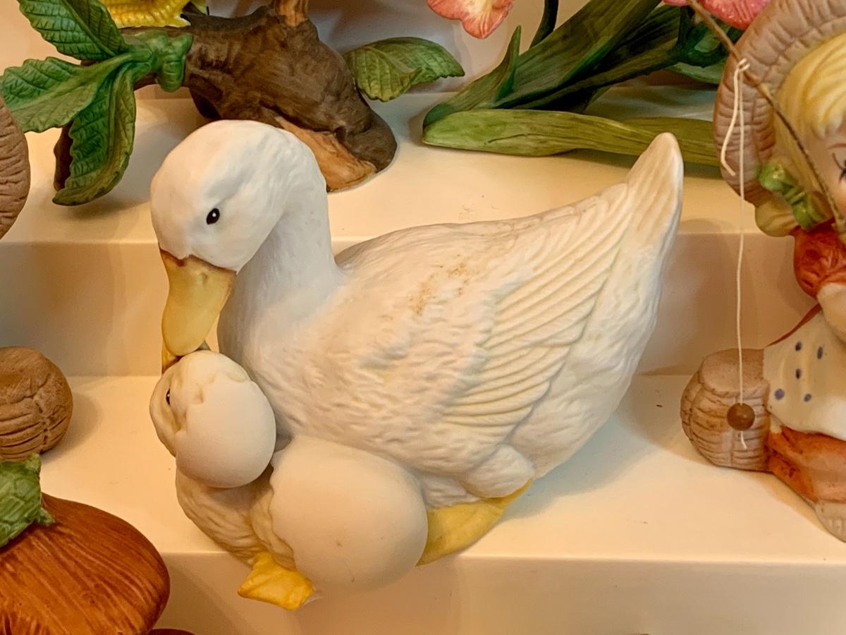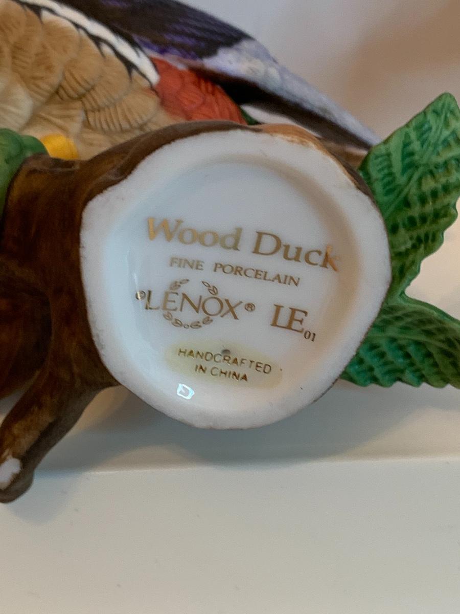 Fine porcelain collectibles: including Lennox Flowers, Weiss Hand Painted porcelain duck, Lennox Wood Duck, Lefton Mushrooms ( has to imperfections as pictured), no boxes with this collection.