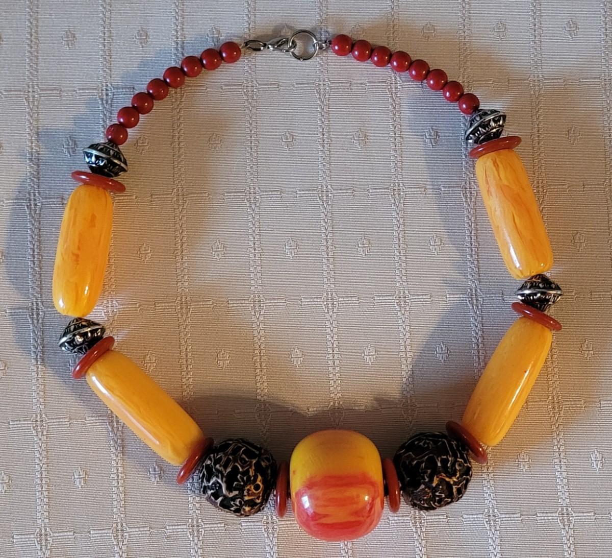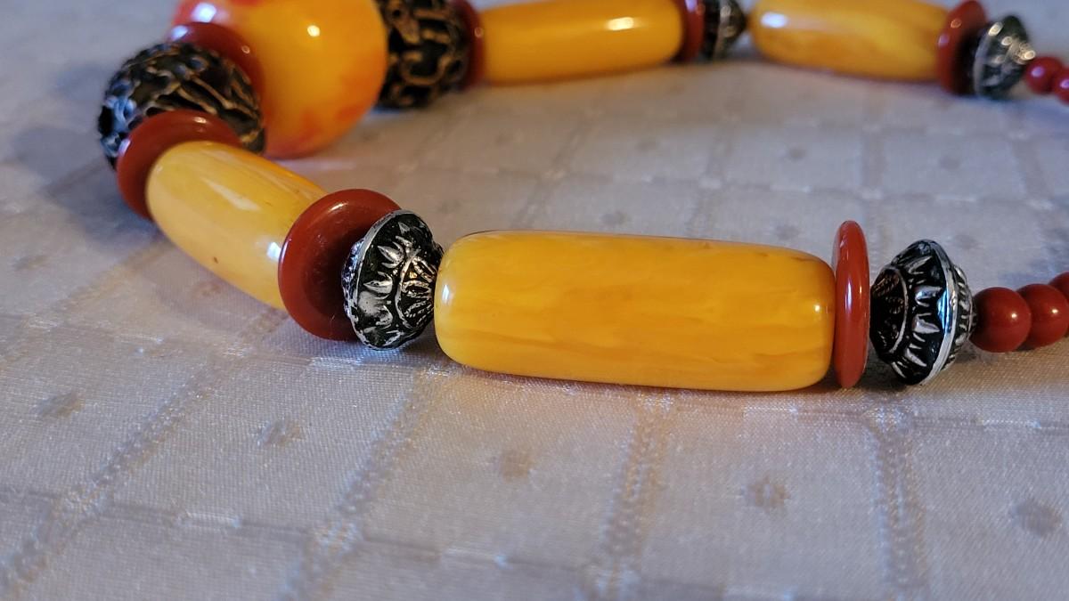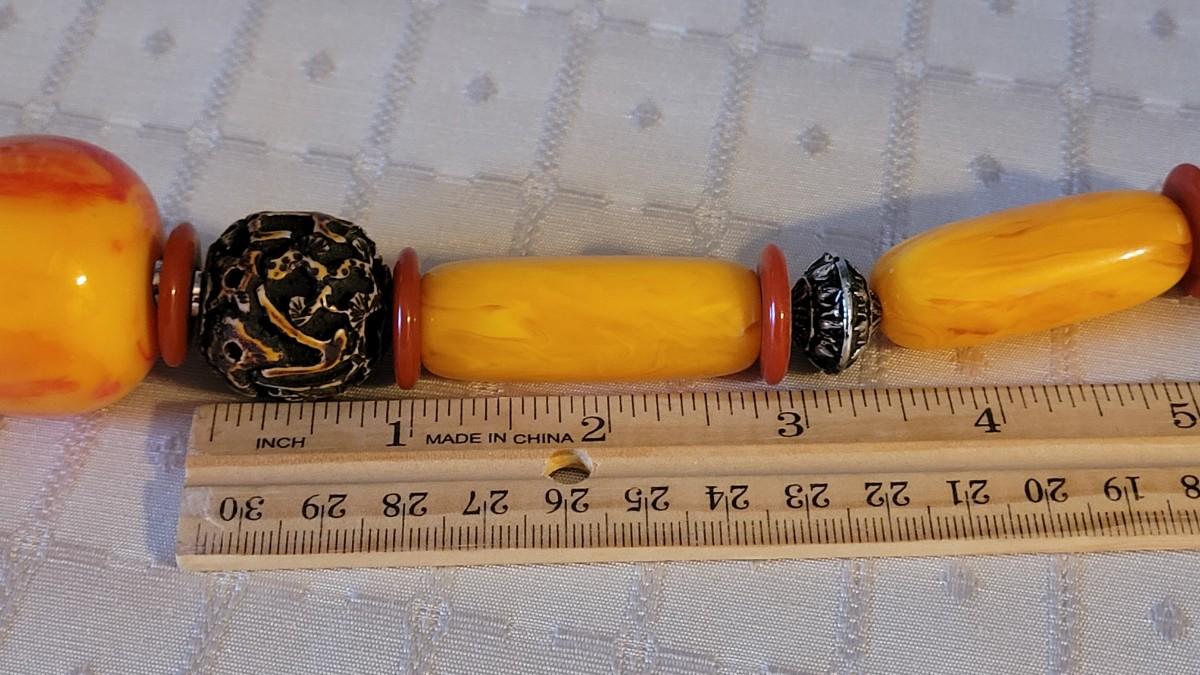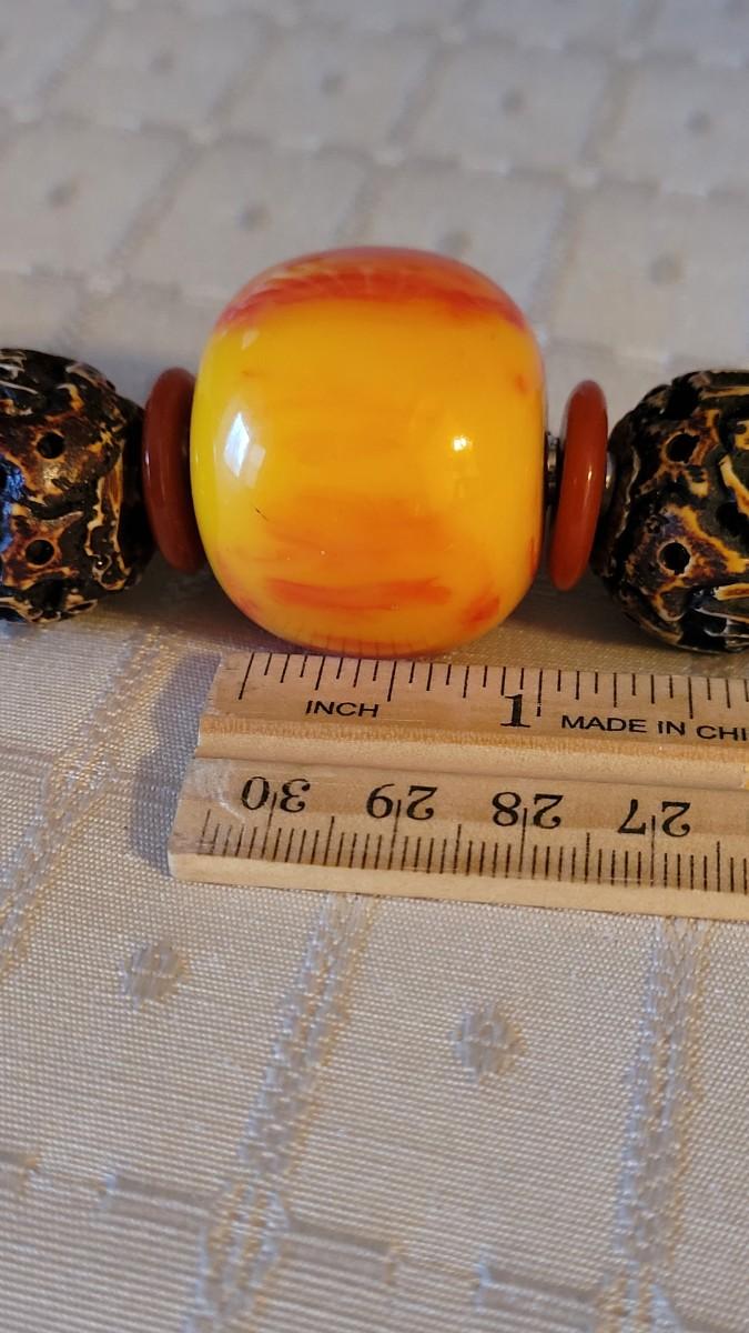 African Copal Amber beads with carved fruit pit (possibly) beads, metal beads and red beads (plastic?)