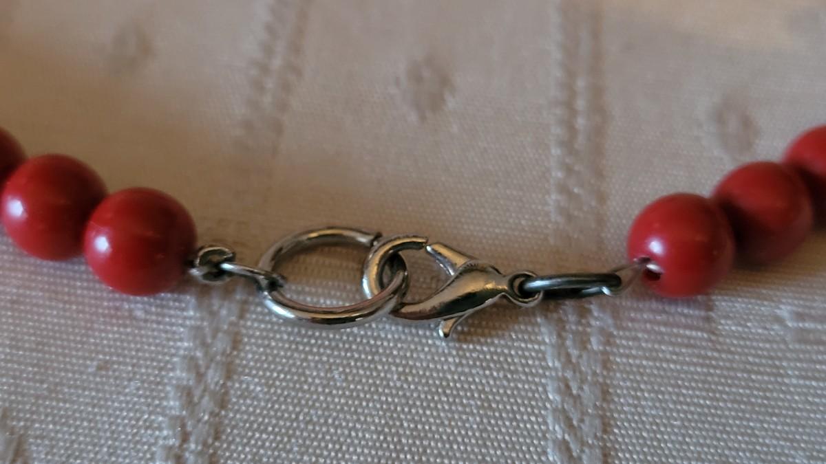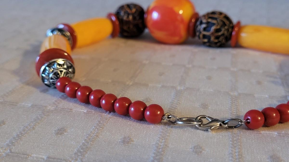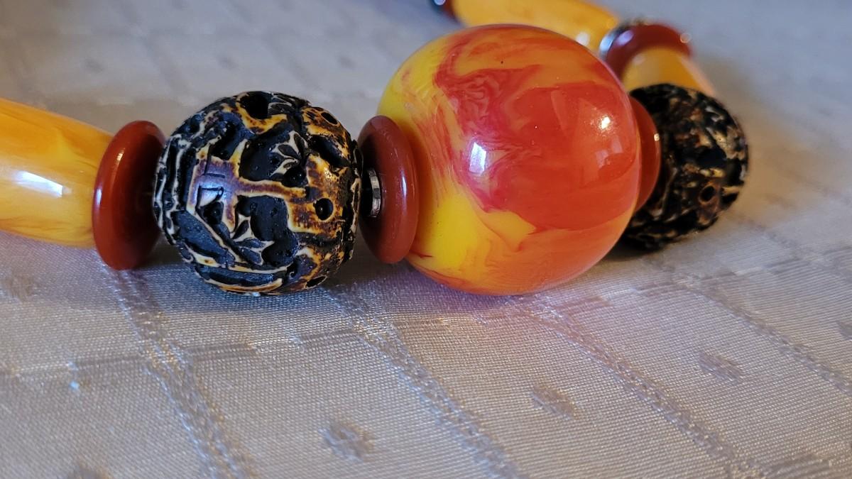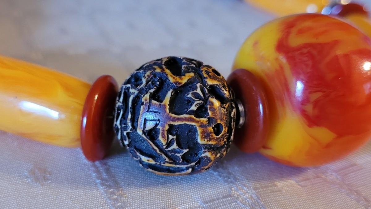 African Copal Amber beads with carved fruit pit (possibly) beads, metal beads and red beads (plastic?)