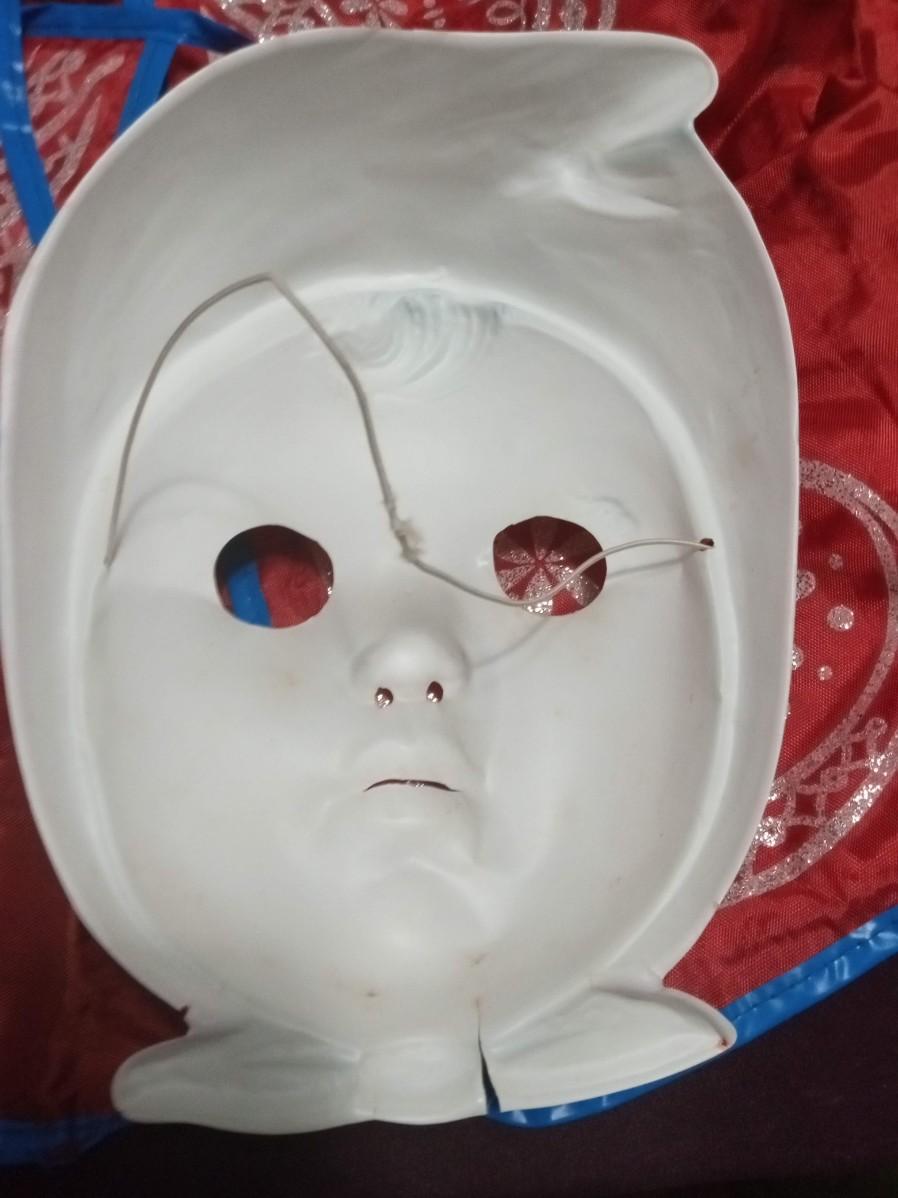 THE BOX SHOWS WEAR, THE COSTUME HAS SOME MARKS FROM BEING FOLDED FOR SO LONG AND THE MASK IS SLIGHTLY DENTED INWARD AND STARTING TO CRACK (SEE PICS)