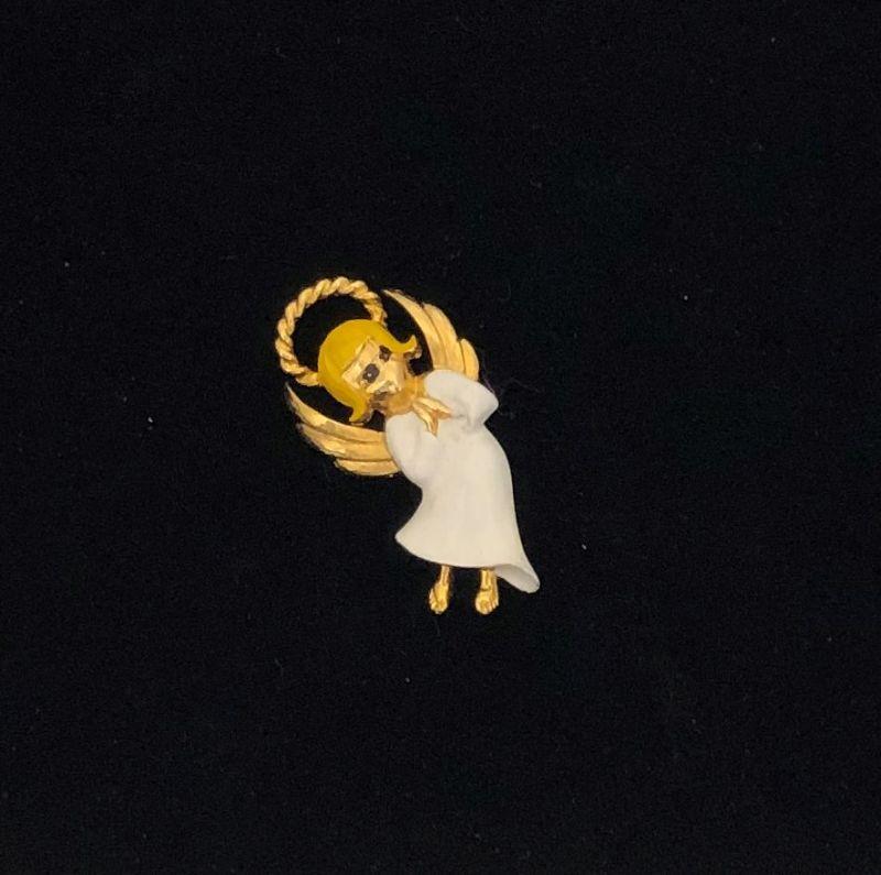 Don't we all need an angel on our shoulder these days? This one is in excellent condition and is enamel painted with a white dress, dark eyes, and yellow hair.