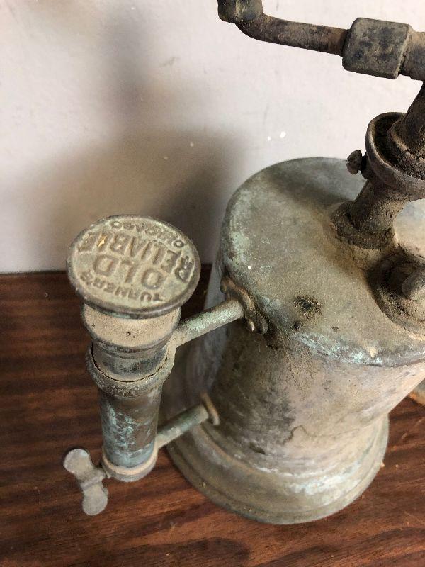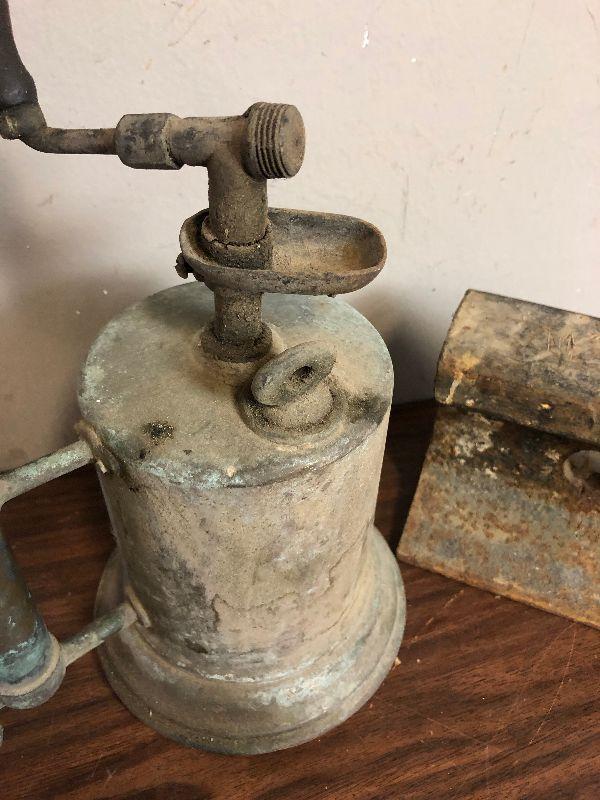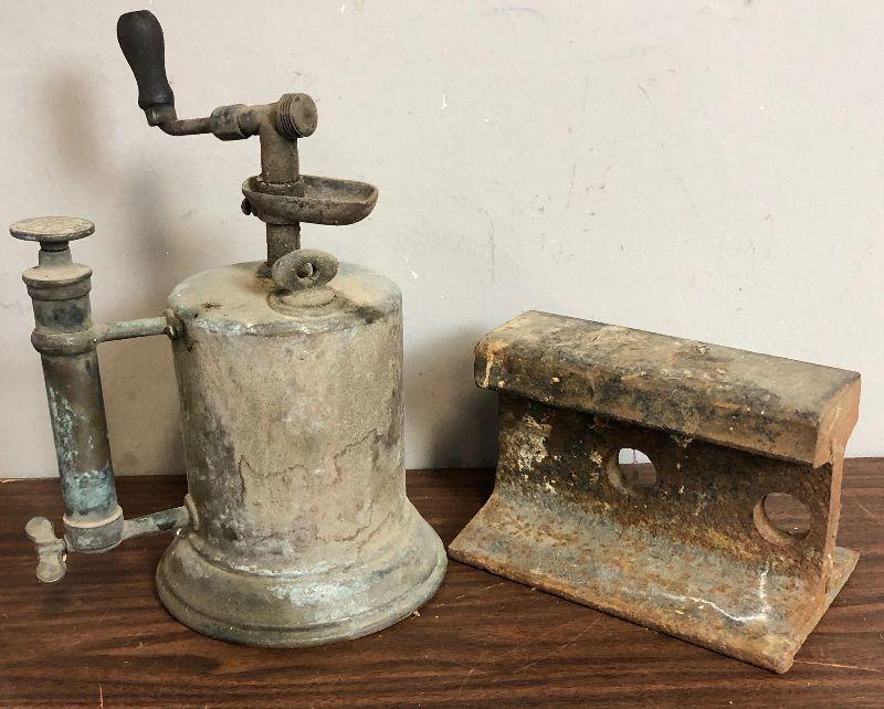 Lot # 18 Antique Blow Torch and Chunk of 7" Piece of Rail Tie