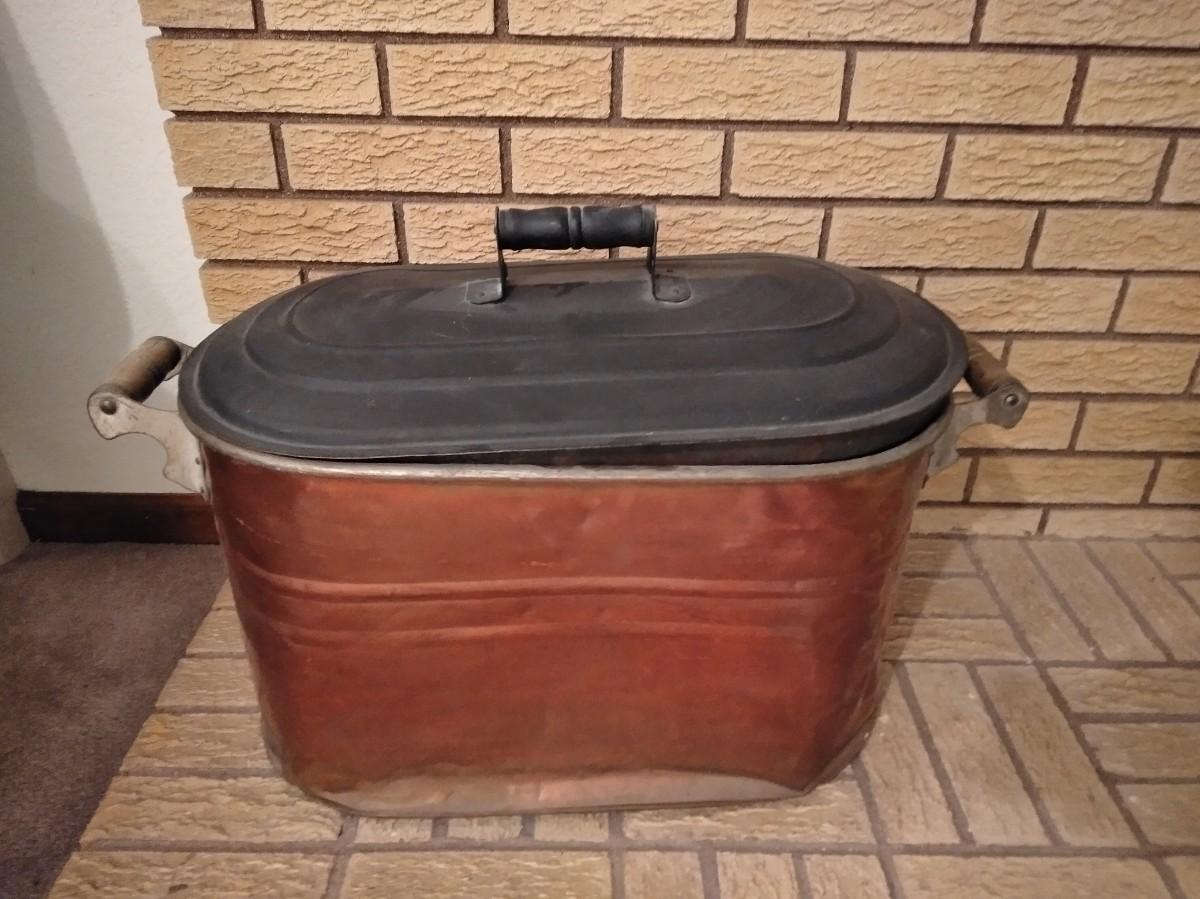 ANTIQUE COPPER BOILER WITH LID 13" X 12" X 21" HAS A DENT IN THE BOTOTM OF ONE SIDE