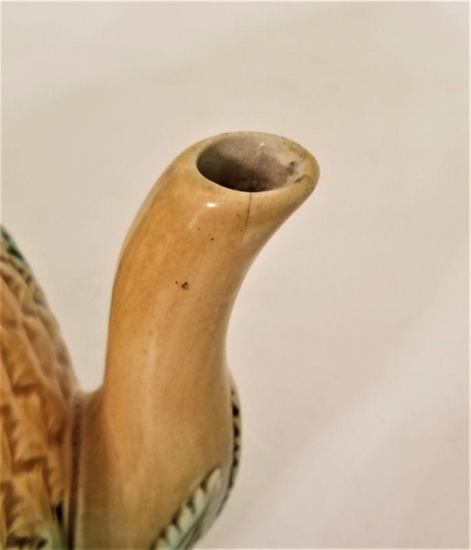 This 19th century majolica beauty will be a great addition to your collection. Beautiful detailing, perfectly usable. Stands 7" tall. There is a small hairline crack at the spout (see photo) and an old chigger bite underneath (does not show when displayed).