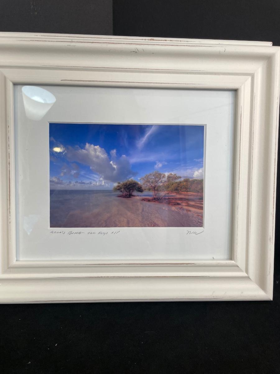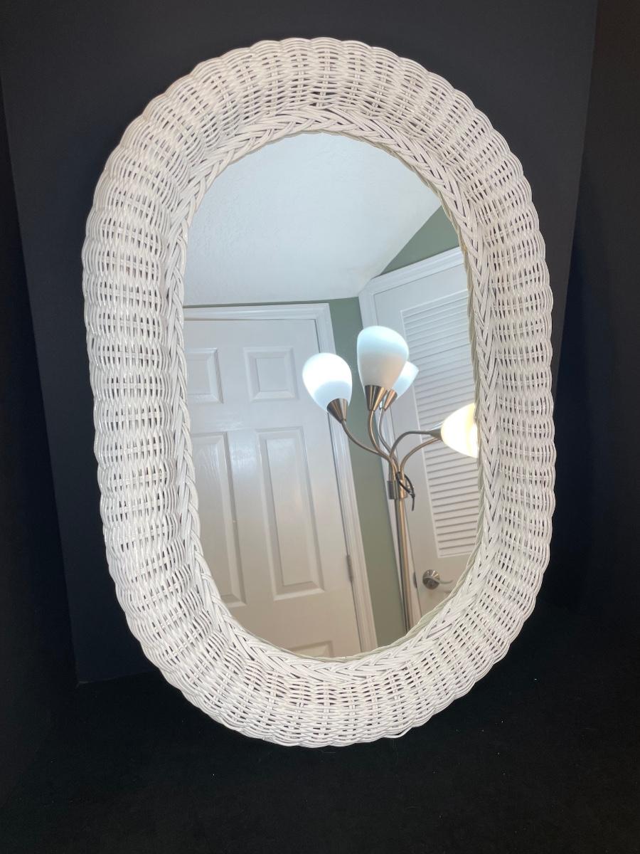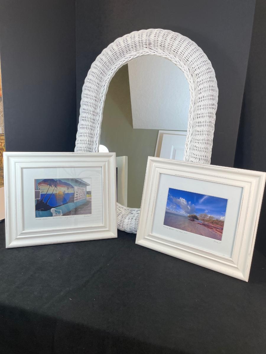 White wicker mirror (20" x 28") and a pair of framed beach scene photographs