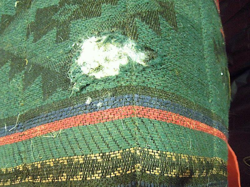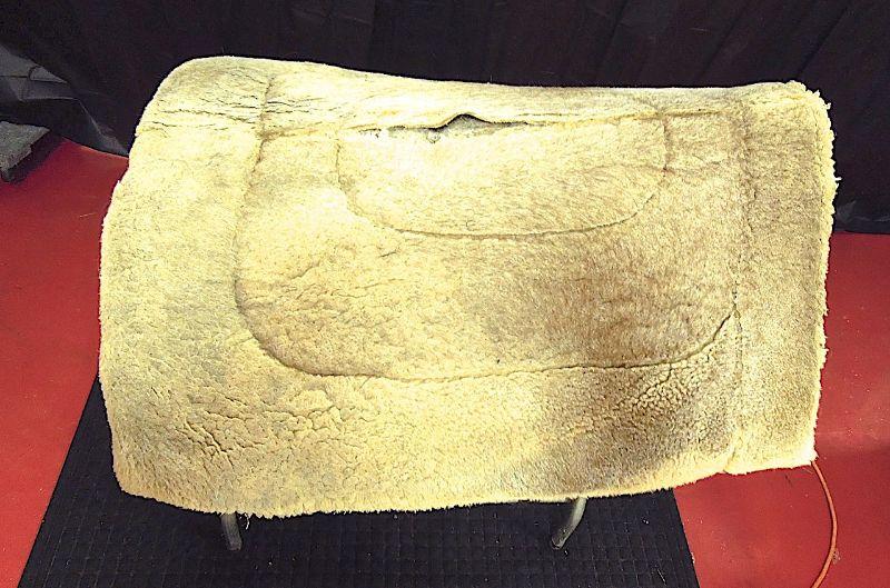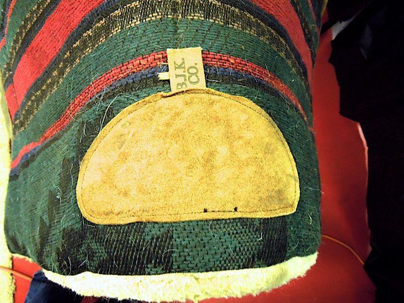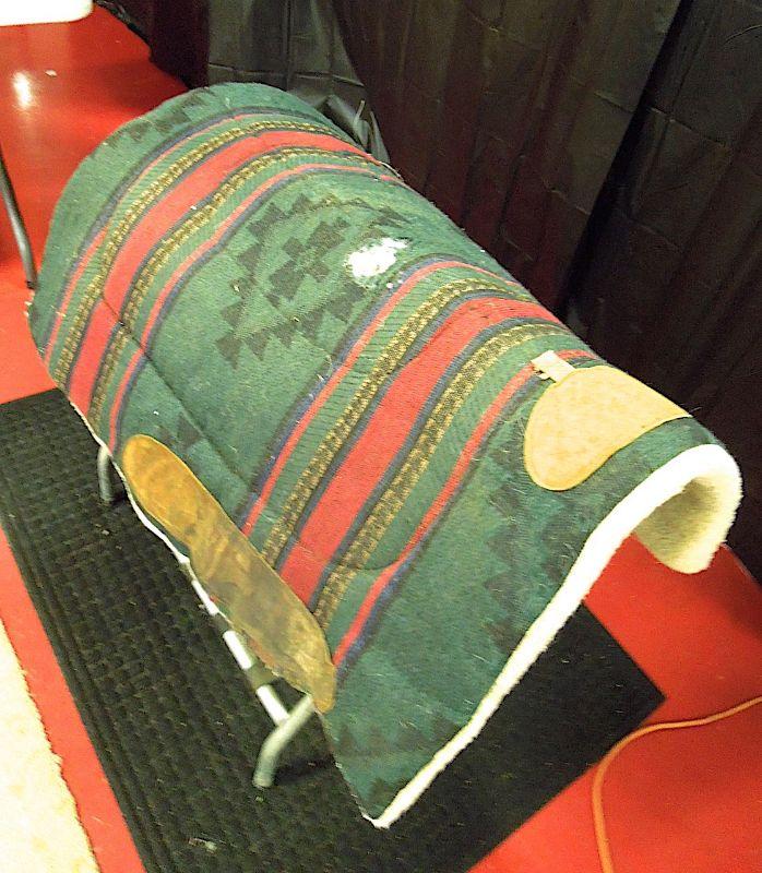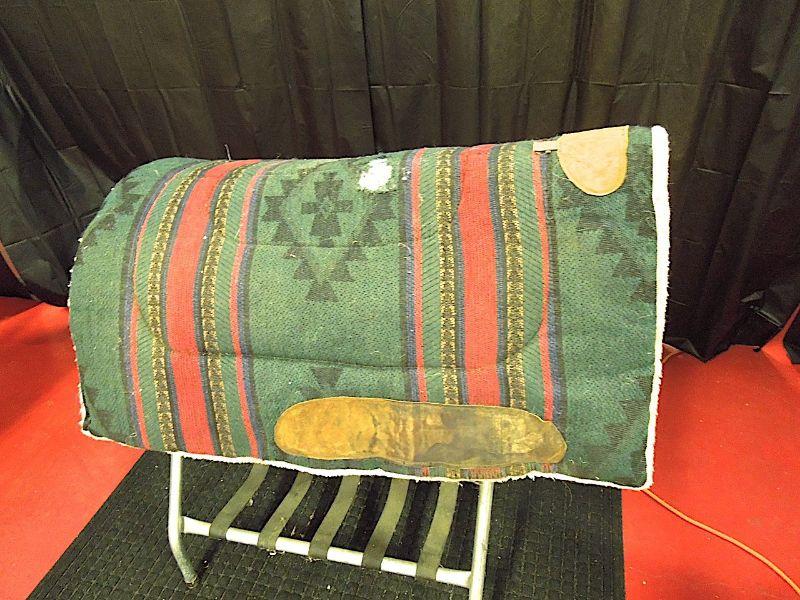 Handsome navaho banded design This cotton nylon blend cover saddle pad by BJK has an area that needs repair on top side where batting is showing through. Suede leather stirrup pads and front. Underside fleece is splitting along mid seam. Needs cleaning. Looks great on a horse and western saddle.